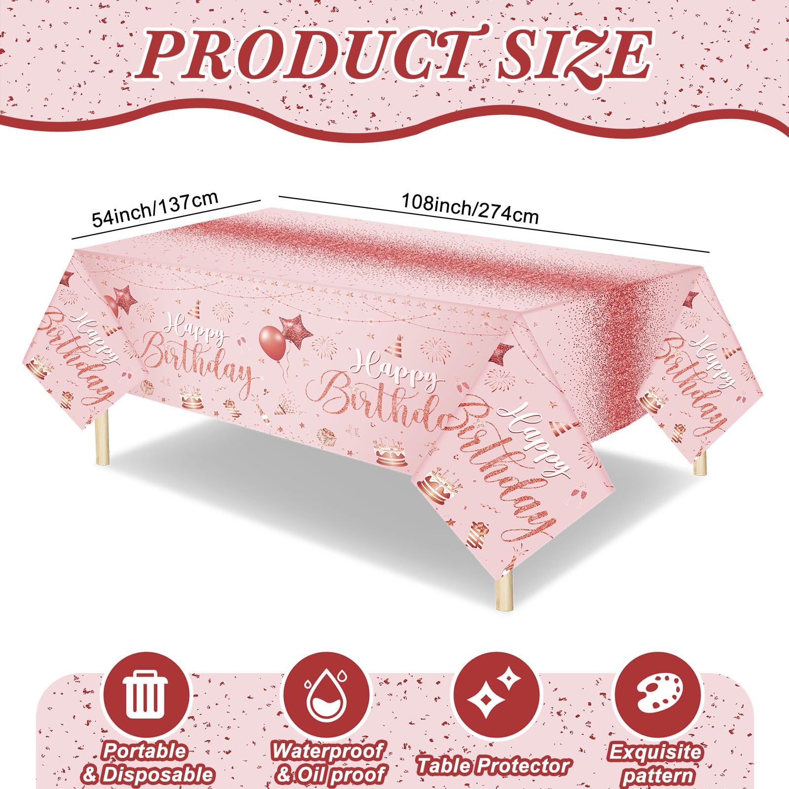 Size Information: our pink rose and gold disposable tablecloth measures about 54 x 108 inches/ 137 x 274 cm, large enough to cover most rectangular tables, and can also serve as mats for picnics