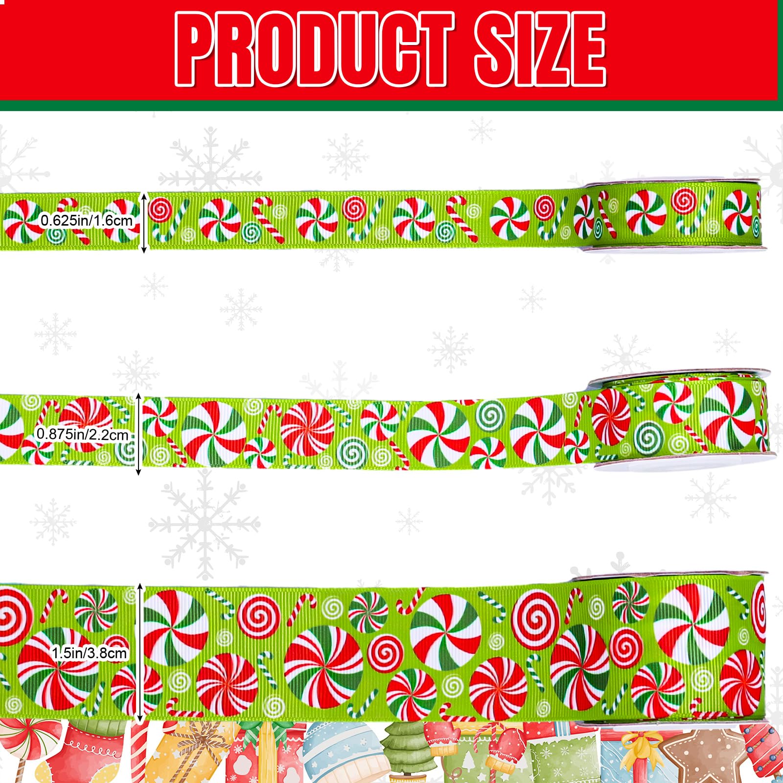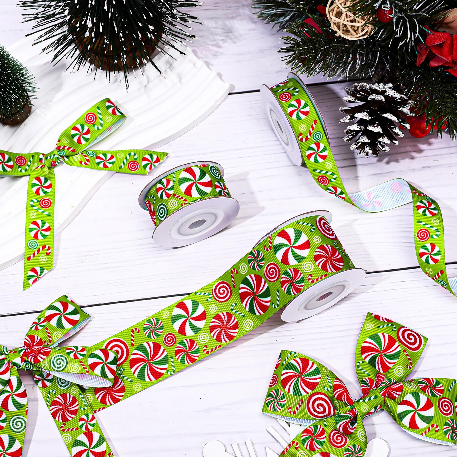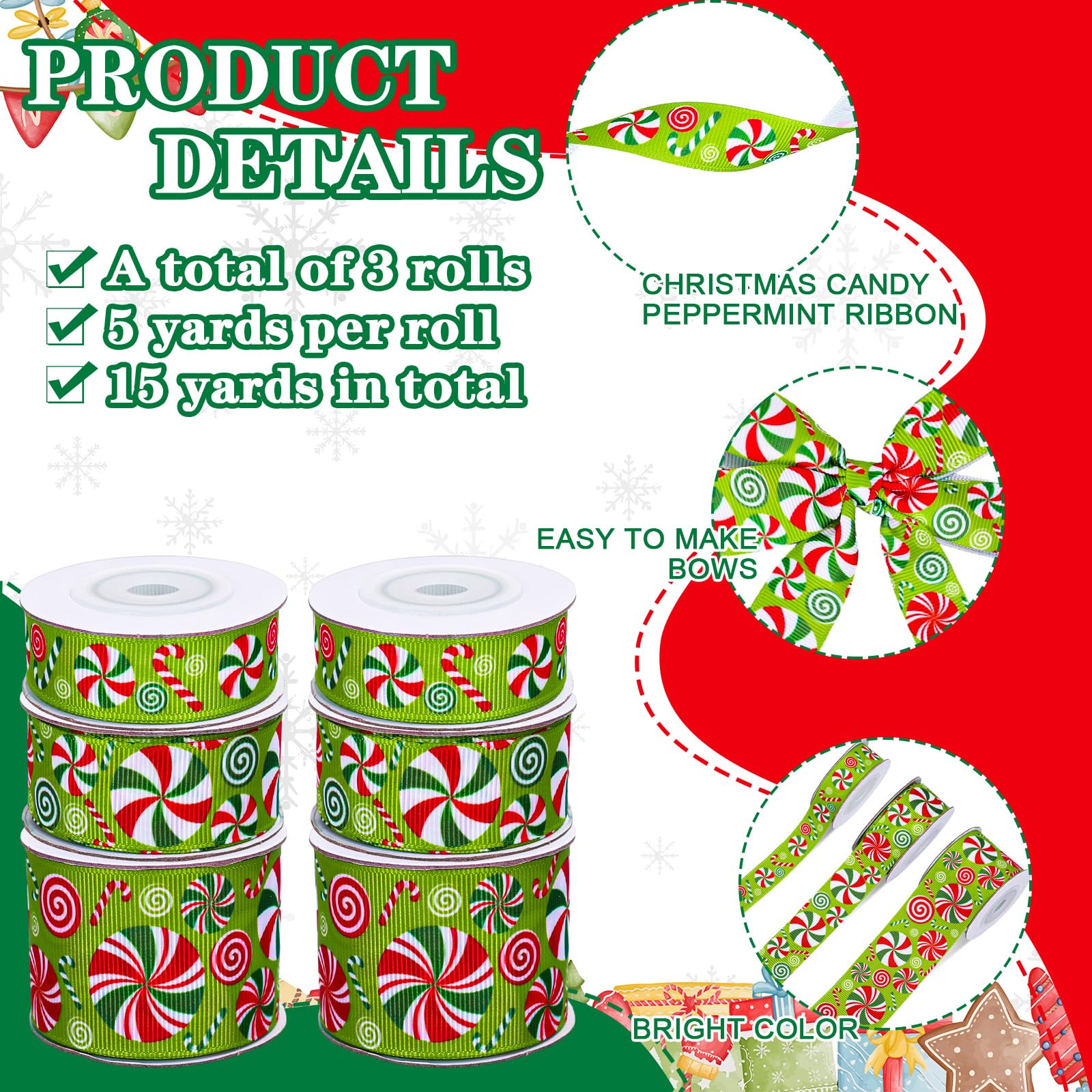 CANDY CANE GROSGRAIN RIBBON: Our ribbon rolls come with patterns of peppermint candy, colored mainly in red and green, making it a great addition to your home and party.