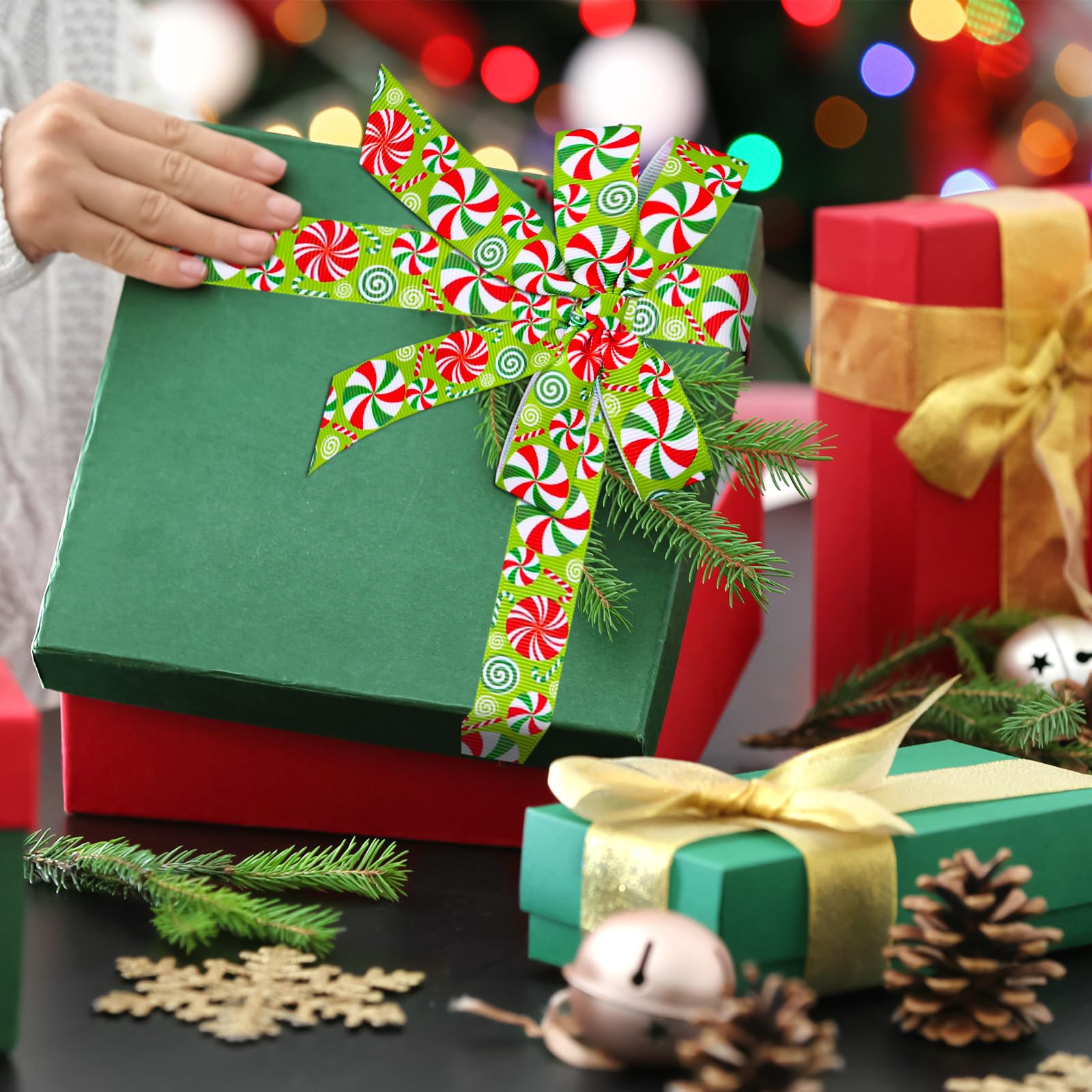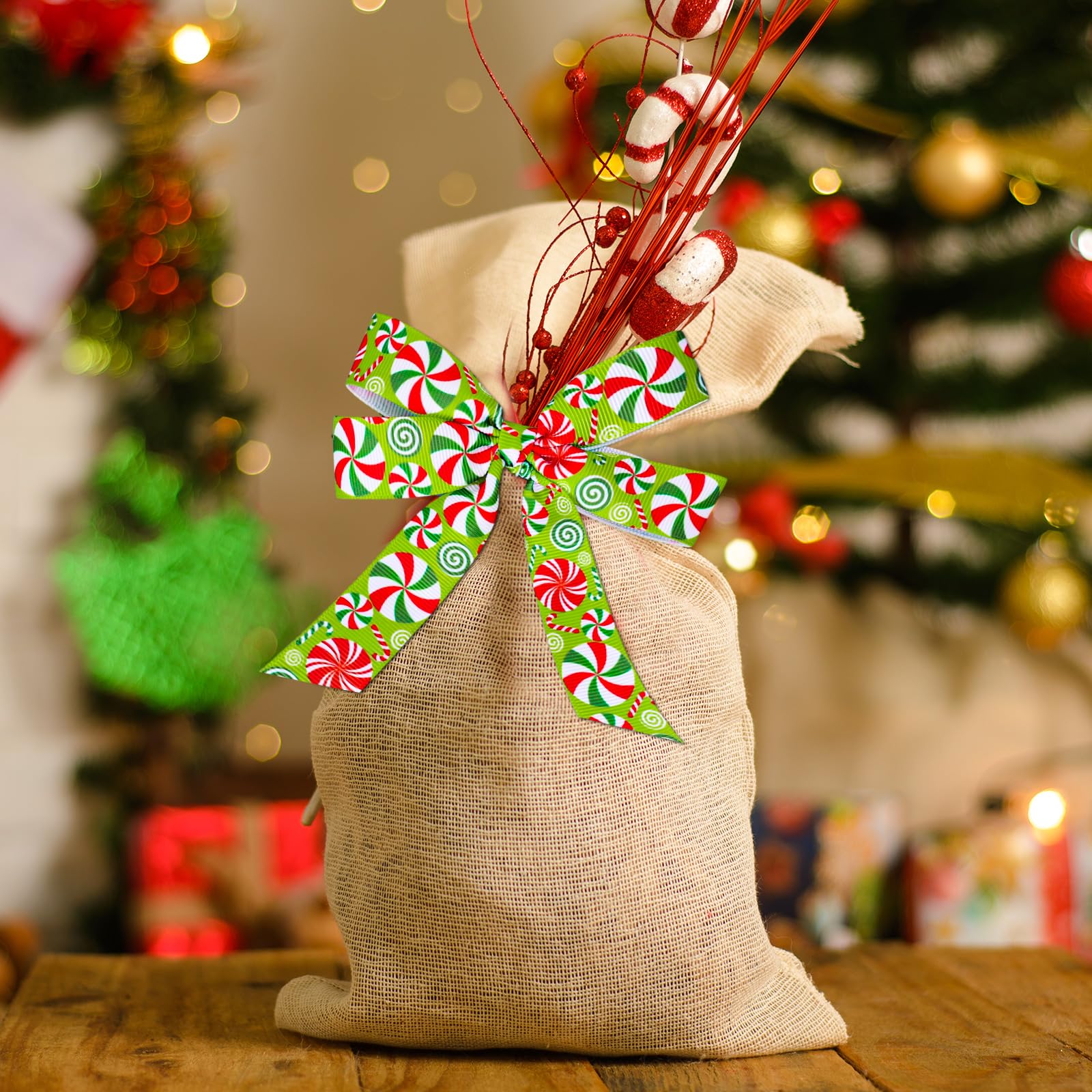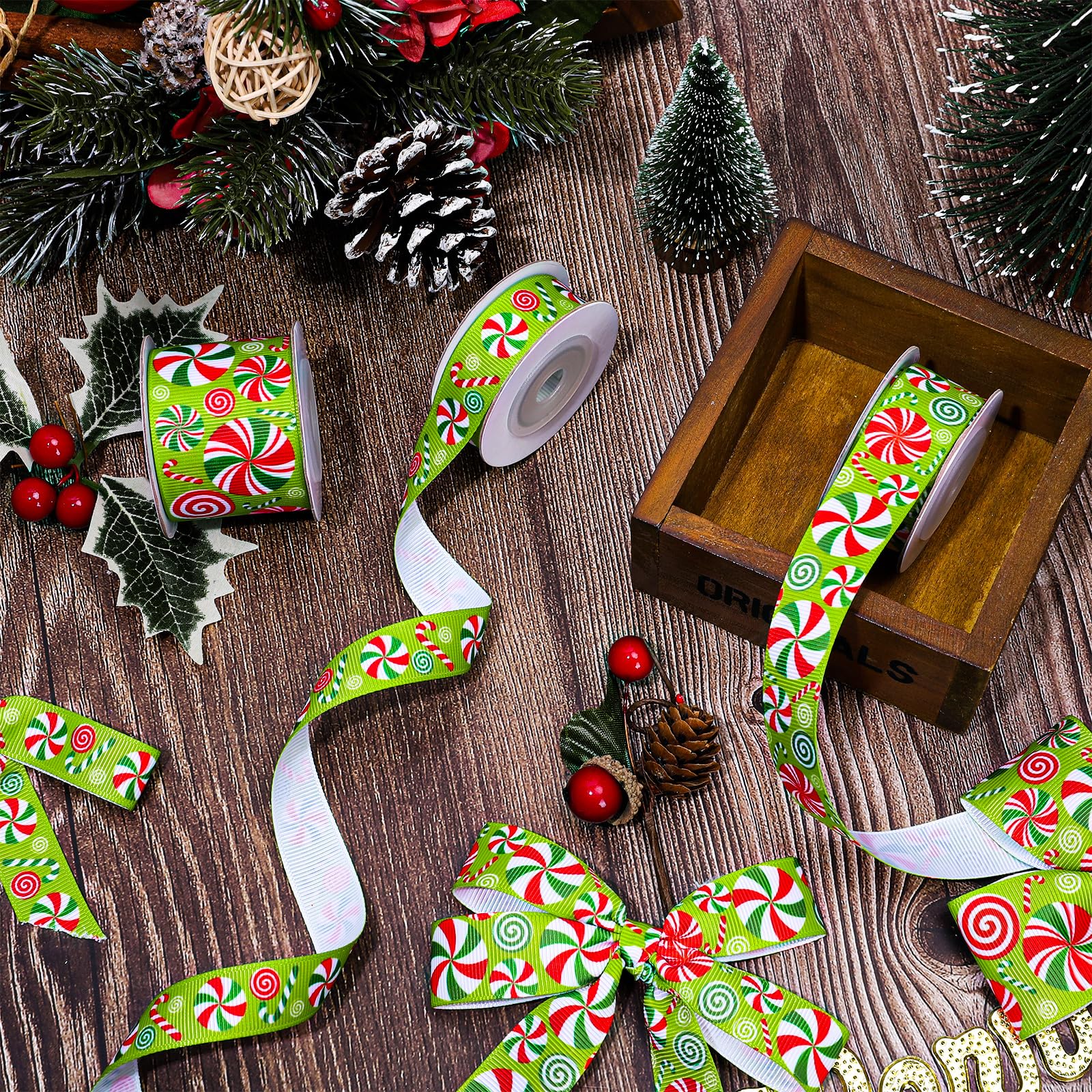 CANDY CANE GROSGRAIN RIBBON: Our ribbon rolls come with patterns of peppermint candy, colored mainly in red and green, making it a great addition to your home and party.