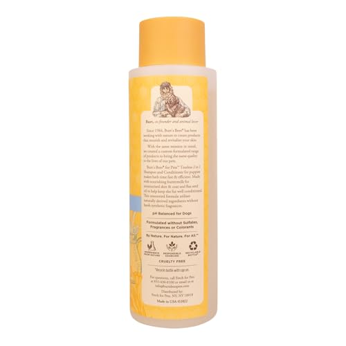 Burt’s Bees for Pets Tear Free Puppy Shampoo & Conditioner is made for gentle cleaning and light conditioning during regular puppy baths. This 2 in 1 puppy shampoo and conditioner helps simplify bath time while caring for puppies’ sensitive skin and eyes. Formulated with naturally derived ingredients like buttermilk, this puppy shampoo and conditioner helps leave coats clean, soft, and easy to manage without harsh cleansers. The tear free, low-lather formula rinses easily, making bath time calmer for puppies and pet parents. Free from sulfates, parabens, phthalates, and artificial colorants, this dog shampoo and conditioner for puppies is pH balanced specifically for dog skin. It’s a gentle option for routine grooming and early puppy care.