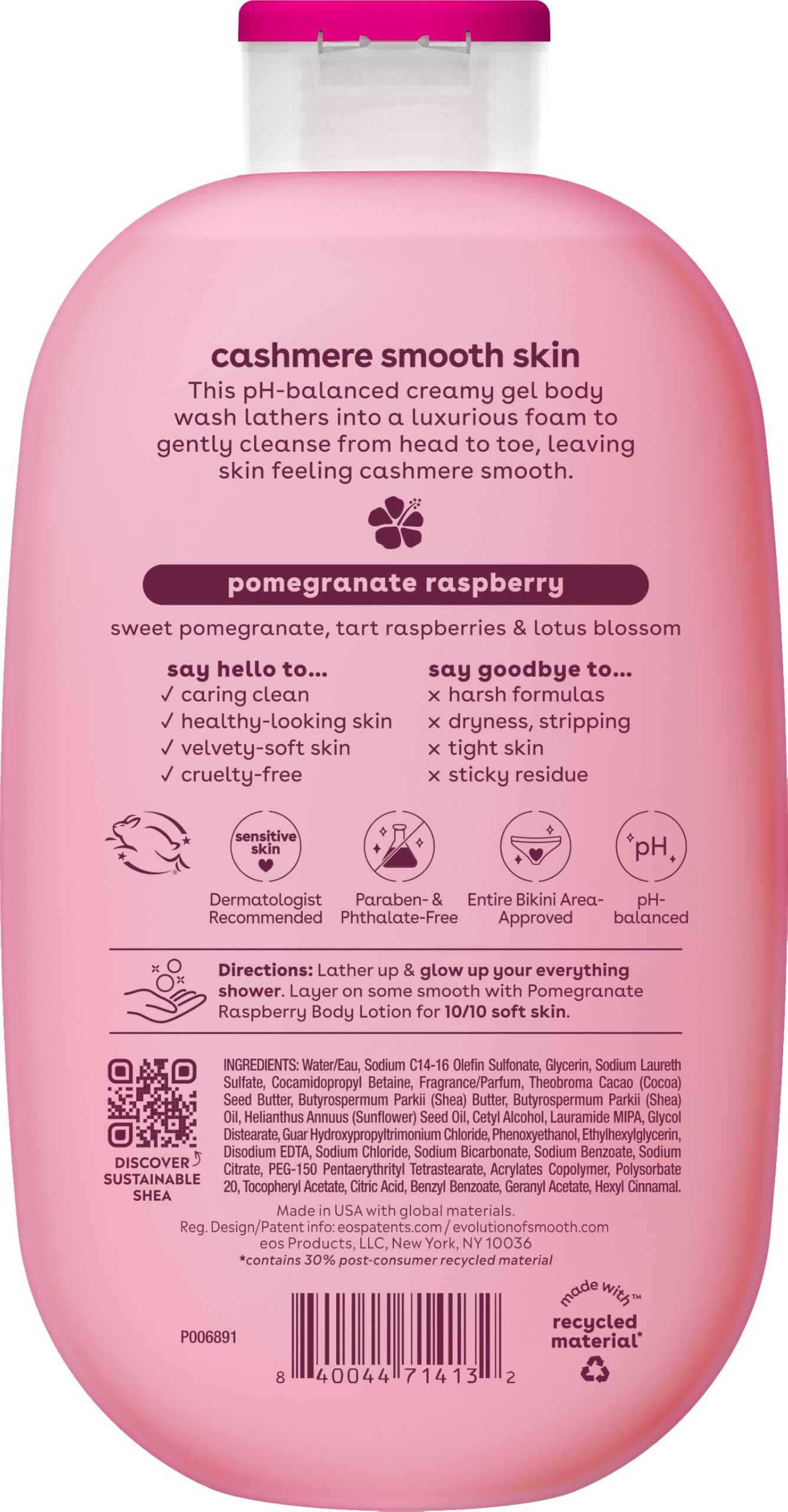 eos Pomegranate Raspberry Body Wash turns your daily shower into a creamy, feel-good body care ritual. This moisturizing body wash gently cleanses while wrapping skin in a bright pomegranate raspberry scent with juicy, fruity sweetness. The pH-balanced formula creates a rich, foamy lather that rinses clean, leaving skin feeling silky, smooth, and comforted. Infused with a nourishing blend of shea butter, cocoa butter, glycerin, vitamin E, and sunflower seed oil, this pomegranate raspberry body wash helps lock in moisture and support soft, healthy-feeling skin. Designed for women and gynecologist approved, it’s gentle enough for sensitive skin and perfect for everyday use. Complete your routine by layering with Pomegranate Raspberry Body Lotion and Body Mist for a long-lasting scent experience.