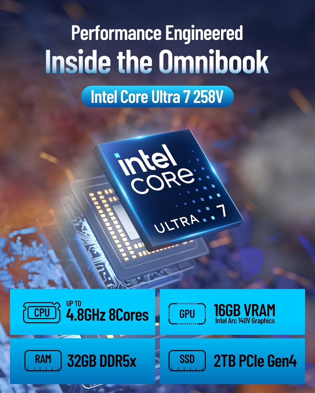 🚀【Smarter AI, Smoother Speed】The hp laptop built on Intel Evo platform features an Ultra 7 258V processor (up to 4.8GHz) with 47 TOPS NPU, allowing lightning-fast AI Copilot+ performance. From content creation to analysis, your Omnibook thinks as fast as you do