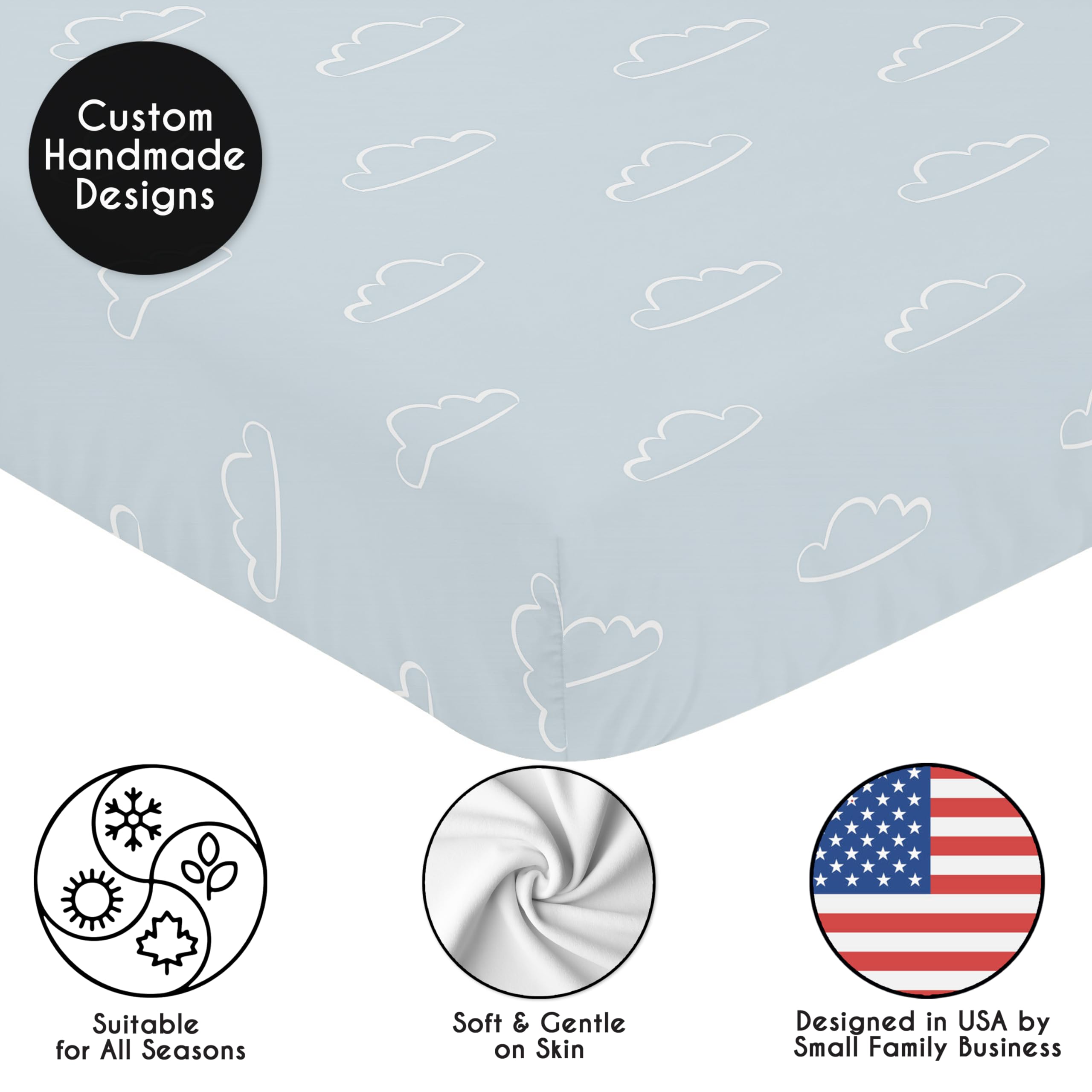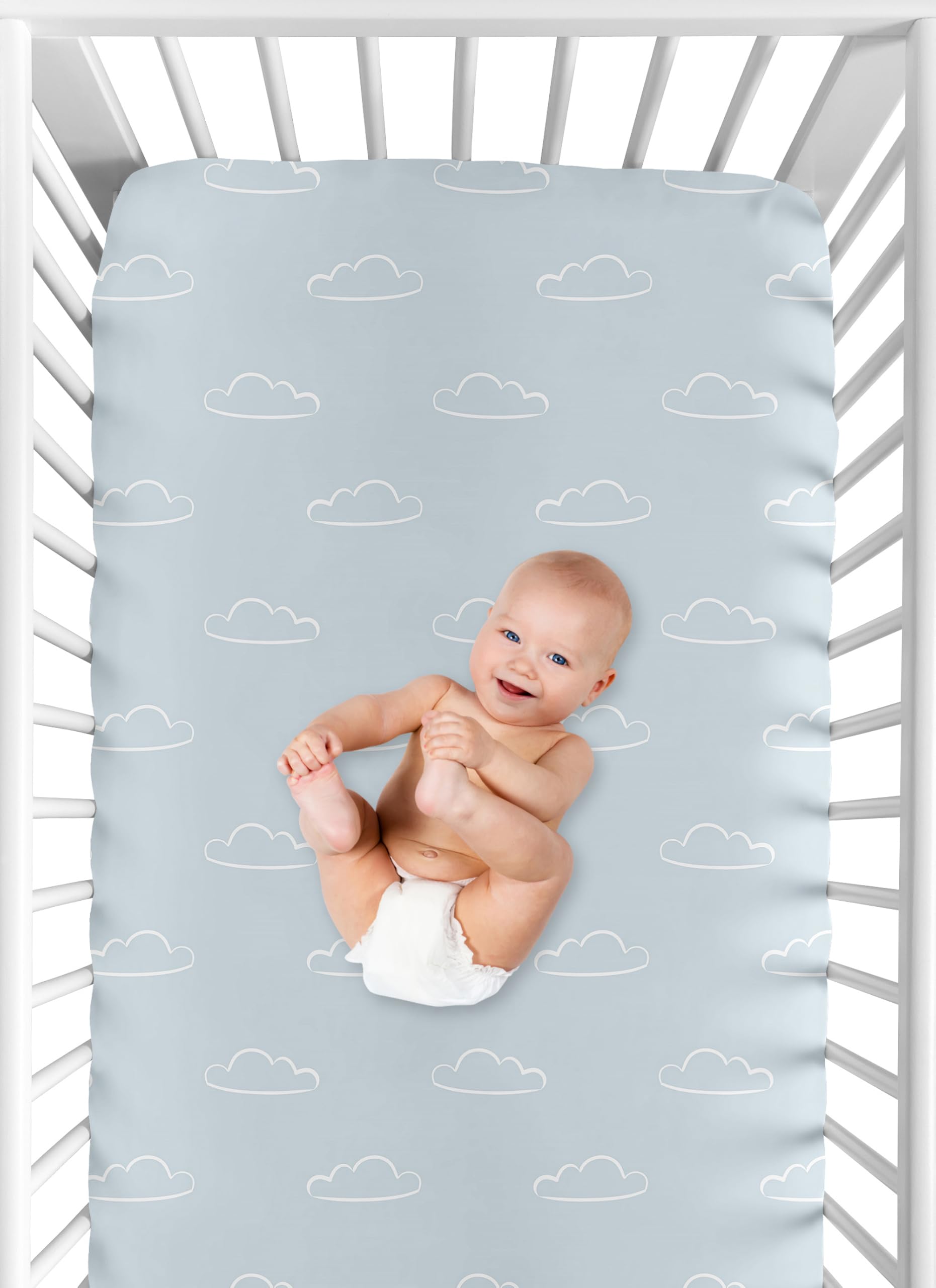 SNUG FIT: Includes (1) Fitted Crib Sheet 52in. x 28in. x 8in. Our newborn standard crib sheets fit snugly, with premium elastic sewn around the entire bottom edge for a secure fit on most standard sized cribs and toddler beds, to reduce shifting & bunching. This brushed microfiber crib sheet features a design of a slate blue and white fluffy, clouds print for the aviation, transportation, aviator, Vintage Airplanes Collection & is gentle on delicate skin to foster a soothing sleep environment.