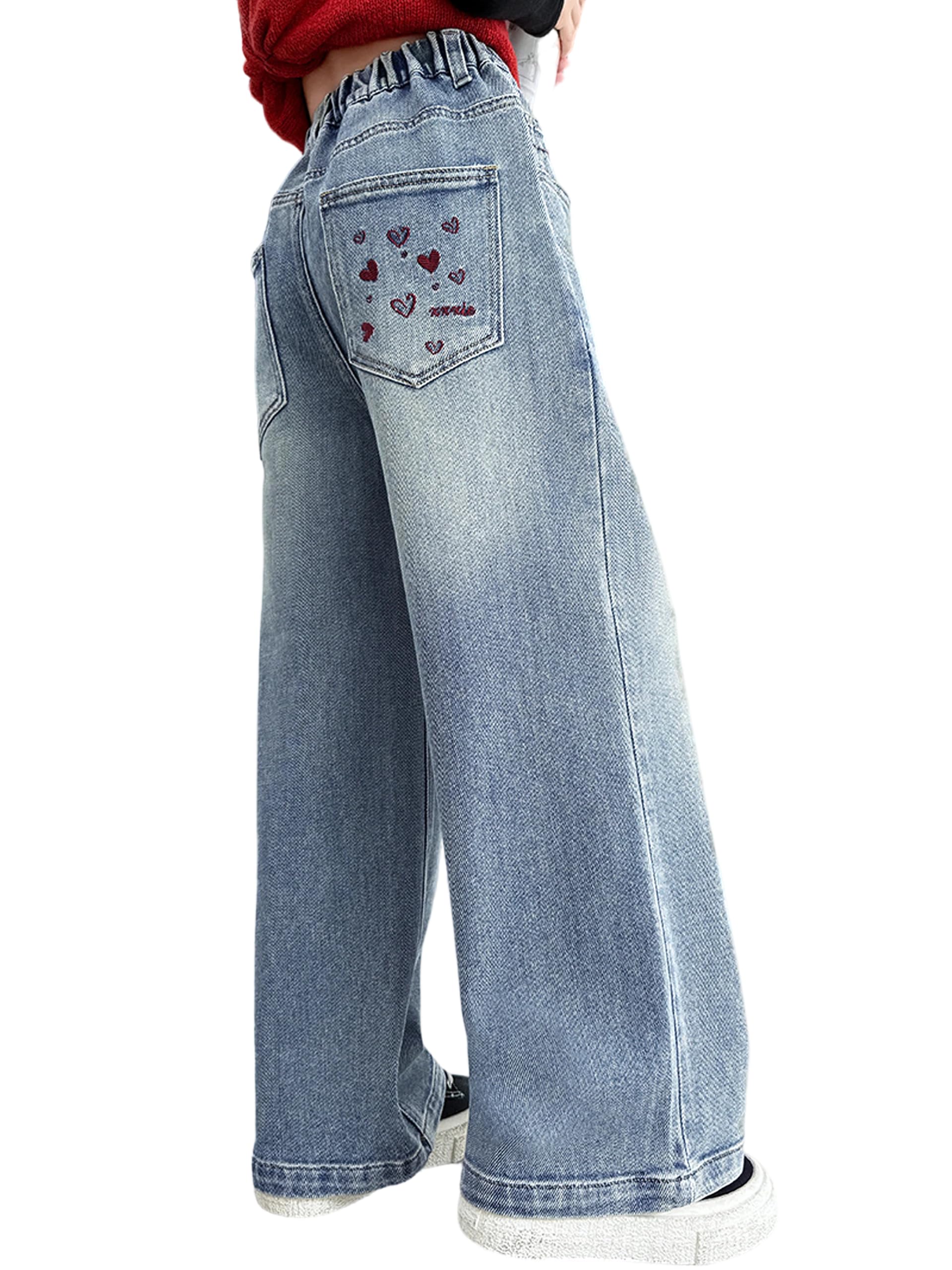 Features: Wide-leg jeans for girls are designed for both comfort and a modern look. loose fit, full elastic waist for easy on and off, providing a secure. Eye-catching back pocket heart pattern design adds a unique, playful touch, brings a touch of whimsy, making these jeans perfect for any fashion-forward young girl
