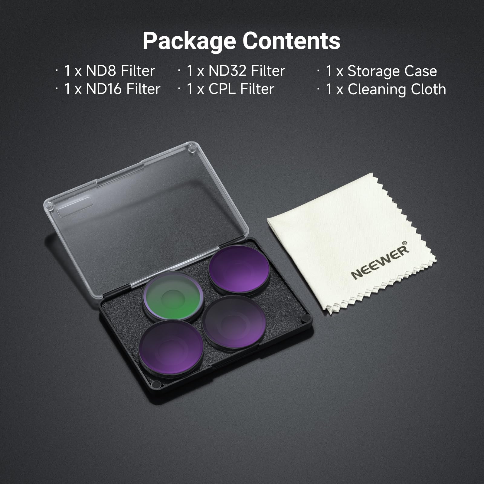 【Flexible Exposure Control】 ND8, ND16, and ND32 neutral density filters provide 3, 4, and 5 stops of light reduction, allowing balanced exposure in various environments and creative motion blur effects