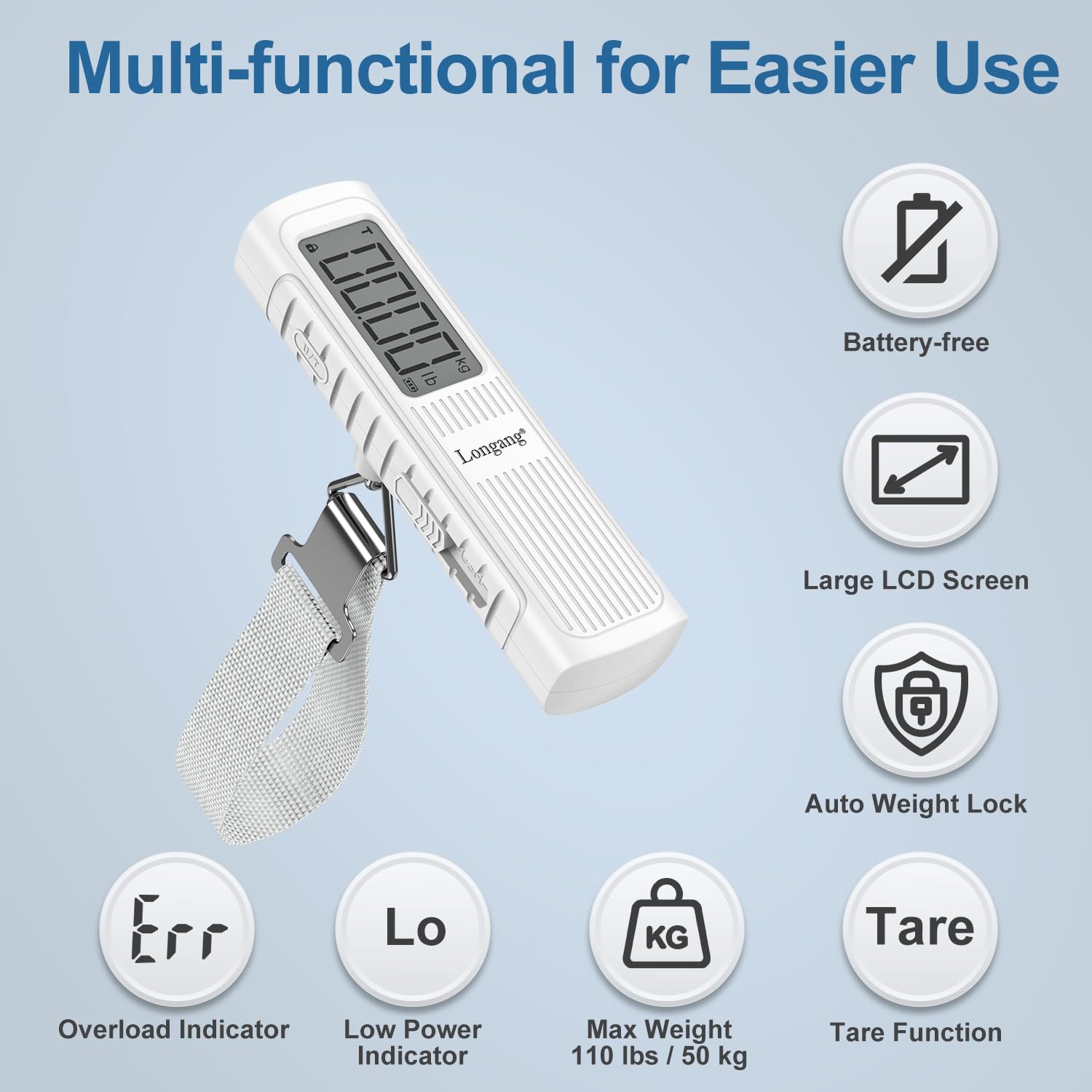 Multi-function - Precise measurement, unit conversion, overload warning, tare function, weight Auto-lock, Auto-off. Perfect for weighing suitcases, backpacks, fishing gear, postal packages and other weighing needs at home or on the go.