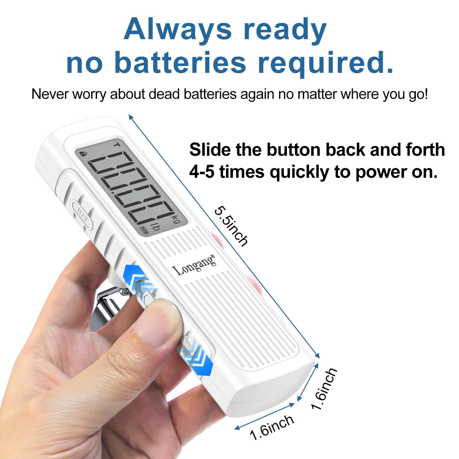 No Battery Required β Eco-friendly and hassle-free operation without the need for batteries or charging, just simply slide the pushbutton 4-5 times quickly to generate power for the hanging scale, no need to replace batteries or worry about disposing of used batteries, ensuring reliable use anytime, anywhere. No worrying about running out of batteries on vacation!