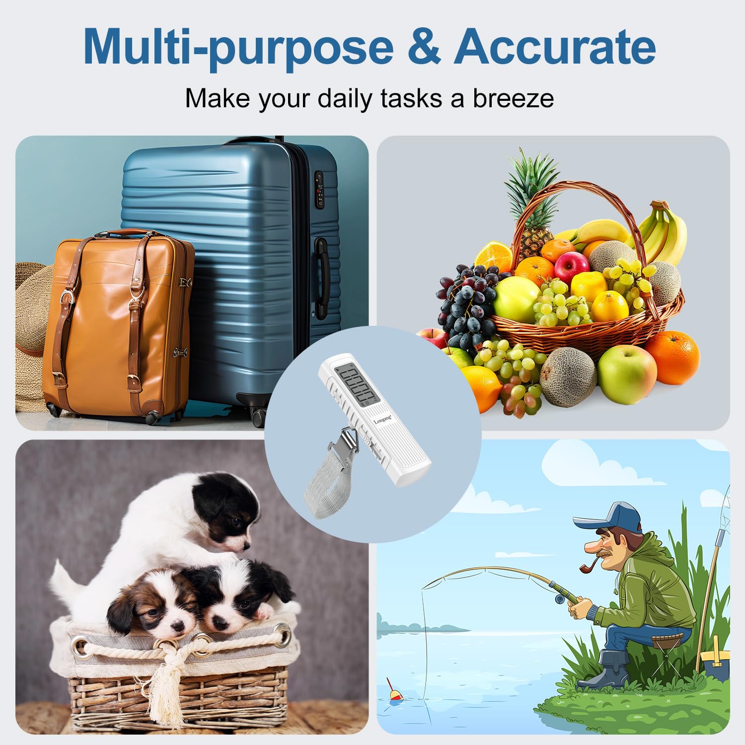 Precise & High Capacity β Accurately measures weights up to 110lbs/50kg with a resolution of 0.1lb/50g. No more unexpected baggage overweight fees! T-handle design hanging scale with durable nylon strap and sturdy metal hook, perfect for luggage, packages, backpacks and more. It is also suitable for buying groceries in markets and as a fishing scale.
