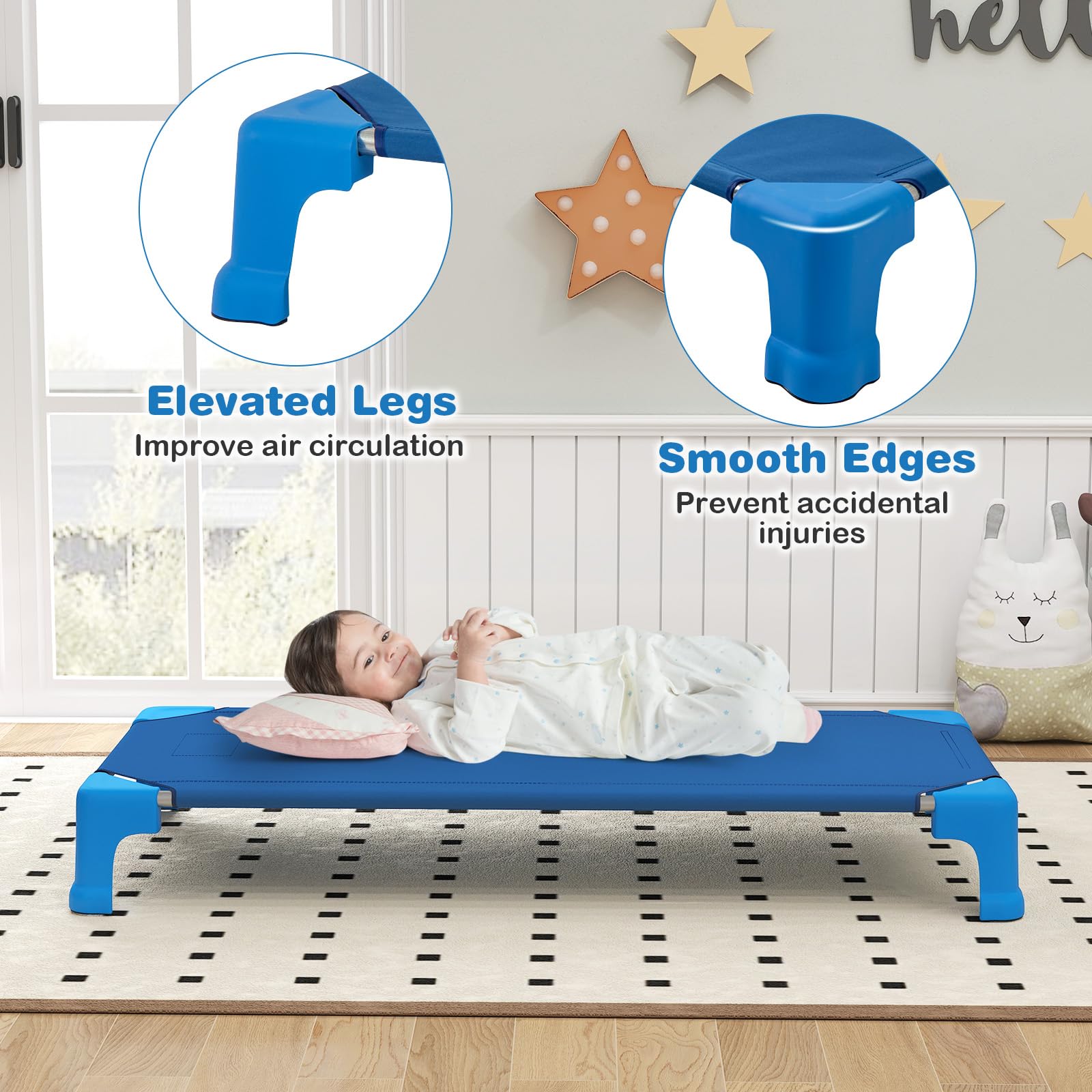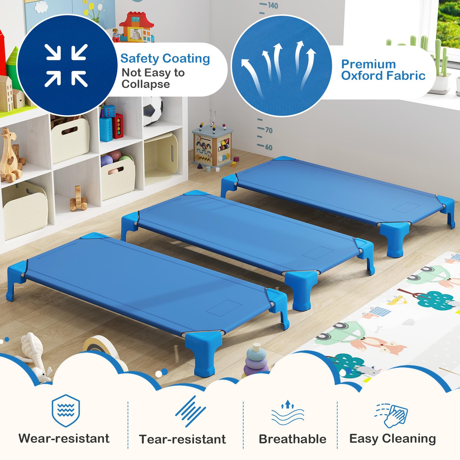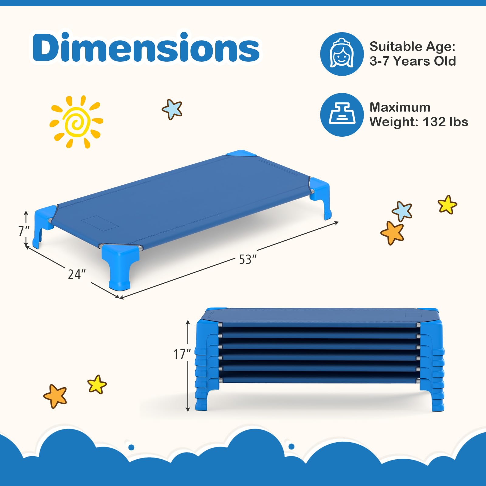 Description: Create a cozy and efficient nap time environment with this 6-pack stackable toddler cot set. Designed to maximize space, these lightweight cots stack vertically for easy storage and quick access. Crafted with a sturdy structure and reinforced plastic corners, they offer lasting durability and stable support for toddlers, while smooth edges prevent accidental injuries. The tear-resistant Oxford fabric provides breathable comfort to keep children cool during rest. Ideal for nap time or as temporary beds, these portable toddler cots require easy assembly, making them perfect for busy daycare centers. Ensure children enjoy a peaceful, comfortable sleep with our reliable, space-saving daycare cots. Features: Vertical stackable design maximizes storage space when not in use Galvanized metal frame ensures stability and long-lasting use Reinforced plastic corners prevents wobbling Safety assurance provided by premium materials that are BPA-free and odorless Premium Oxford fabric is wear-resistant, tear-resistant, and breathable Smooth edges minimizes the risk of accidental injuries Elevated legs improve air circulation beneath the cot Lightweight cots are easy to transport for quick room setups Hook and loop fasteners allow quick removal and maintenance Adds a playful touch to preschools, classrooms, and daycare centers Specifications: Color: Blue/Colorful Material: Galvanized Metal, PP, Oxford Fabric Stacked Size: 53” x 24” x 17” (L x W x H) Overall Dimensions of Each Cot: 53” x 24” x 7” (L x W x H) Net Weight: 37.5 lbs Weight Capacity: 132 lbs Recommended Age: 3-7 Years Old Package Includes: 6 x Stackable Daycare Cots 1 x Instruction
