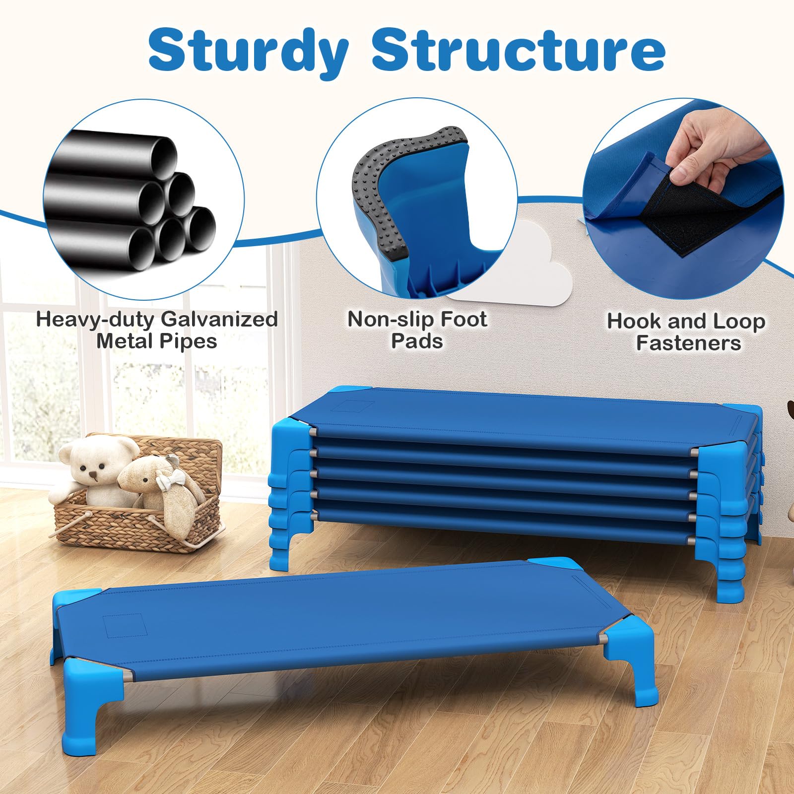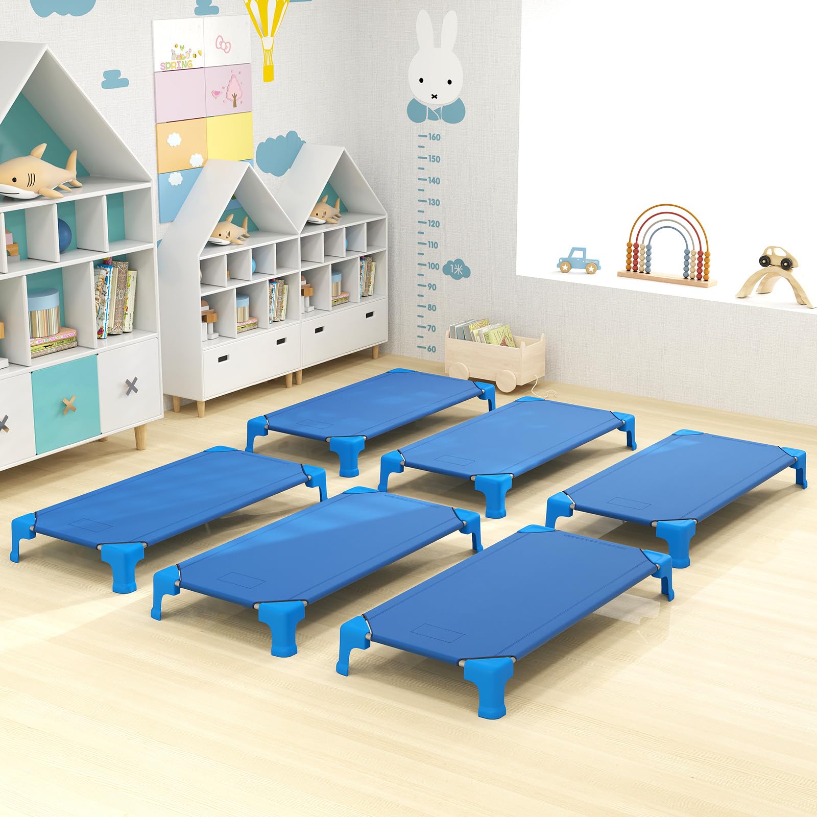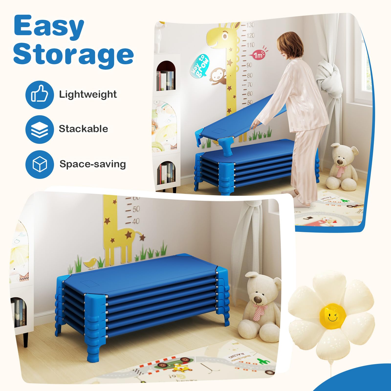 [ Space-Saving Stackable Design ]: The 6-pack toddler cot set can be stacked neatly in a compact vertical arrangement (only 53" x 24" x 17" in stacked size), saving valuable floor space. Lightweight and easy to transport, these cots allow for quick relocation between rooms or classrooms.
