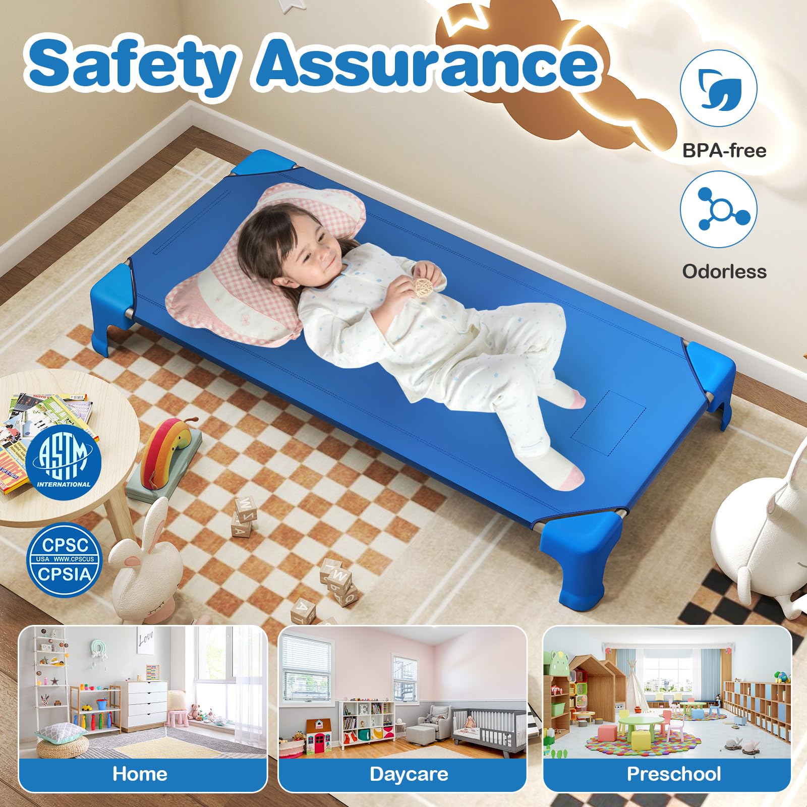 [ Easy Assembly and Cleaning ]: The stackable kiddie cots only takes a few minutes to assemble, saving your time and energy. They are perfect for busy daycare centers and preschools. The fabric cloth is secured with hook and loop fasteners and can be easily removed for easy cleaning, ensuring a hygienic environment for children.