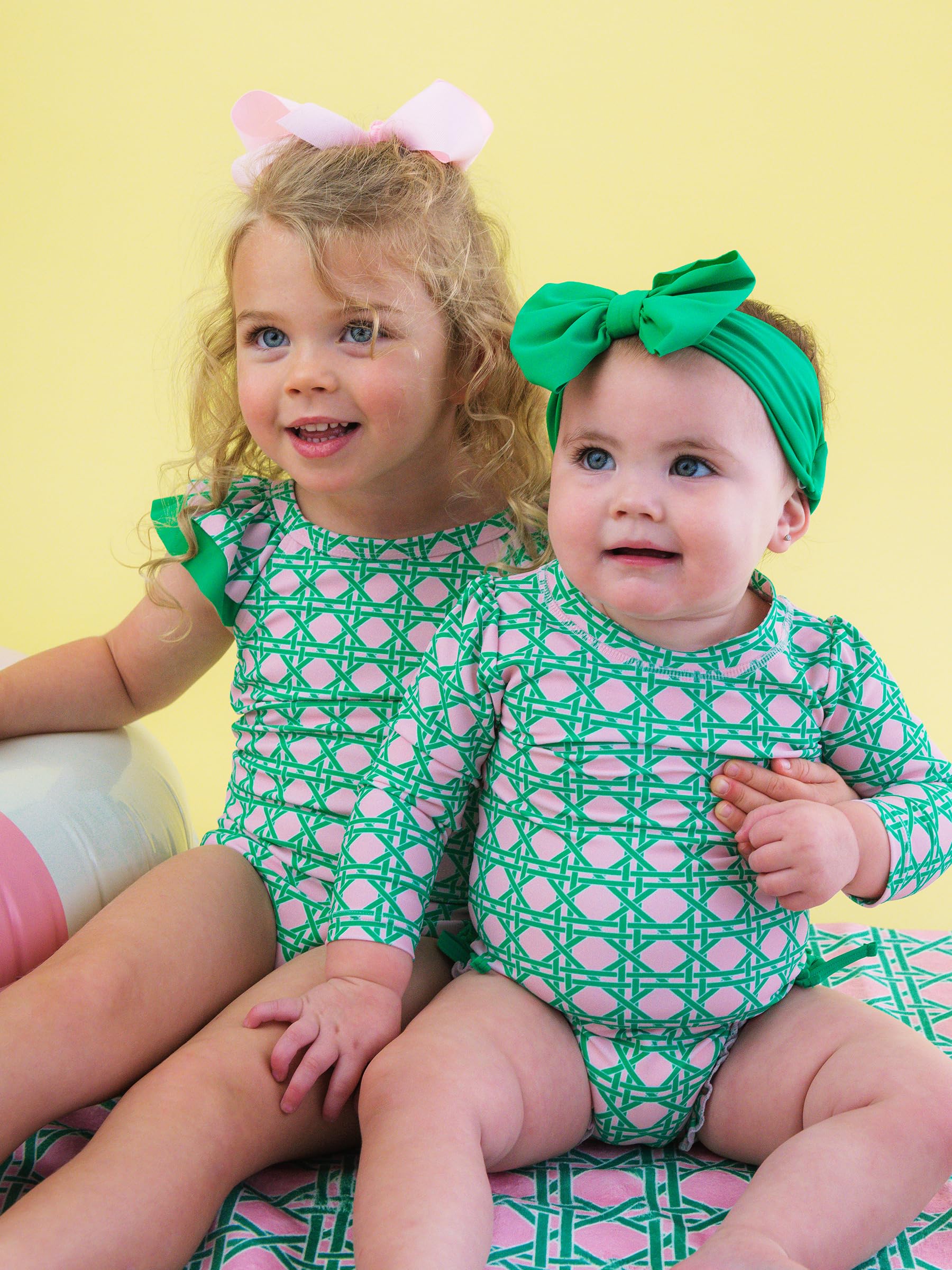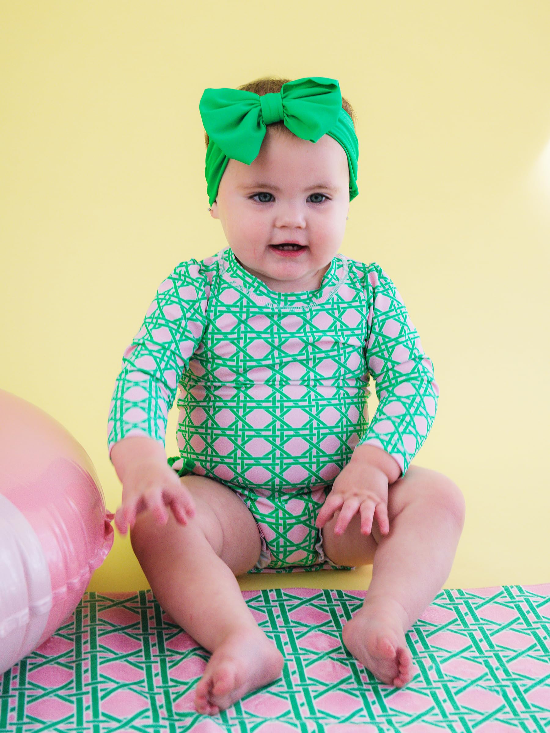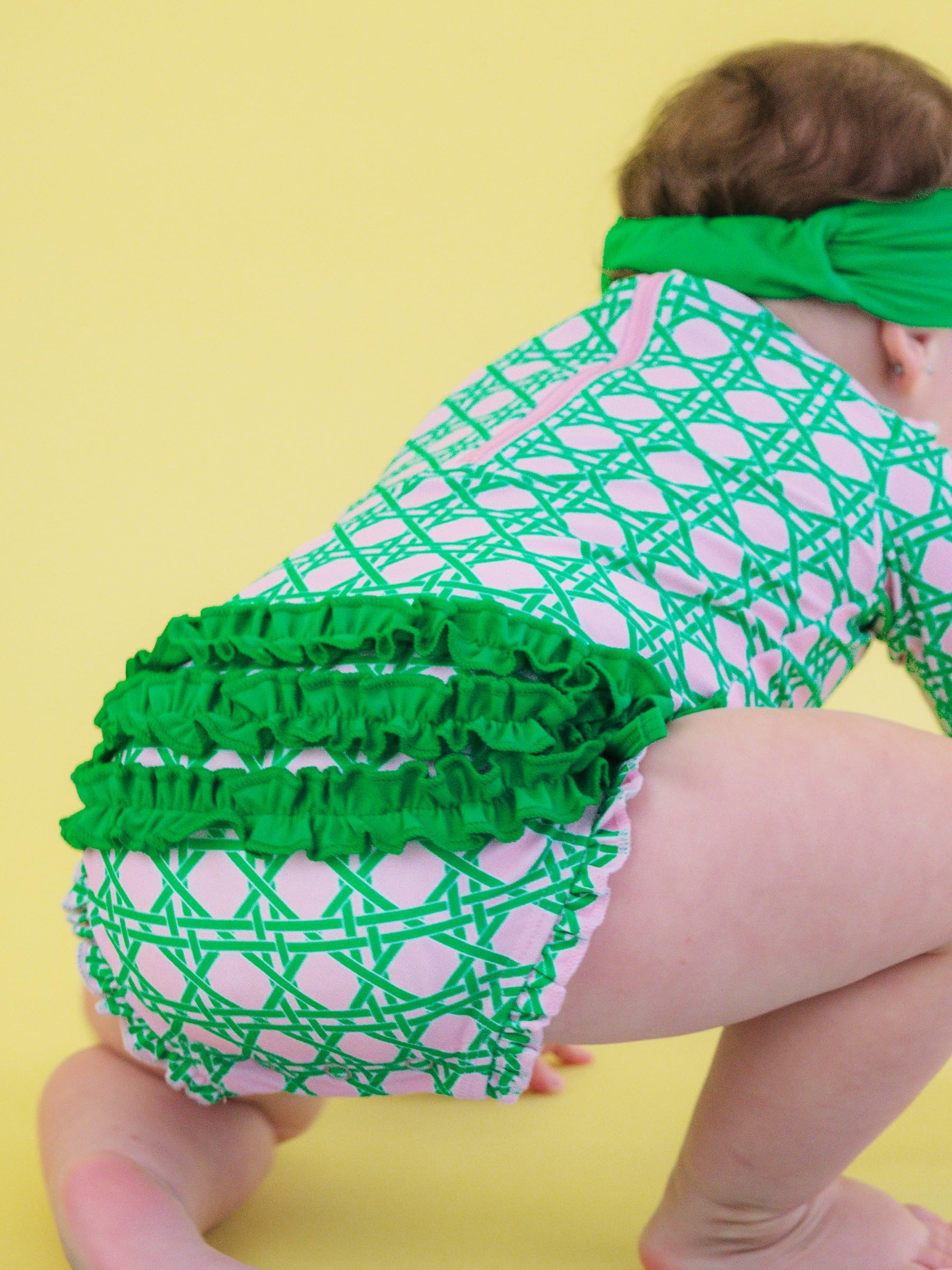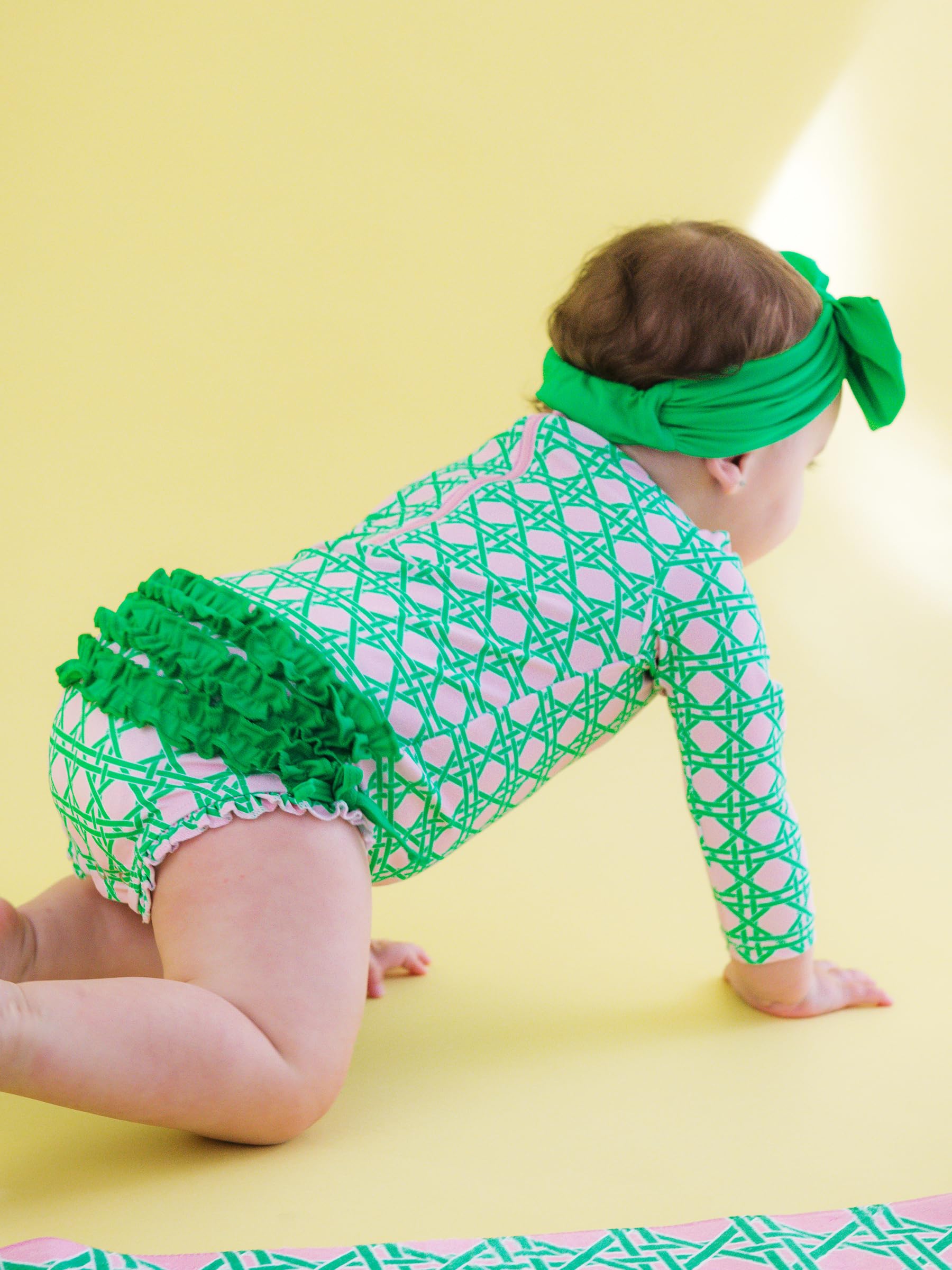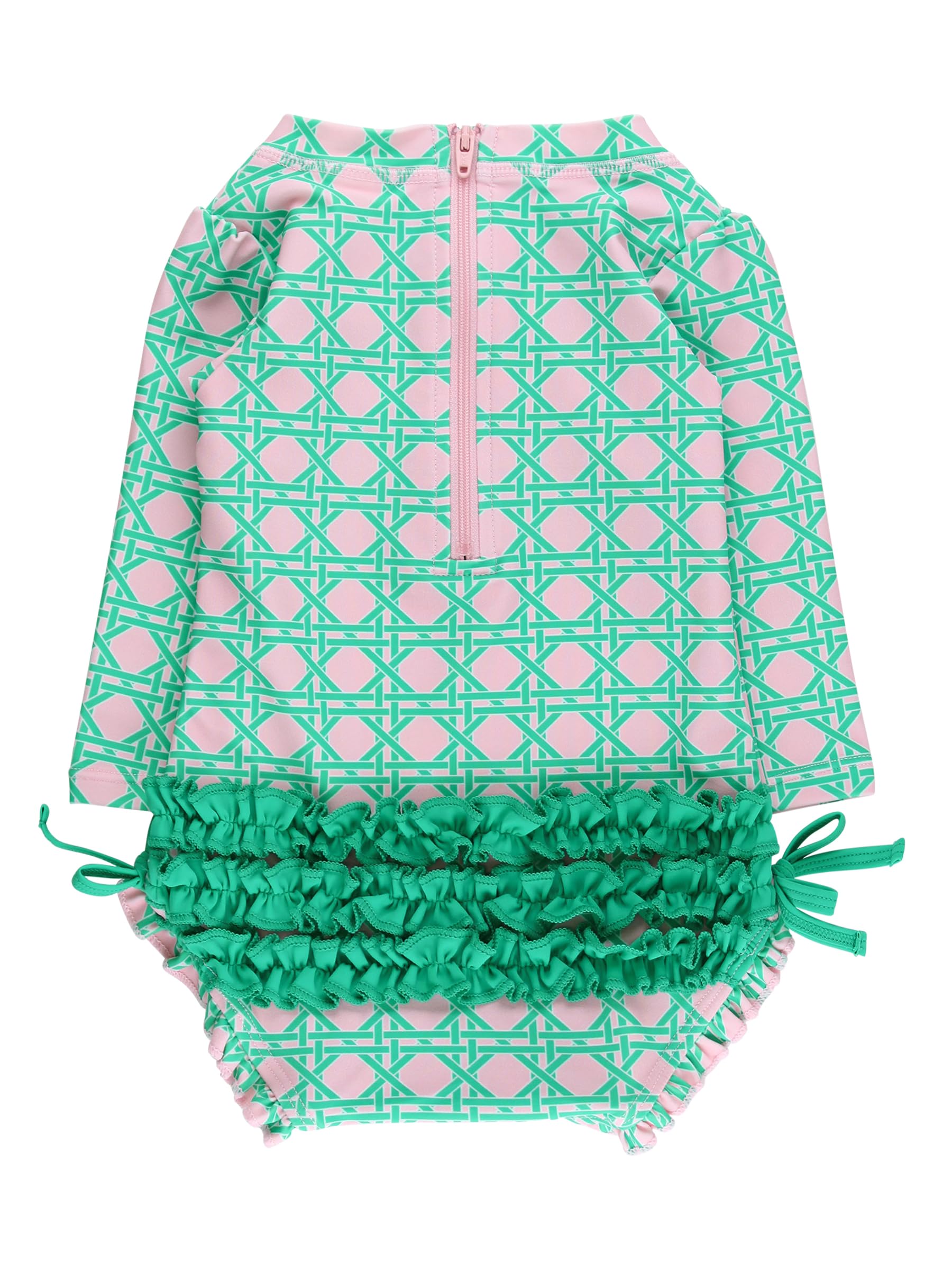 Bow detail,Full seat coverage,Long sleeves for sun protection,Quarter zipper,Ruffle detail,Signature rear ruffles,Snaps for easy changing