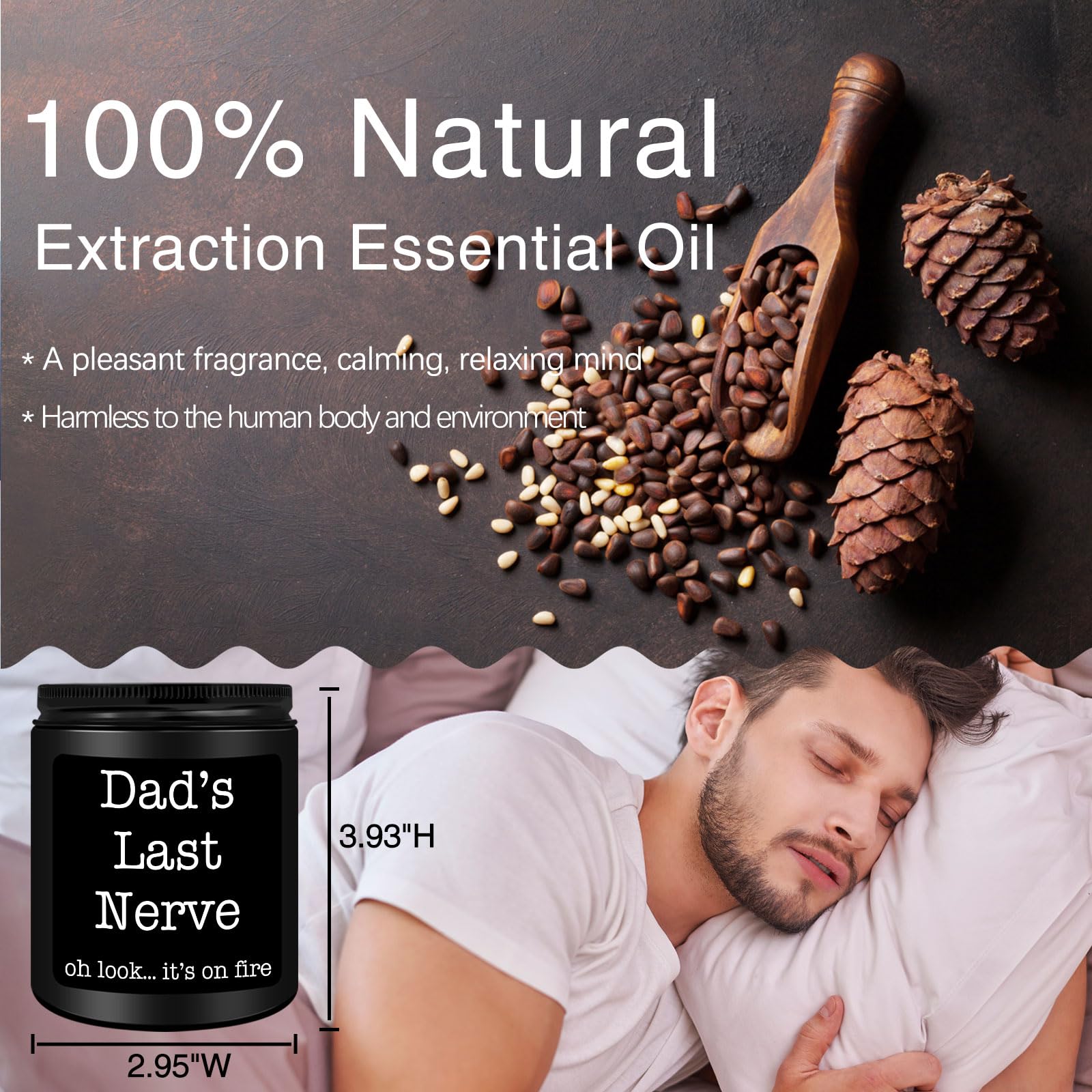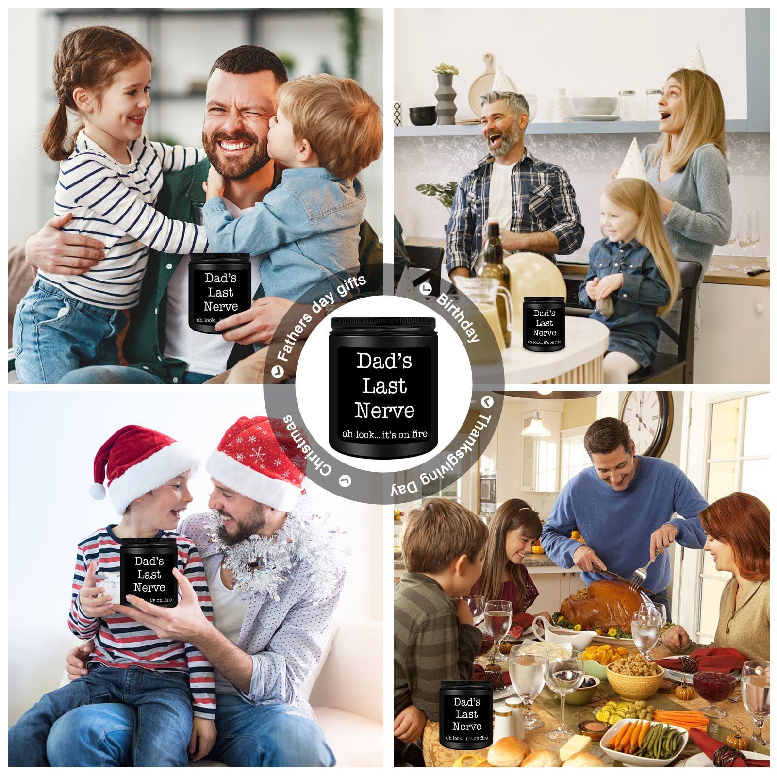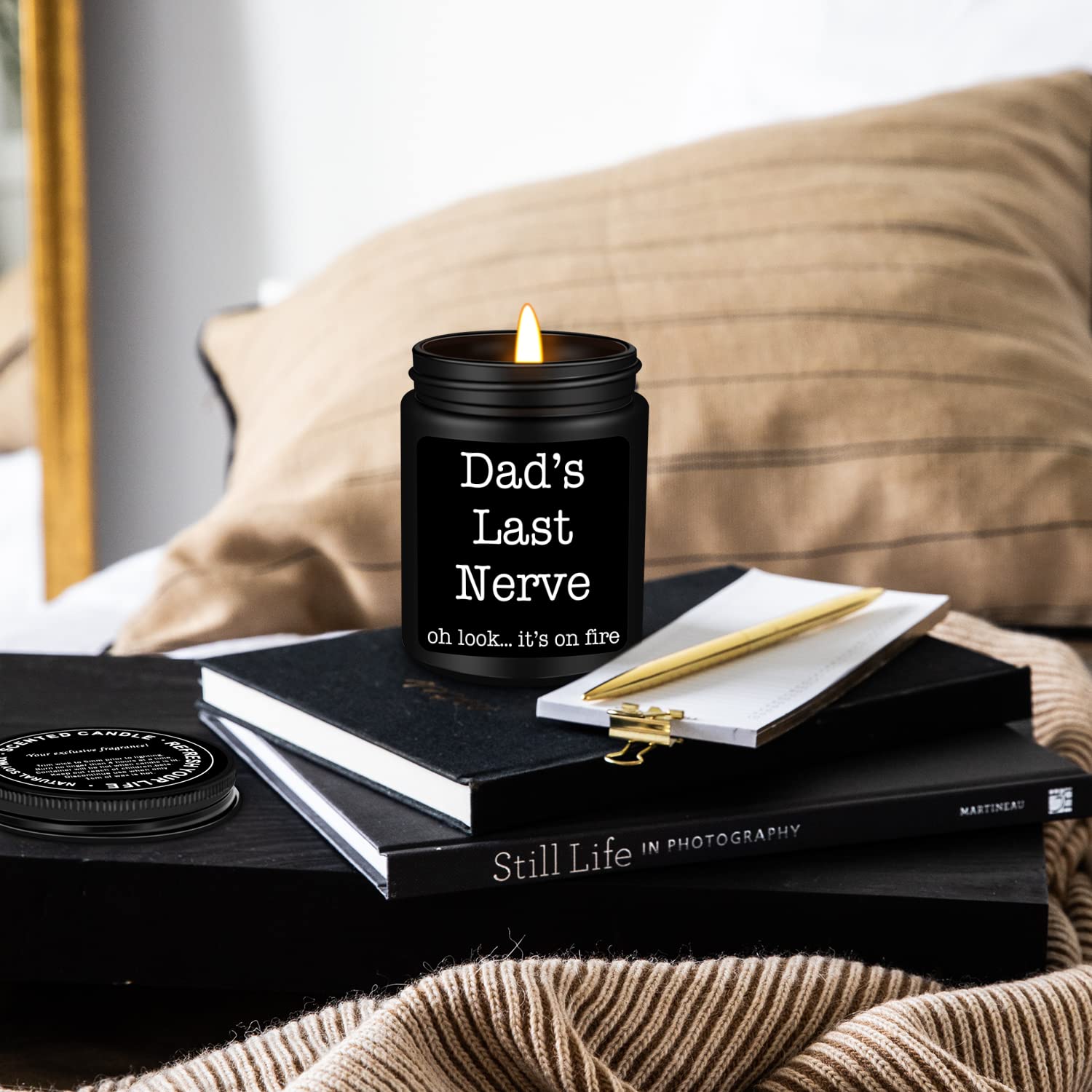 Dad's Gifts from Daughter: This black cedarwood juniper and sandalwood candle with a humorous saying "Dad's last nerve oh look... It's on fire". It is a great and cool gift idea for dads from kids
