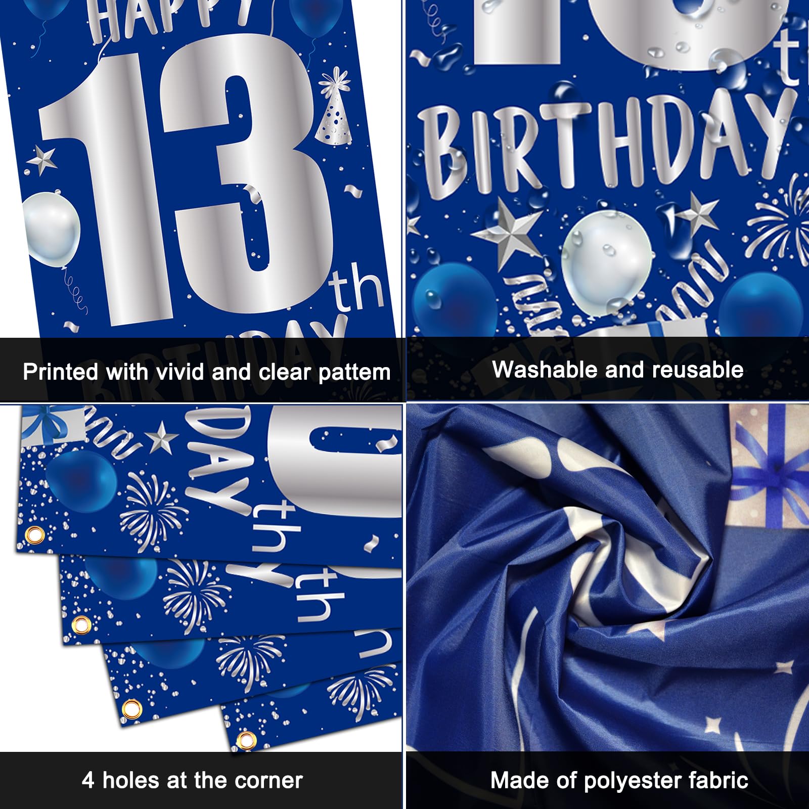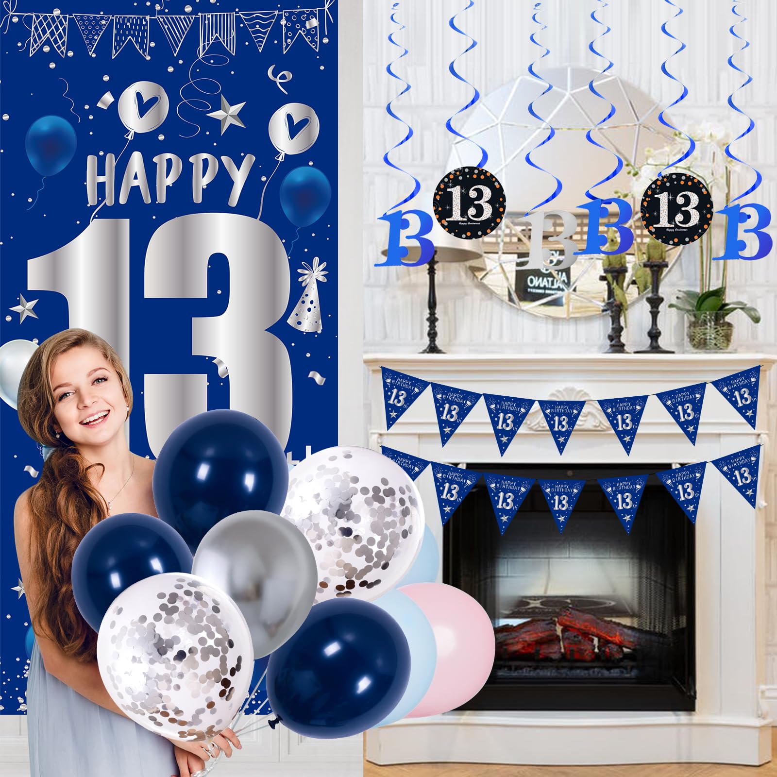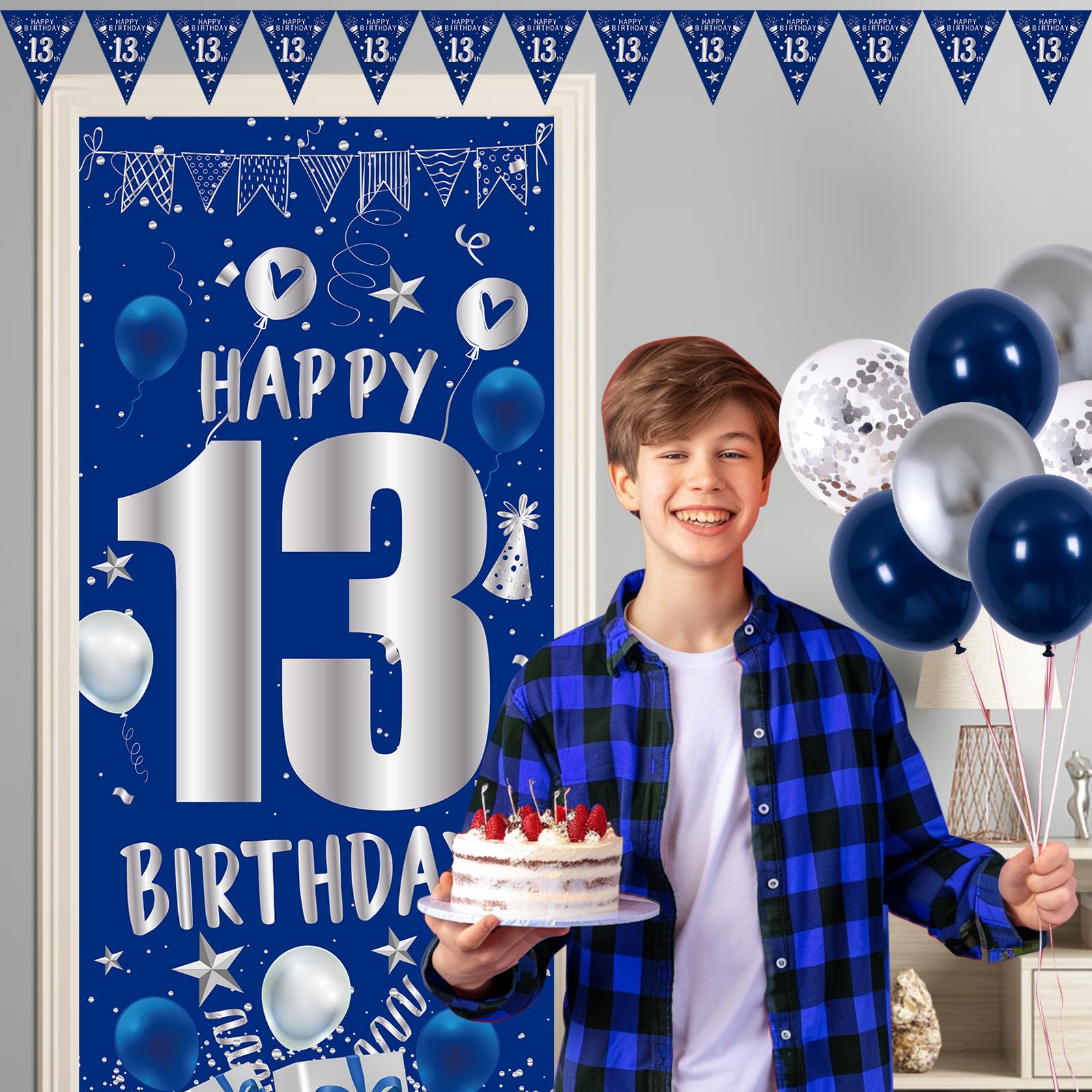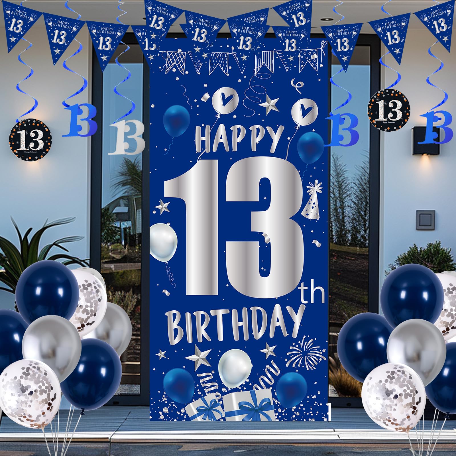 đăExclusive 13th Birthday Decorations for Boys GirlsăThe happy 13th birthday decorations party kit for boys girls uses blue and silver as the birthday theme colors, easy to set up a stylish, sparkling and romantic birthday scene; The large âHappy 13th Birthdayâ sign on the birthday door banner is instantly eye-catching and impressive