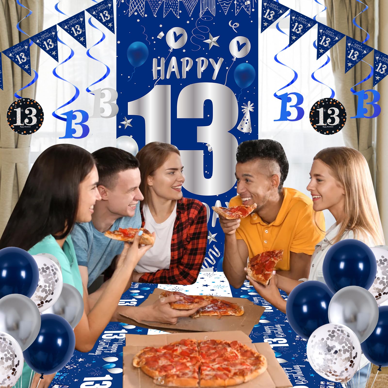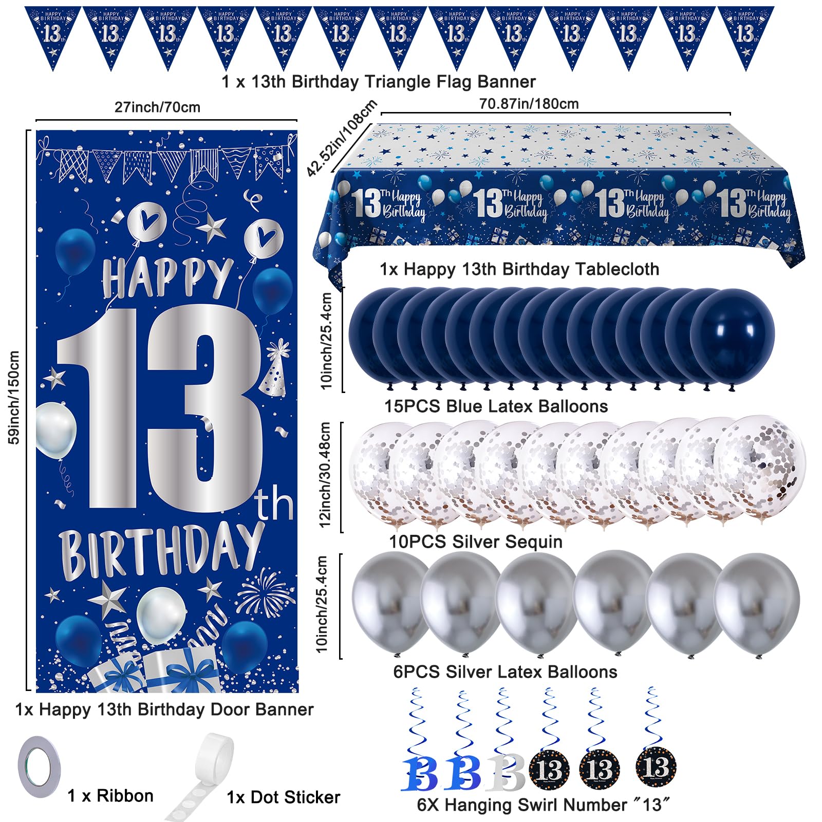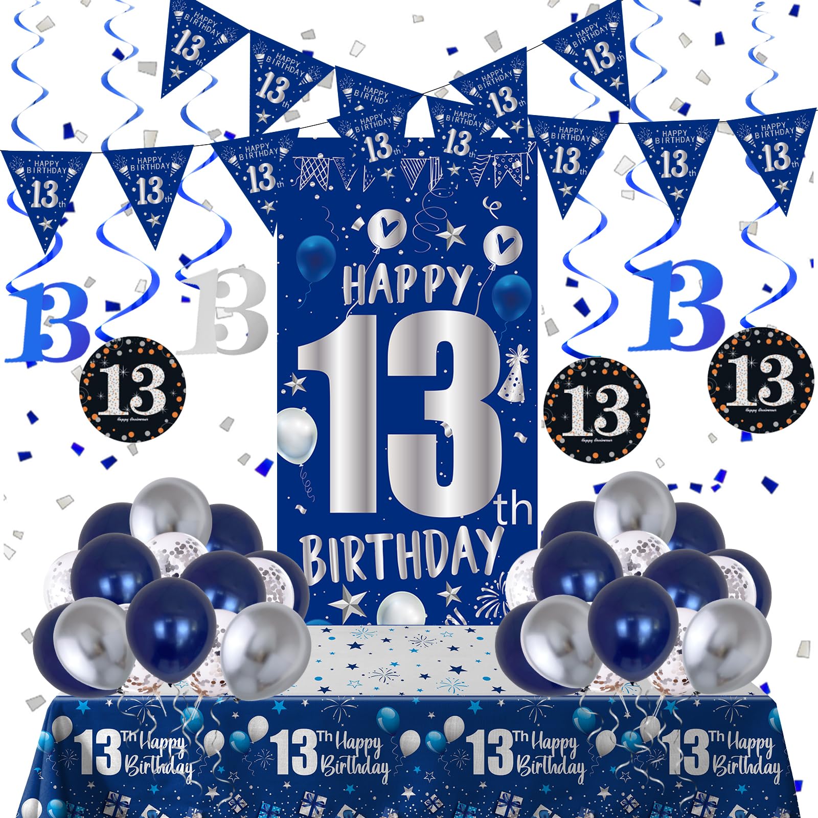 đăWhat You Will GetăThis blue and silver birthday decorations party supplies are designed for 13 year old boys and girls birthdays; Package list: 15x navy blue latex balloons, 10x silver confetti balloons, 6x silver latex balloons, 6x blue hanging swirls with number 13 pendant, 1x blue happy 13th birthday door banner, 1x blue 13th birthday tablecloth, 1 set x number triangle flag banner, 1x dot sticker, 1x ribbon