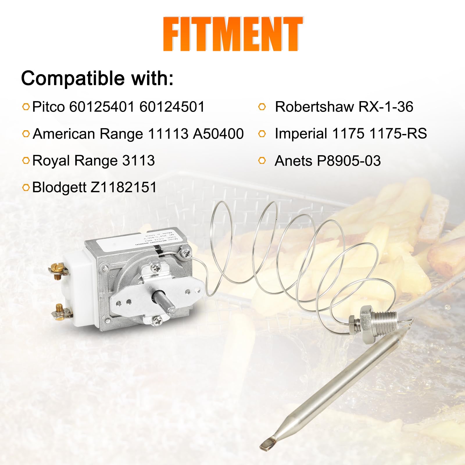 FITMENT: Our Thermostat for Fryer 1/4" Mpt Stuff Box is compatible with Pitco 60125401 60124501, Robertshaw RX-1-36, American Range 11113 A50400, Imperial 1175 1175-RS, Royal Range 3113, Anets P8905-03, Blodgett Z1182151