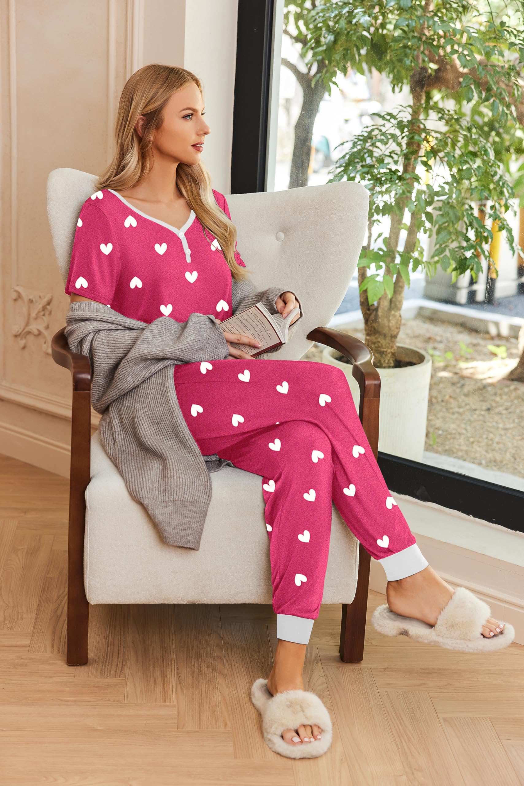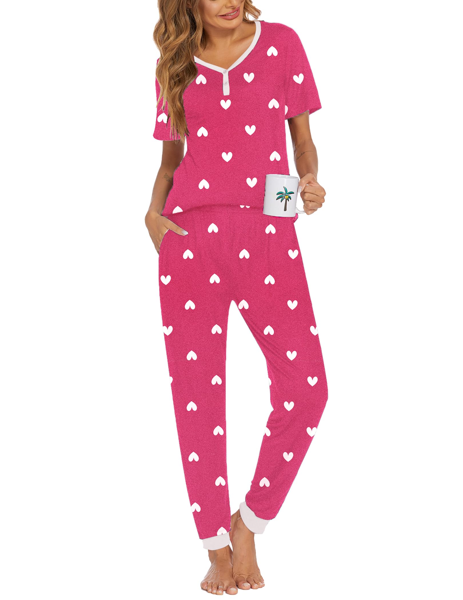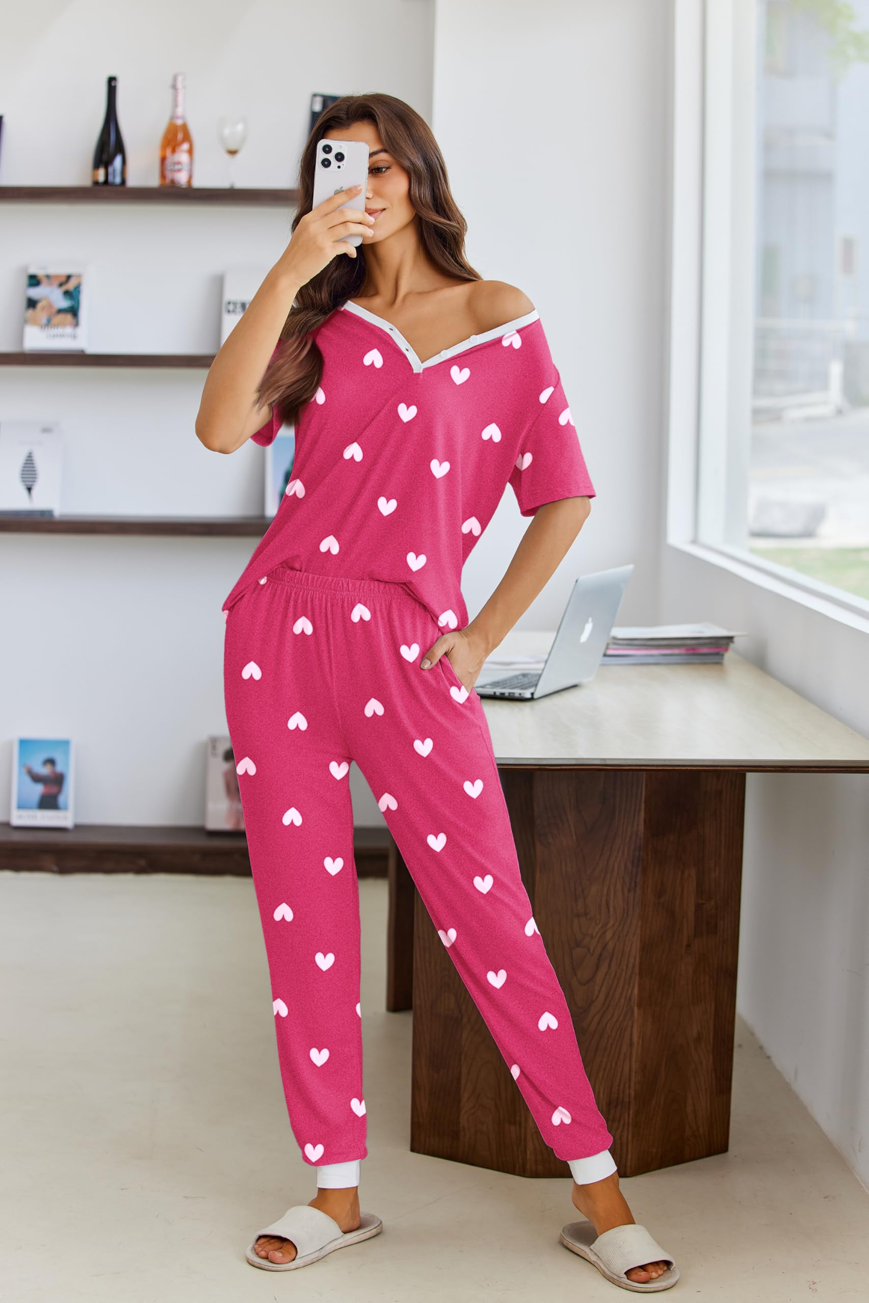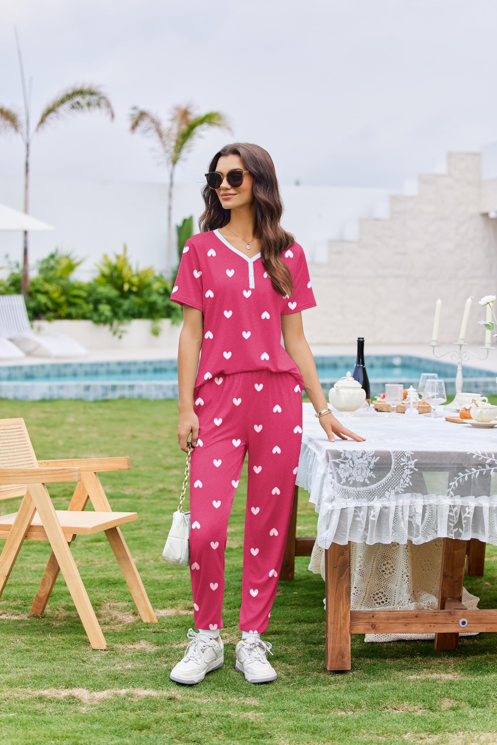 Short Sleeve Tops: The sleepwear pj features with v-neck and button tops. Simple pullover styling for easy fit. Stylish and elegant ladies sleepwear night set