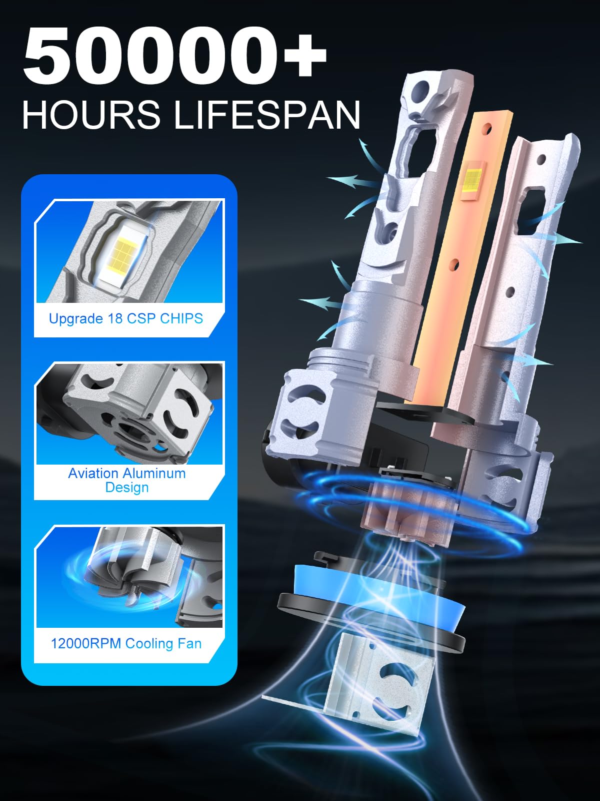 【50,000-Hour Lifespan】- 12,000 RPM silent fan + aviation aluminum heatsink dissipates heat faster. Military-grade chips ensure 50,000-hour lifespan—eliminates replacements