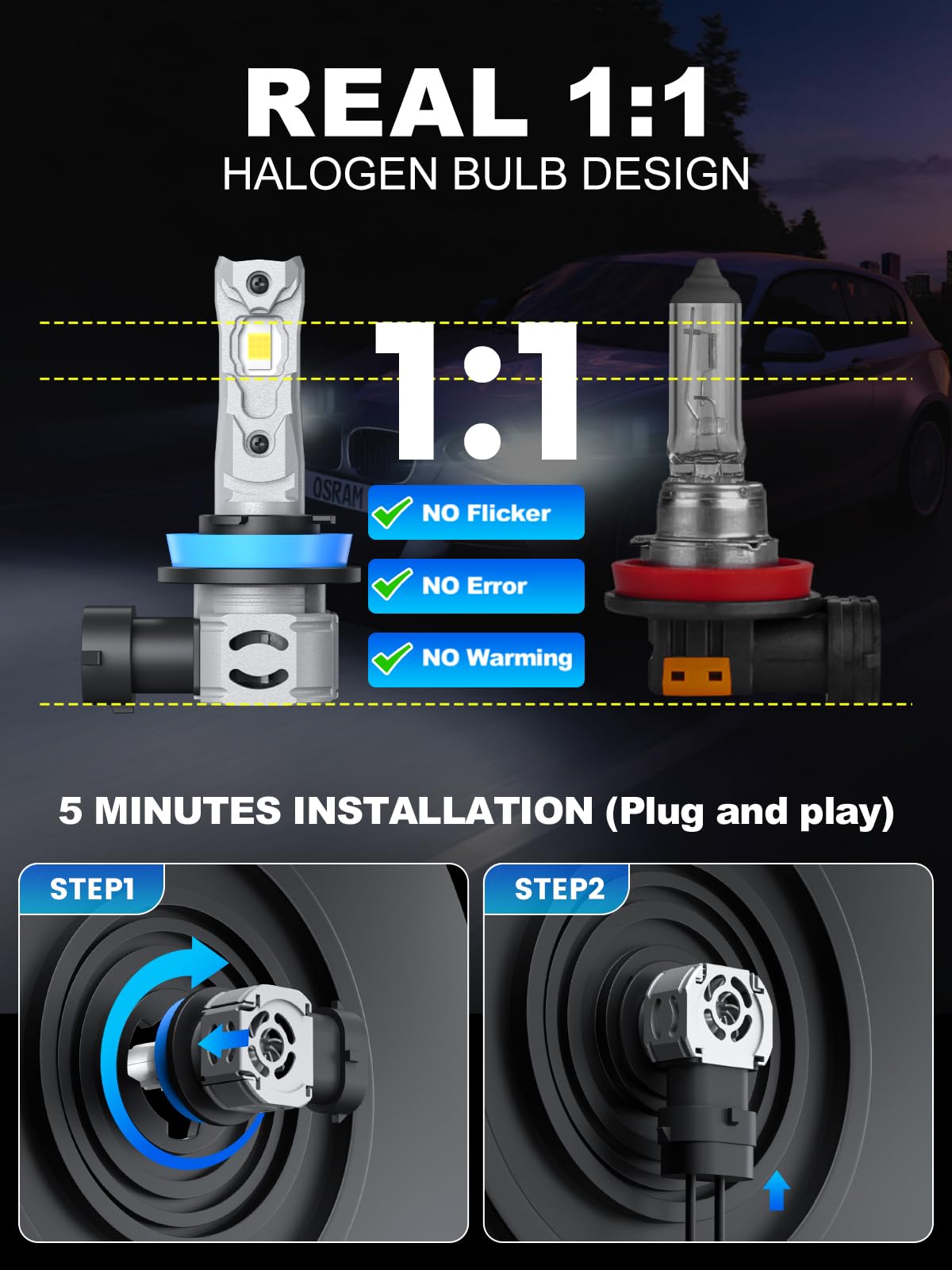 【True 5-Minute Installation】- Precision 1:1 halogen housing design—no adapters, wiring, or modifications. Genuine plug-and-play upgrade: Remove old bulb, insert rimthin H11 9005 bulb, secure. Zero technical skills needed