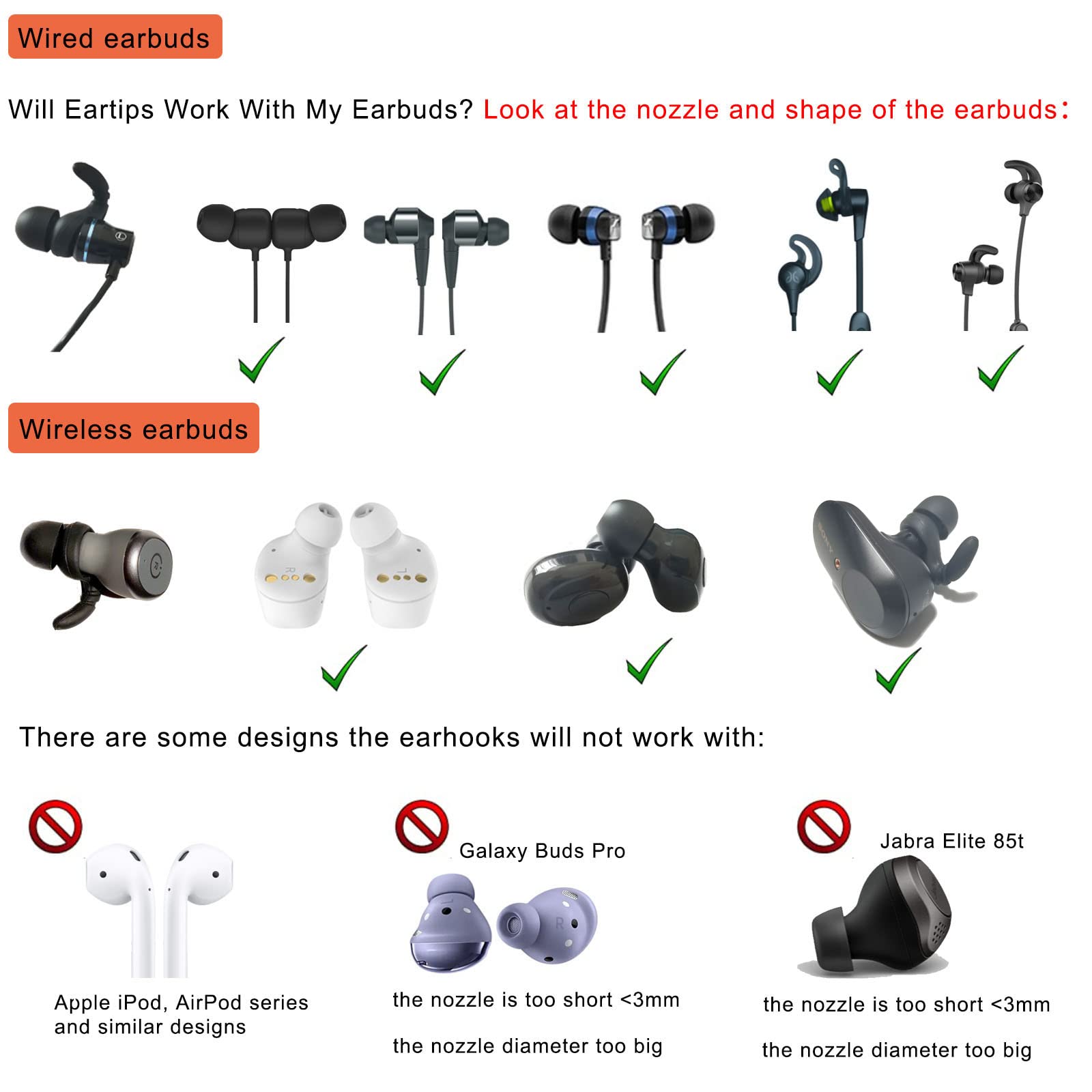 Tips: These earbuds replacement tips do NOT fit all earphone models. NOT compatible with Samsung Galaxy Pro series, Jabra 85t, and similar special-shaped nozzles. Please confirm your earphone nozzle size and shape before purchasing to avoid mispurchase. If your earbuds use a charging case, please remove the eartips before charging. It only takes 1 second. If the earphones feel loose when wearing, rotate the ear fin backward—they will lock firmly in place. ✔ Packing: 3 Pairs (6 Pcs), ONE SIZE medium, black. ✔ Fit most wired & wireless Bluetooth sports earbuds with standard round nozzles. ✔ Fit earphone nozzles with diameter 4mm–6mm and nozzle length greater than 3mm. Please measure your earphone nozzle before ordering. ✔ Adjust the ear stabilizers by rotating them on the earphones for a more secure, comfortable fit. ✔ Made of high-quality soft silicone for comfort, noise isolation, and stable listening experience.