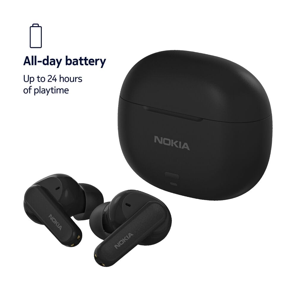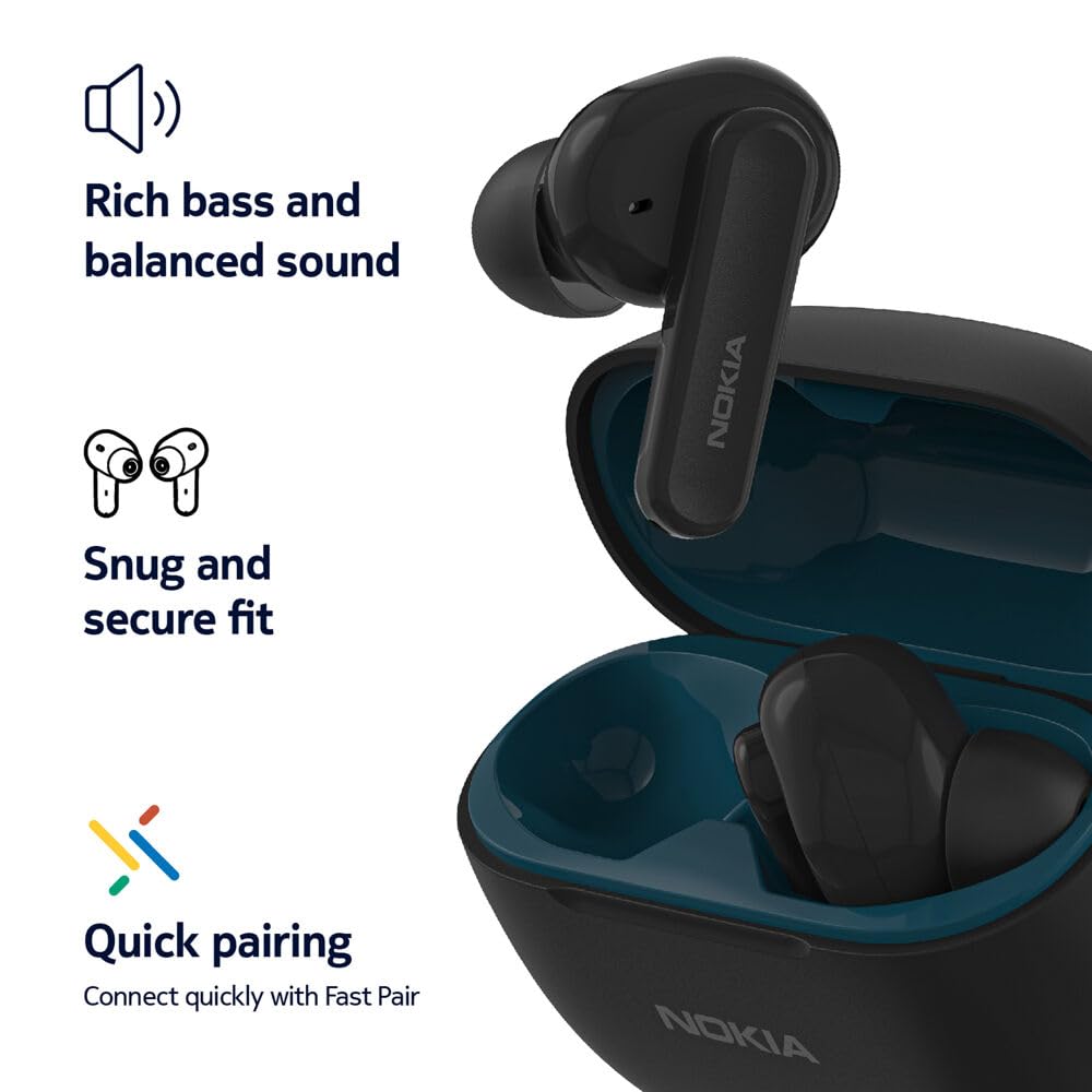 Experience seamless style, performance, and convenience with the Nokia Go Earbuds2 Pro. Get connected to all your favorite devices quickly and easily with the power of Fast Pair using Bluetooth 5.2 technology. These cutting-edge wireless earbuds are designed to enhance your daily routine, offering an exceptional listening experience, advanced features, and a sleek profile that complements your modern lifestyle. Equipped with 10mm dynamic drivers, they provide a rich bass and balanced sound, perfect for music, gaming, and videos. Low latency mode reduces lag so that you won't miss a beat. Whether you're grooving to your favorite tunes, catching up on podcasts, or enjoying immersive gaming sessions, Go Earbuds2 Pro ensures an unparalleled auditory journey. Take calls wherever you are. With Environmental Noise Canceling technology, background sound from your surroundings is reduced, so there is no need to shout over the noise. Navigate your audio journey easily with intuitive touch controls on each earbud. The ergonomic design of the Nokia Go Earbuds2 Pro ensures a secure and comfortable fit, even during extended wear. The lightweight construction and soft ear tips adapt effortlessly to the shape of your ears, providing a snug seal that minimizes sound leakage and maximizes audio quality. Wear them without discomfort during your morning jog, daily commutes, or marathon work sessions. Whether on a long journey or a demanding workday, enjoy up to 24 hours of playtime with the charging carry case so your audio experience remains uninterrupted. With the Nokia Go Earbuds2 Pro, immerse yourself in a world of exceptional sound and redefine your wireless audio journey.