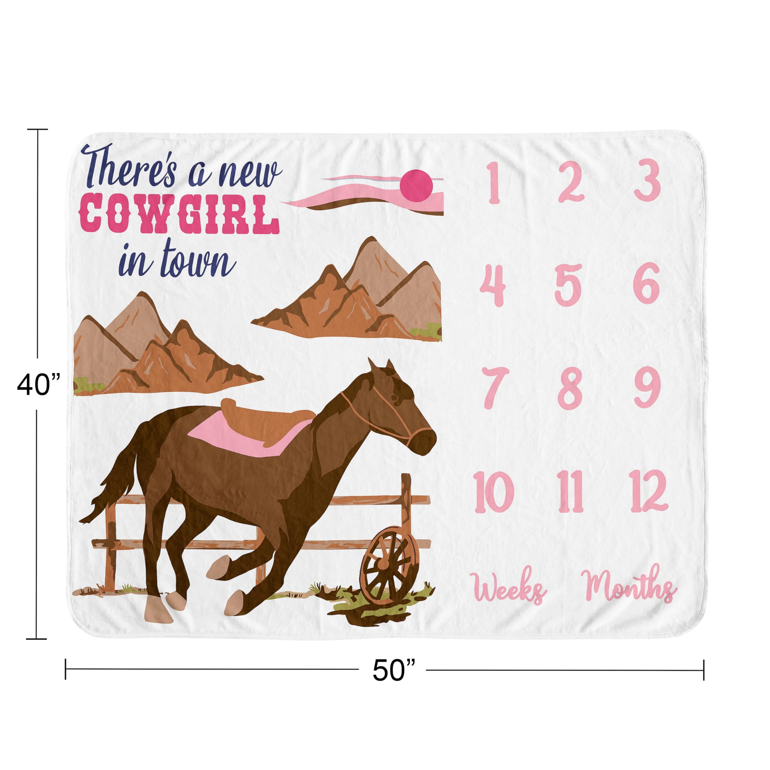 100% plush minky fleece featuring a light pink, brown, beige, blue, cream, taupe, tan and off white mountains wild west vintage country retro animal horse southwest western cowgirl print with an inspirational "There's A New Cowgirl In Town" quote.