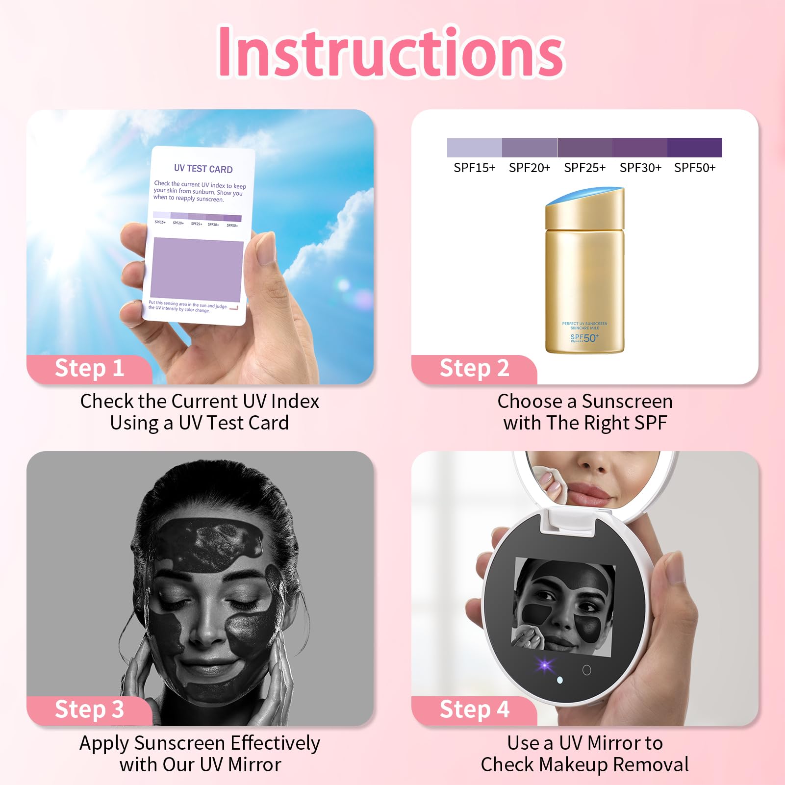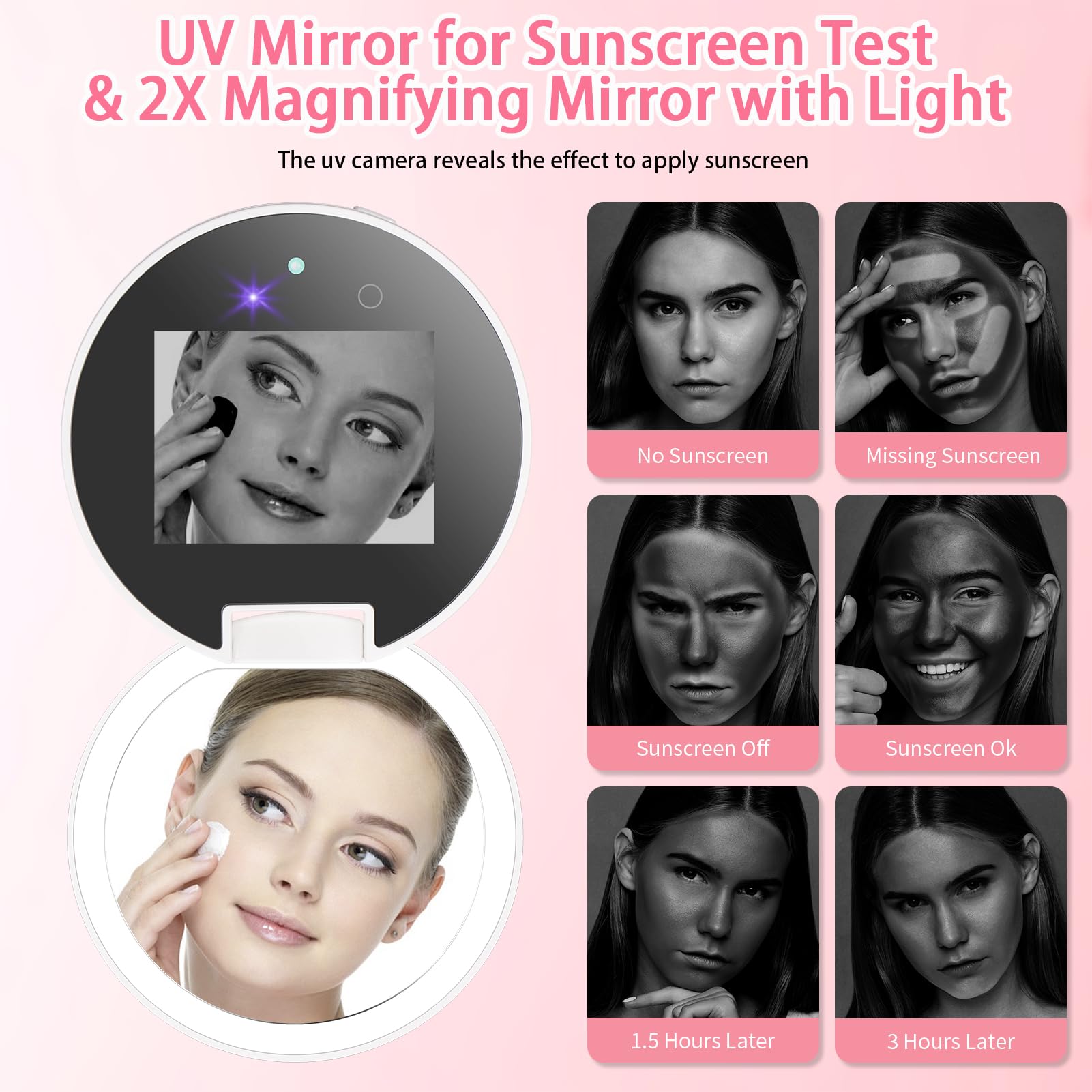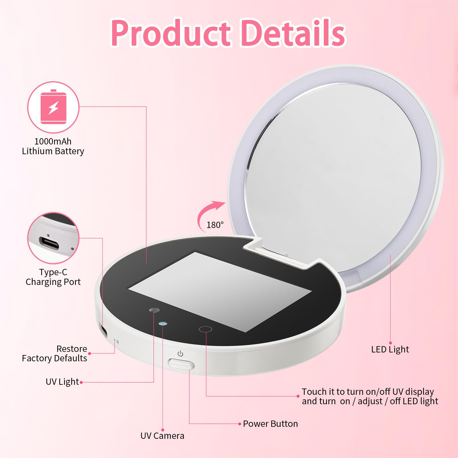 2x Magnifying Mirror with lights: The double-sided travel makeup mirror with lights and magnification has a built-in ring LED lights. The mirror magnifying with light has two levels of light brightness, allowing you to see your face more clearly even in a dim environment, which is very convenient for you to put on makeup in low light conditions, and you can achieve perfect makeup effects in any occasion. * PLEASE NOTE: The UV Camera for Sunscreen Test shows sunscreen as black, making it more suitable for people with fair, yellow, or brown skin tones. It may not be ideal for those with darker skin tones. We apologize for any inconvenience