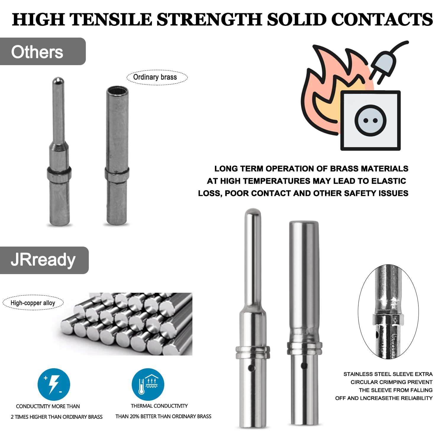【SOLID CONTACTS】 made of high copper alloys material, better conductivity and thermal conductivity than brass,which can better reduce the temperature rise, work with 20-16 AWG wires for 13 Amp continuous power.