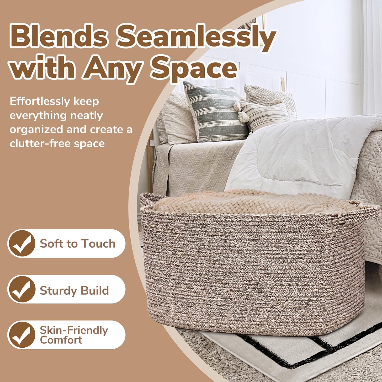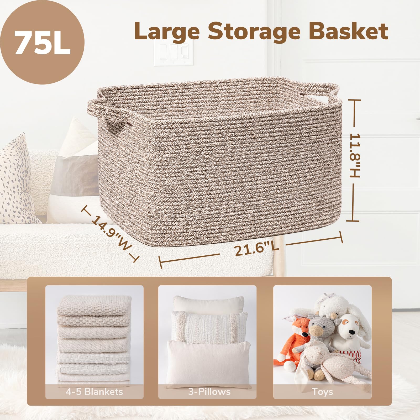 Extra Large Blanket Basket: measures 21.6" Lx 14.9" Wx 11.8" H with a 75L capacity, providing ample space for 4-5 throw blankets, 3 big pillows, or 2 quilts. Keep your home organized