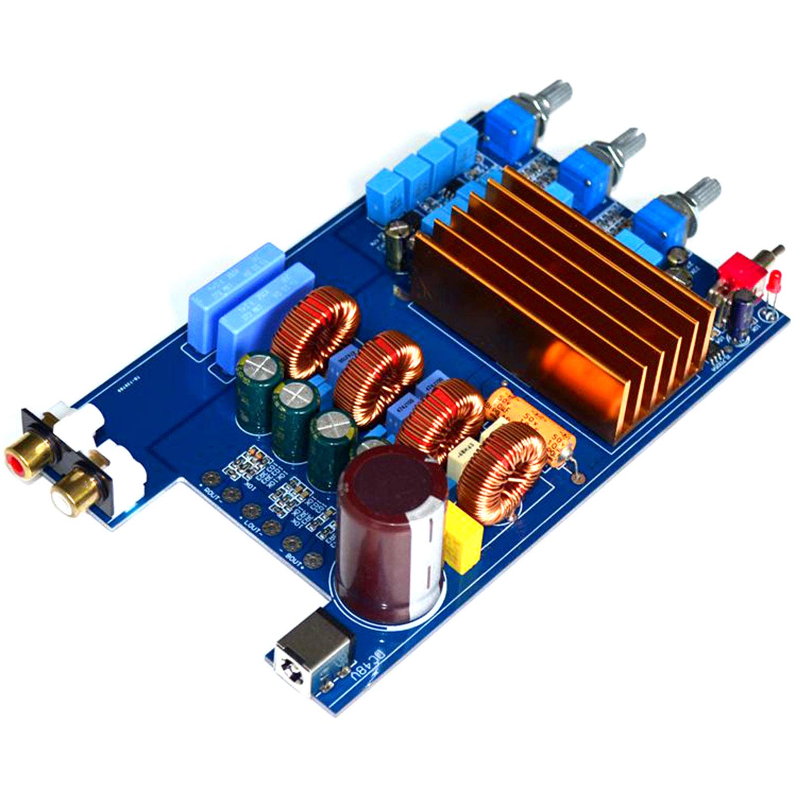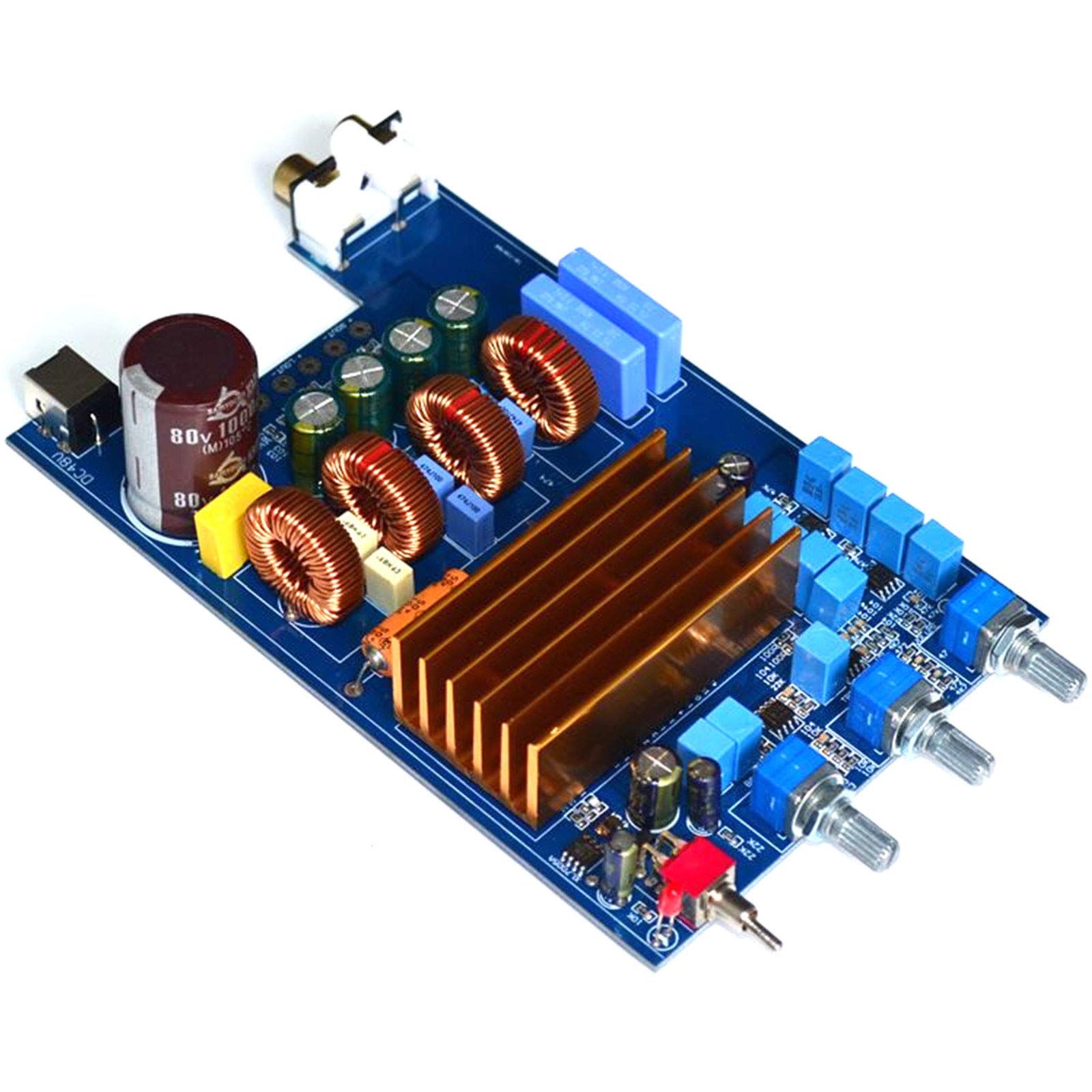 TPA3255 300W+150W+150W class D Digital 2.1 power amplifier board HIFI DC30V-48V The TPA3255 is a high performance Class D power amplifier with Class D efficiency and true to high-end sound quality. The device features an advanced integrated feedback design and proprietary high-speed gate driver error correction (PurePathTM Ultra HD). This technology allows the device to maintain ultra-low distortion throughout the audio band while delivering perfect sound quality. Original TPA3255 The main filter electrolytic capacitor uses 1000UF/80V to ensure a strong and continuous power support. The red-ash ring high-current inductor is used to ensure the sound is crisp and powerful. The PCB adopts 1.6mm thick double-sided sheet, 2.0 oz copper thickness, and the whole process of tin-spraying ensures the good passing performance of the current. First-class PCB quality. Parameters: Working method: Class D Working voltage: DC30V-48V Size: 150*95*35mm Net weight: 0.2KG Total output power at 1% total harmonic distortion + noise (THD+N) 240W/4Ω, bass output 120W/4Ω, left and right channel output Total output power at 10% total harmonic distortion + noise (THD+N) 325W/4Ω, bass output 150W/4Ω, left and right channel output Knob function: bass adjustment, treble adjustment, volume adjustment (from left to right) Package: 1pcs TPA3255 power amplifier board