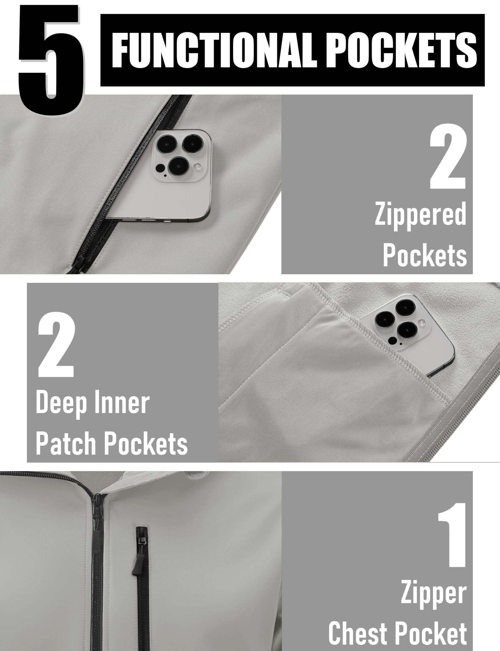 5 FUNCTIONAL UTILITY POCKETS - Men's tactical hiking jacket includes 2 inside roomy pockets, 2 zipper hand pockets and 1 zipper chest pocket, providing great convenience for storing money, keys, phone, wallet etc