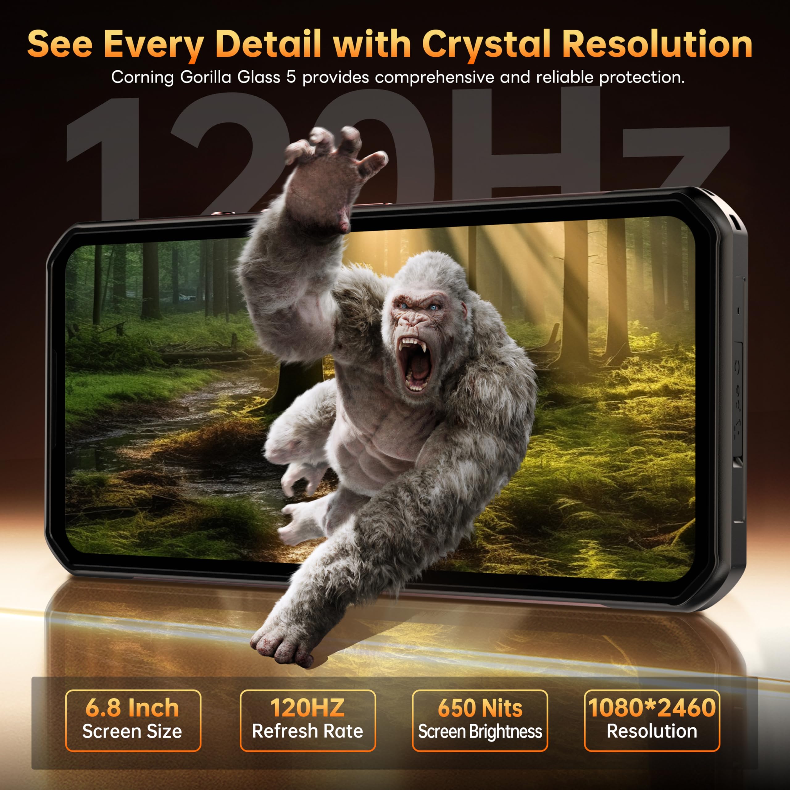 [120Hz 6.8-inch FHD+ Display & Corning Gorilla Glass] The OUKITEL WP300 waterproof smartphone features a striking 6.8-inch oversized display with ultra-clear 2460x1080 FHD+ resolution, rendering exceptionally detailed and sharp visuals; while the 120Hz high refresh rate delivers ultra-smooth operation—whether scrolling interfaces, gaming, or video playback—and the screen is fortified with Corning Gorilla Glass 5, significantly enhancing scratch and drop resistance, backed by IP68/IP69K/MIL-STD-810H certification to provide reliable protection even in demanding outdoor conditions