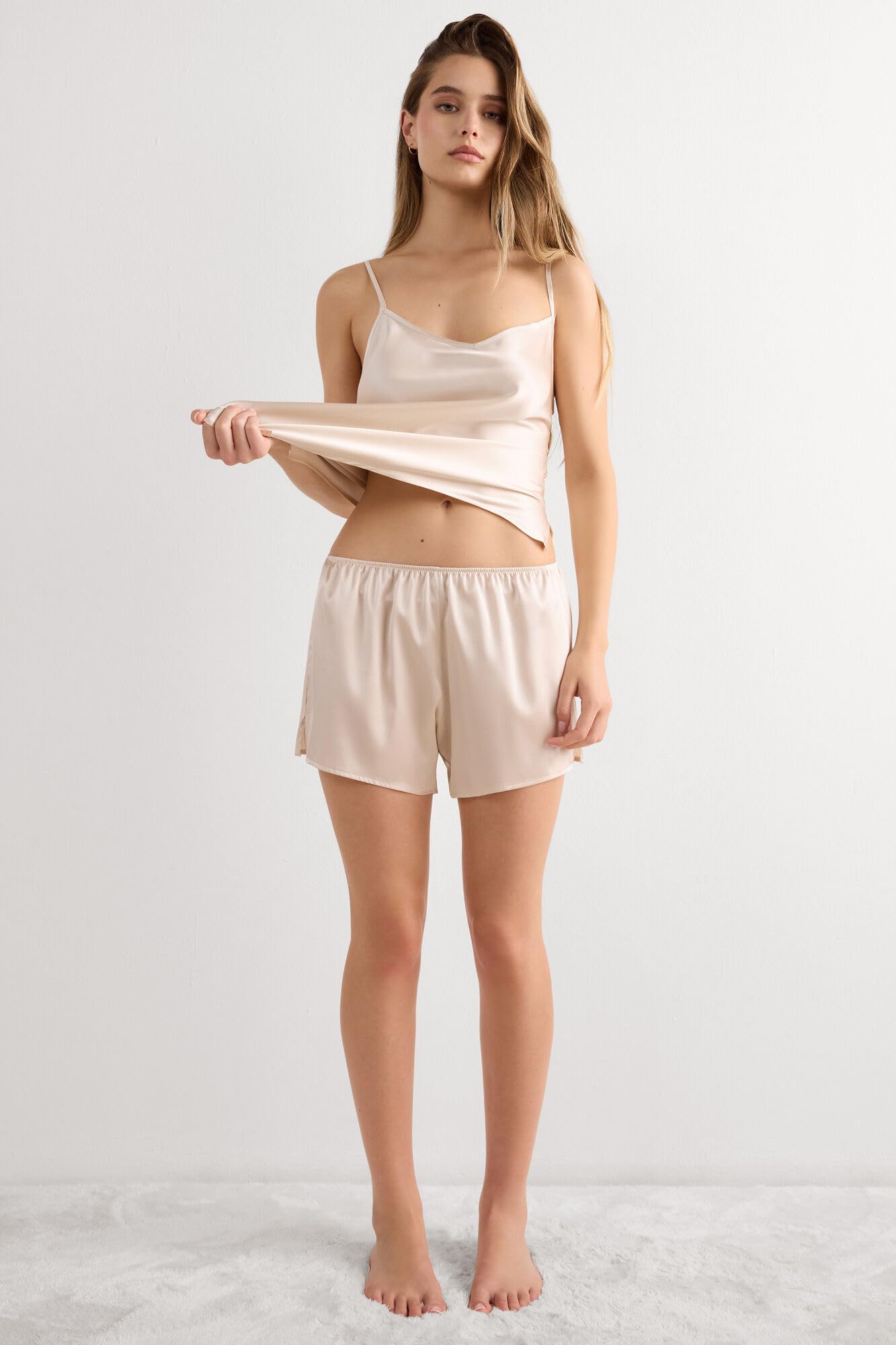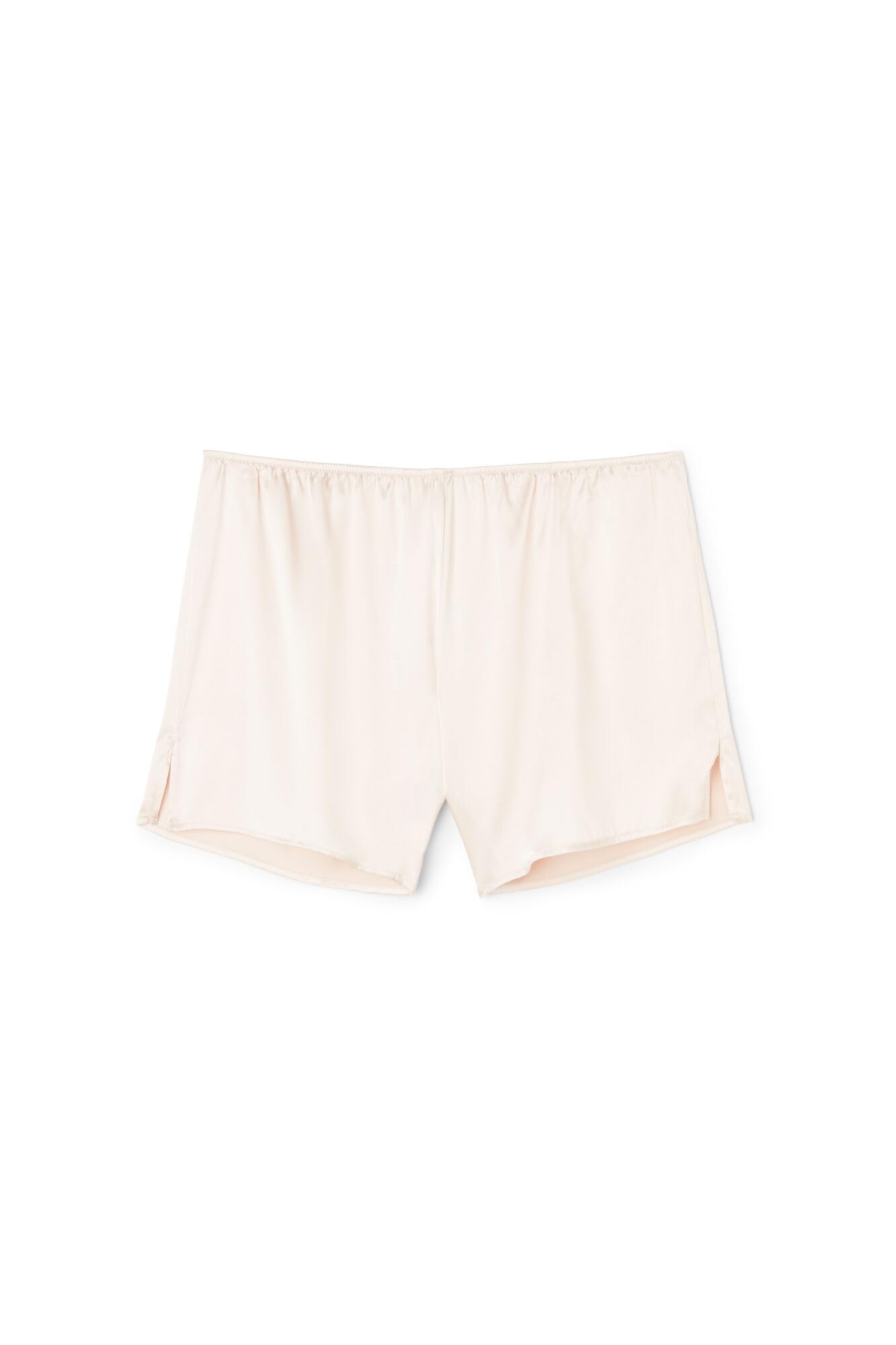 Description Shorts in light stretch silk satin with small side slits. Ideal to wear as a refined pair of shorts for night or as elegant loungewear.