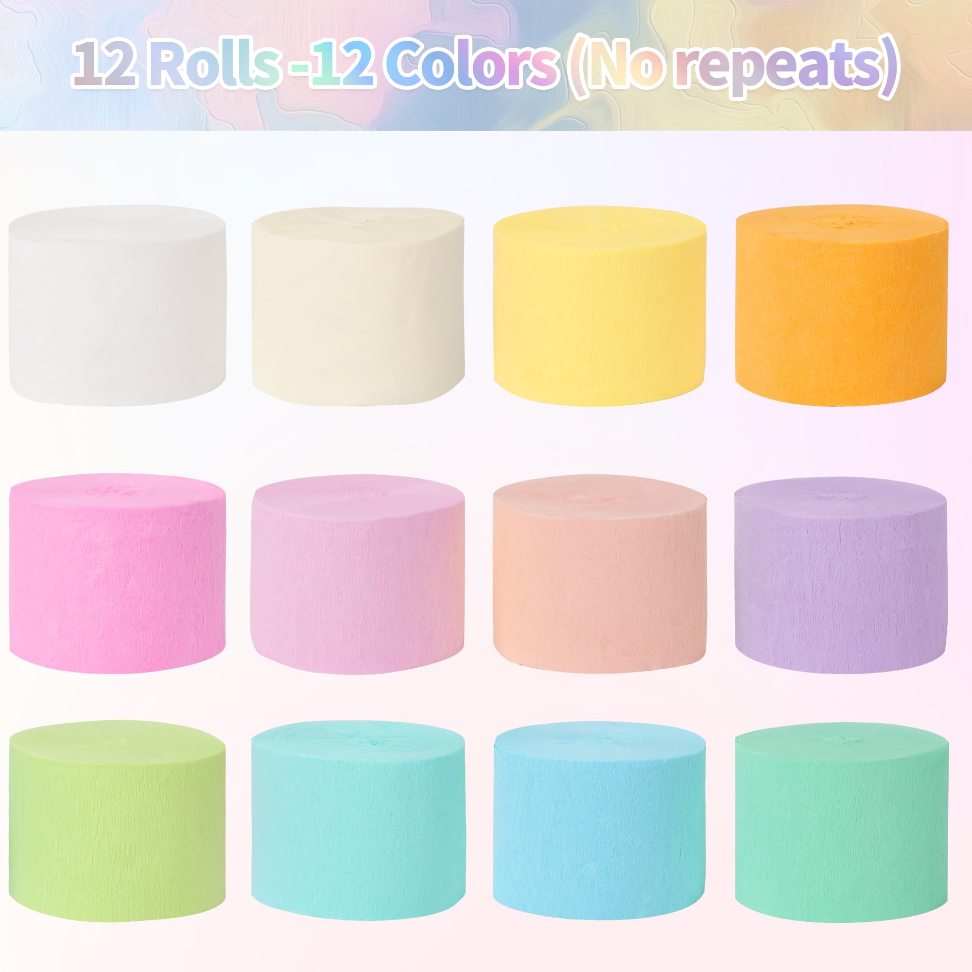 Size And Color: The width of each roll of pastel streamers is 1.77 inches and the length is 82 feet. The 12 colors are light pink, light purple, peach, light yellow, light green, light blue, sky blue, mint green, white, ivory, light orange, water pink.