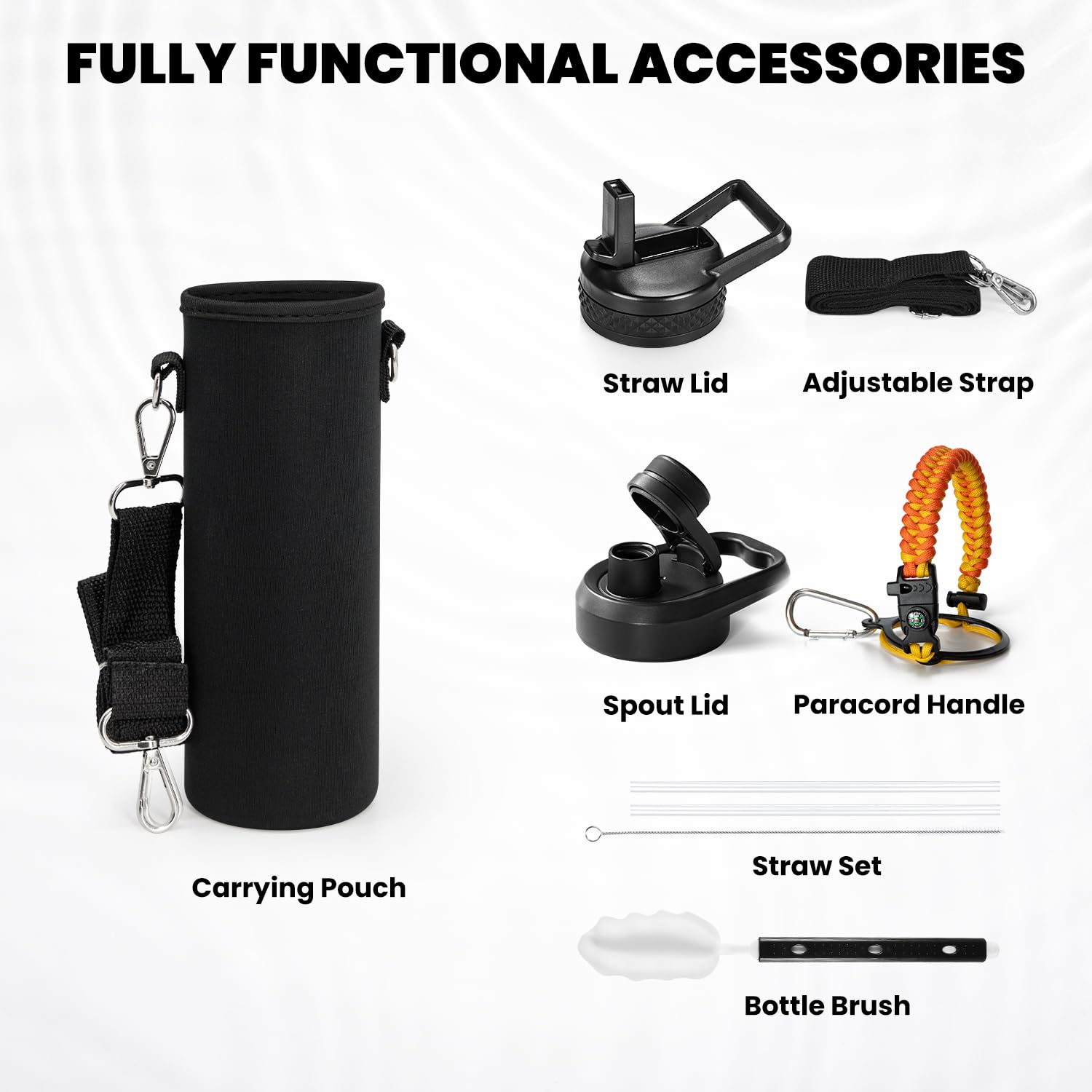 What You'll Get: We offer Continuous After-sales Service and 100% customer satisfaction against any leakage or insulation failure. You purchase contains: RAYMYLO Water Bottle, Carrying Pouch, Straw Lid with 2 Straws & Straw Brush, Spout Lid, Paracord Handle, Bottle Brush
