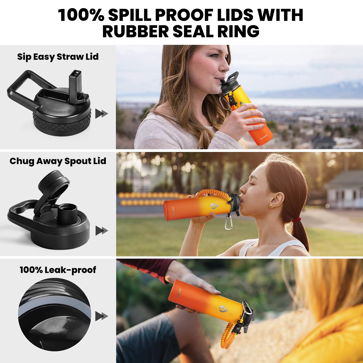 Full Seal Leak-proof Lids: All scenario spout and straw lid with rubber seal ring ensures not a single drop leaks no matter how bumpy your journey gets.Straw lid allows for a quick refreshment without stopping you, while spout lid is great for proper hydration whenever you feel like a boost.Keeps your drinks fresh and spill-resistant on the go