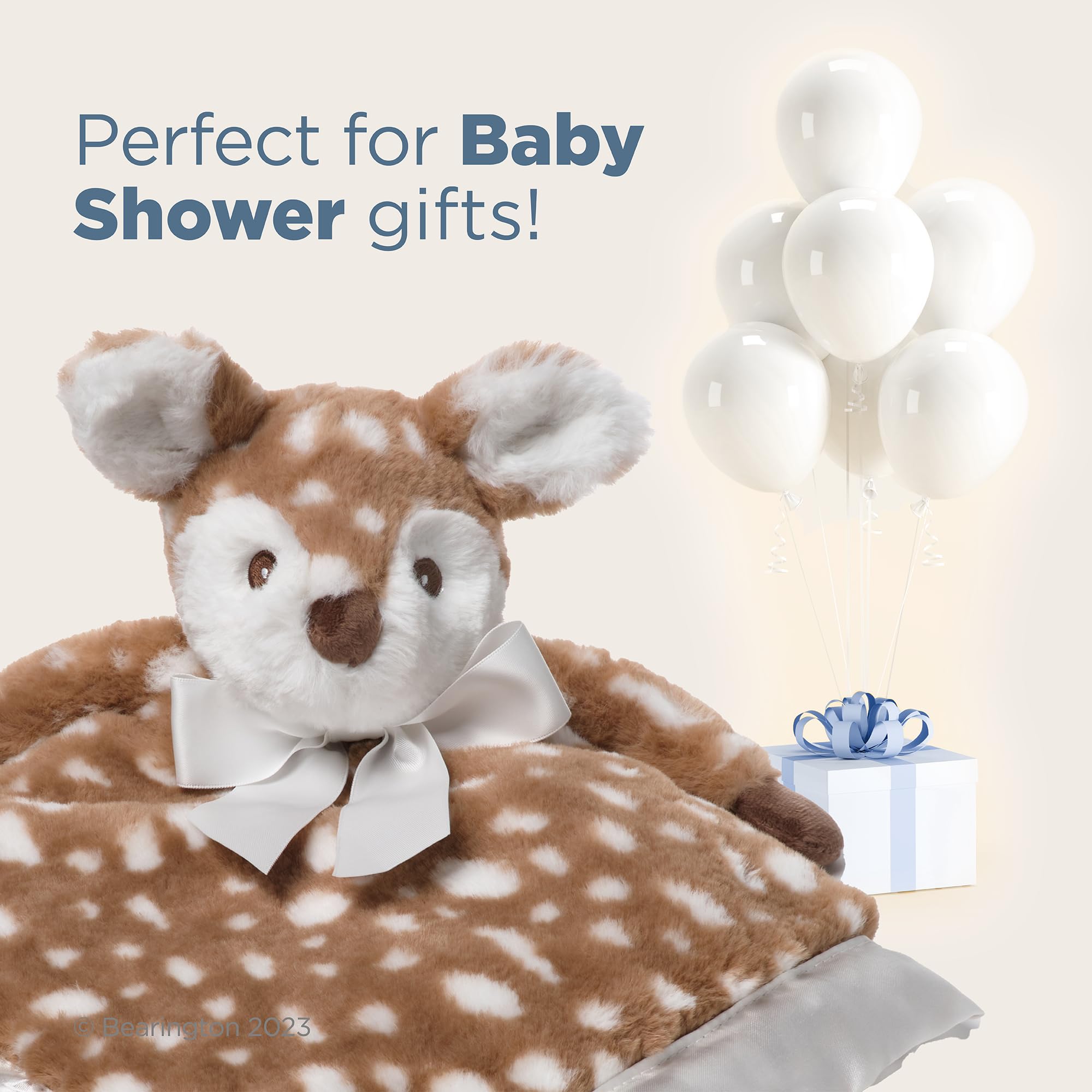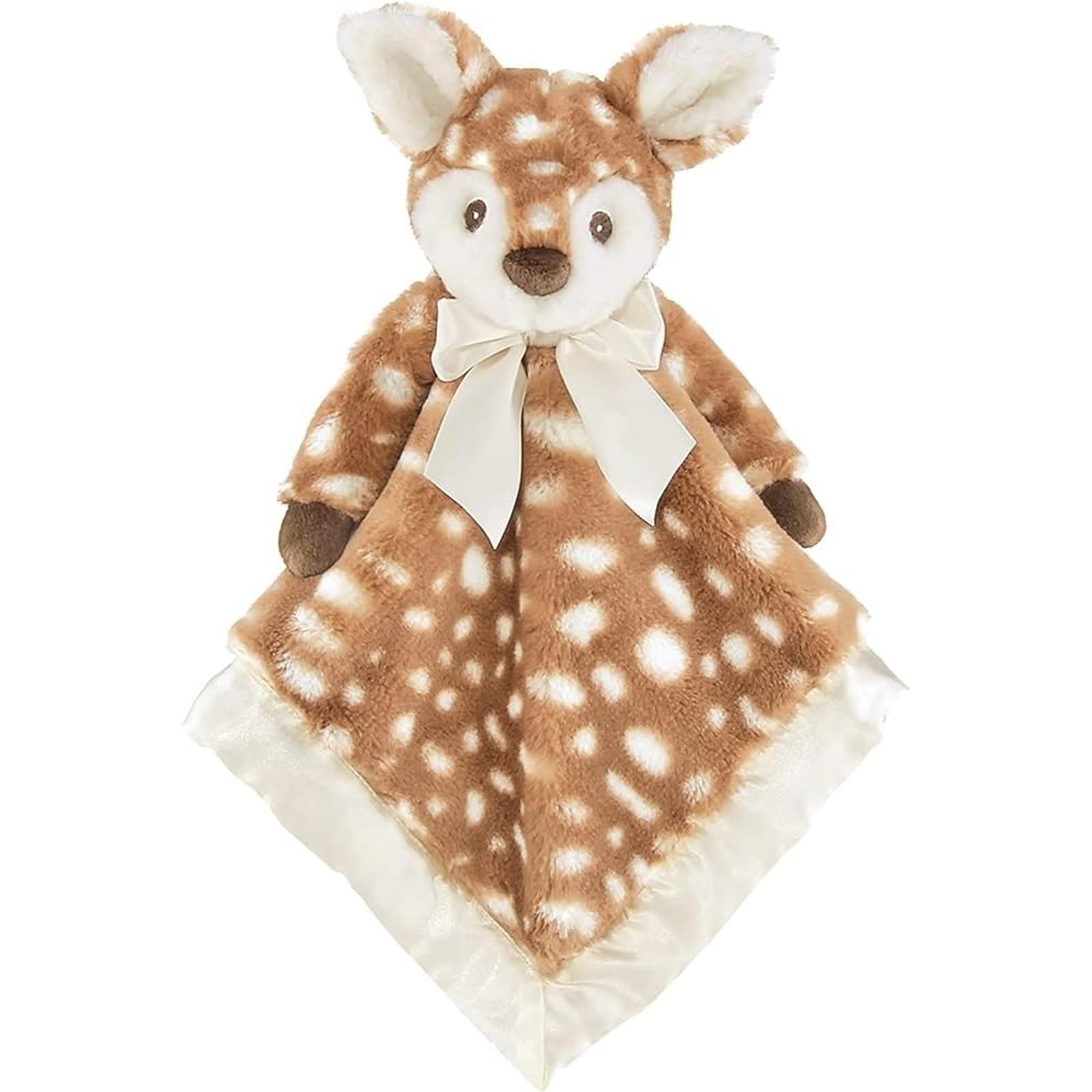 PLAYFUL DESIGN: This baby lovey blanket boasts a sweet deer head and arms that are sure to melt your heart. The silky satin trim adds a touch of luxury, framing the plush fawn beautifully, complemented by embroidered safety eyes that ensure a safe and huggable playtime. Complete with a satin bow, this baby security blanket with stuffed animal is an irresistible buddy for your little one's adventures and bedtime snuggles.