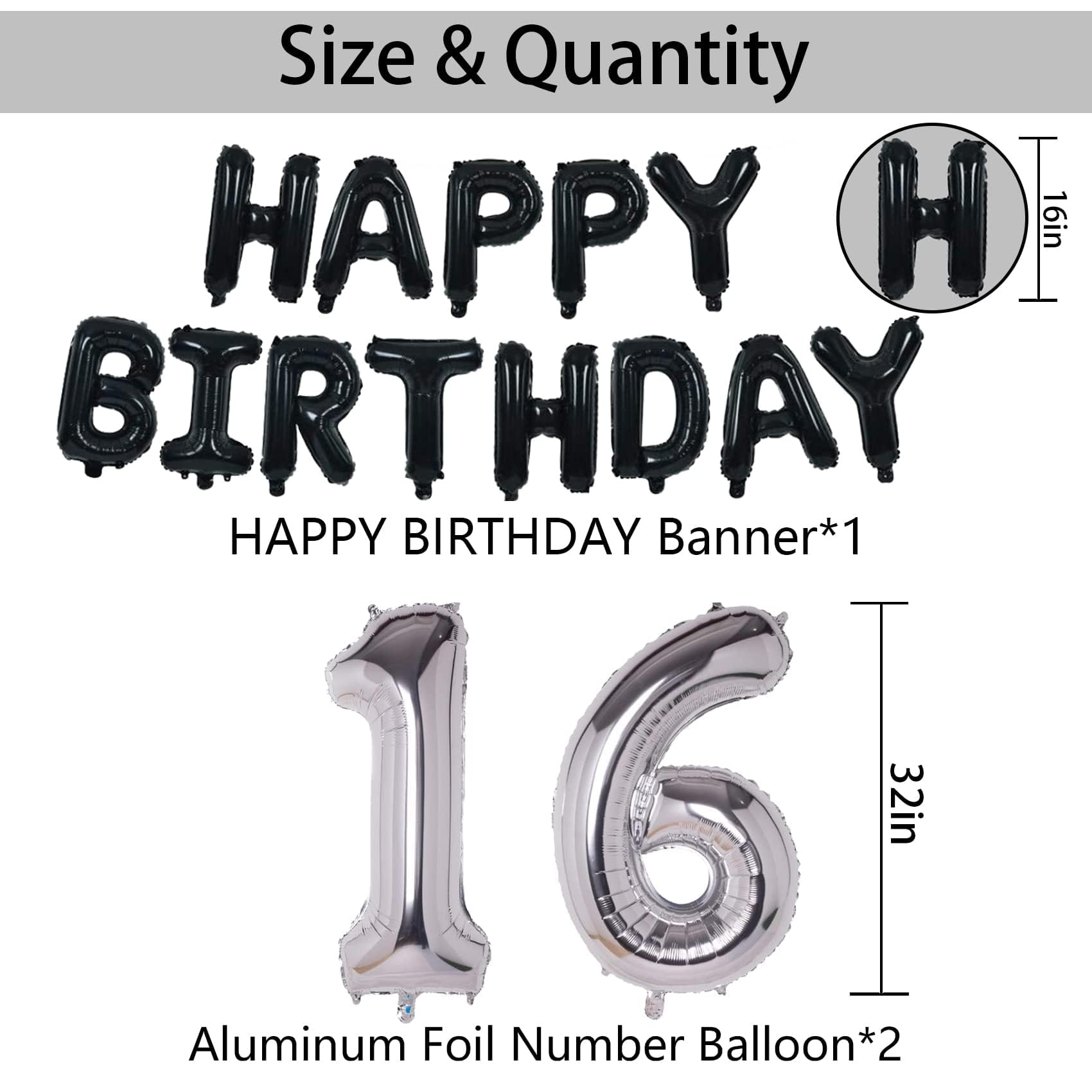 ►WHAT OUR KIT INCLUDES◄: This mysterious 16th happy birthday balloons decor package includes ‘HAPPY BIRTHDAY’ banner*1 set, number 16 foil balloons*2, star foil balloons*2, black latex balloons *12, silver latex balloons *10, silver confetti balloons*4, which will meet all your needs