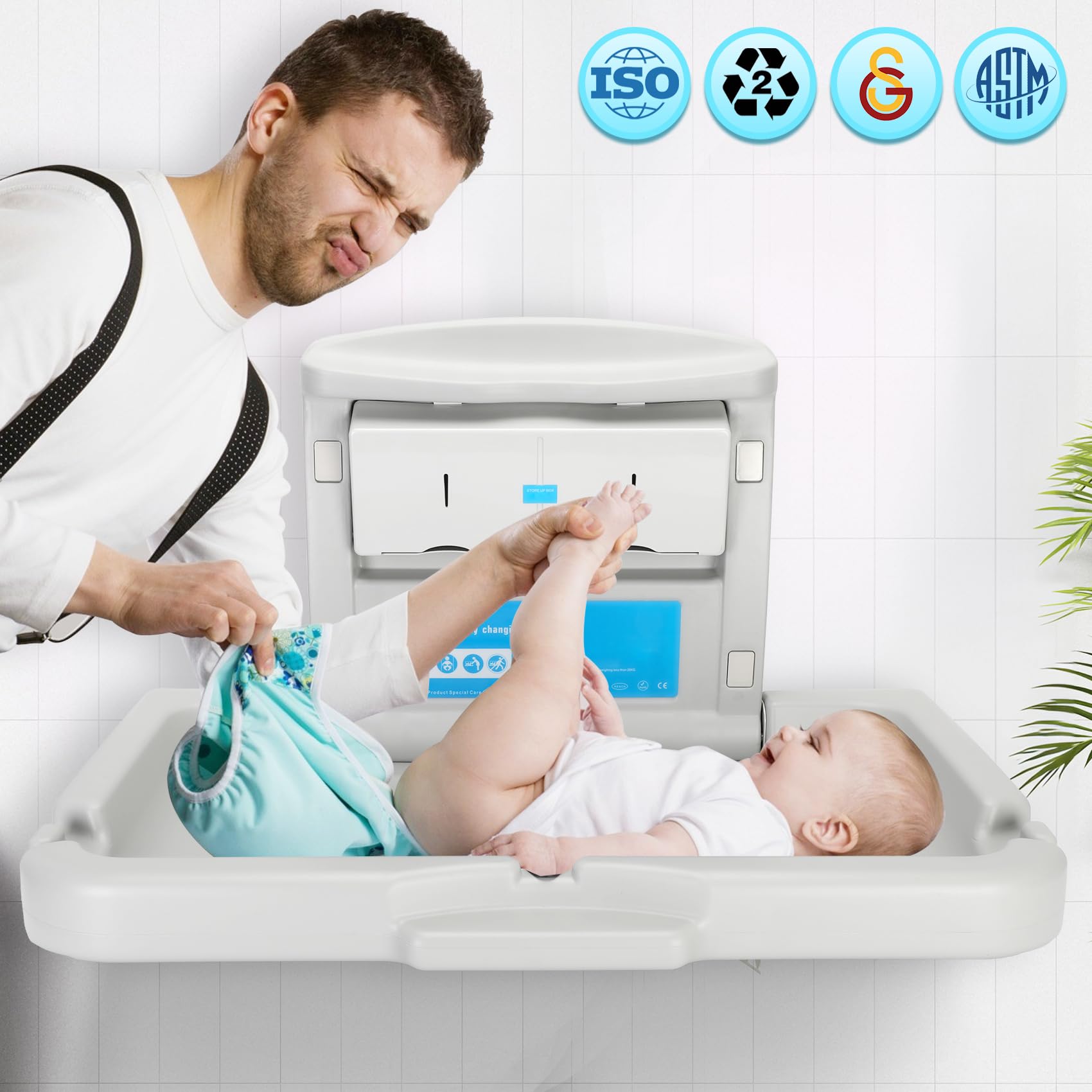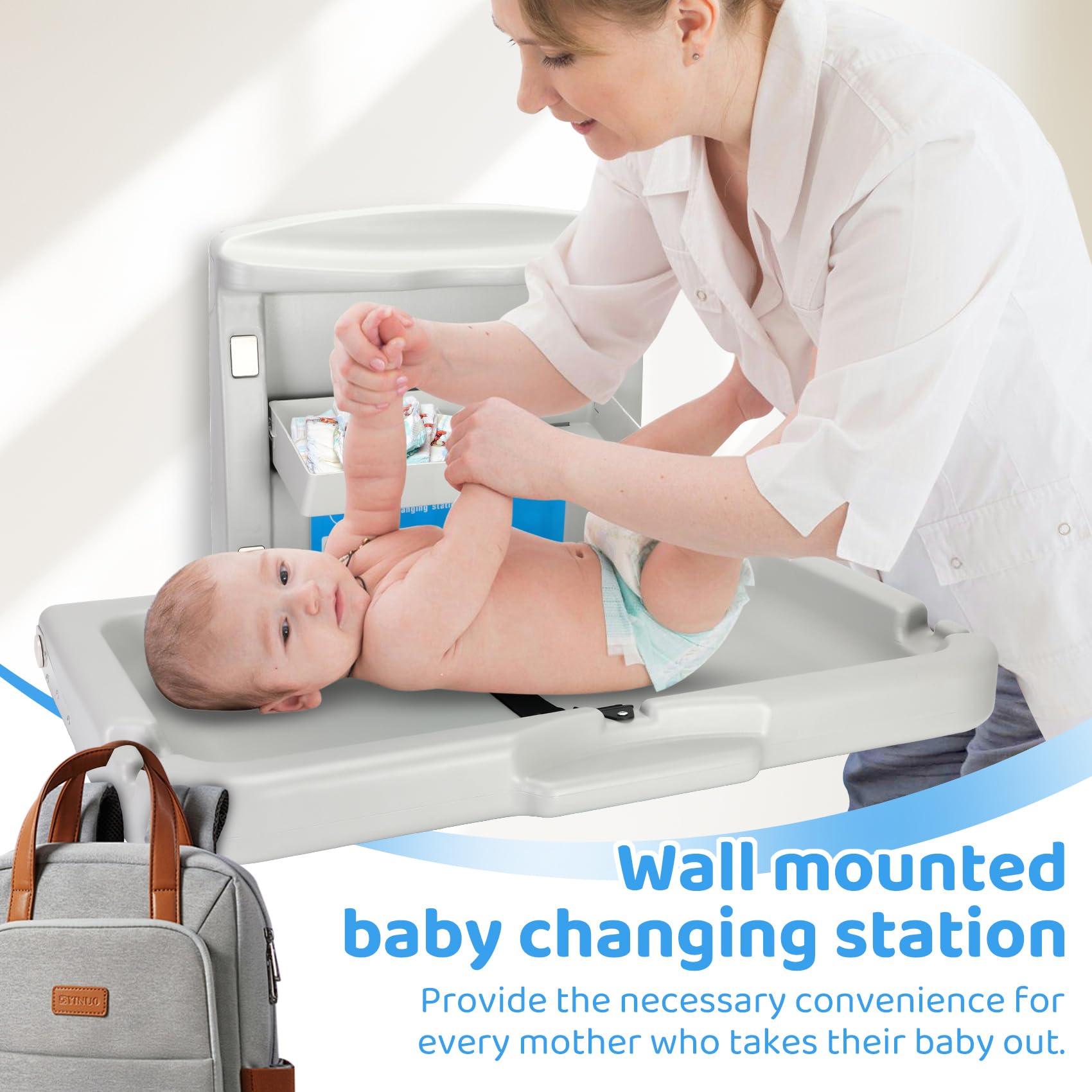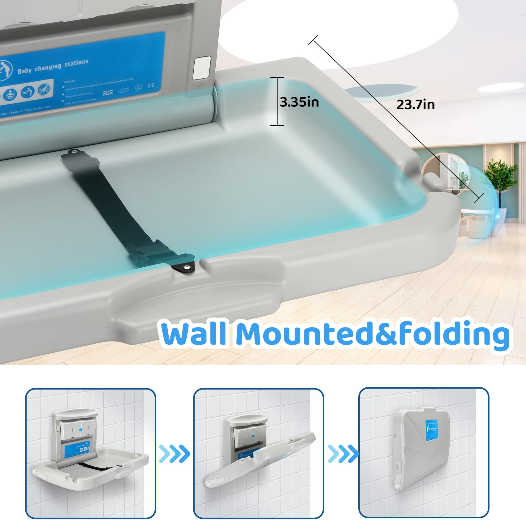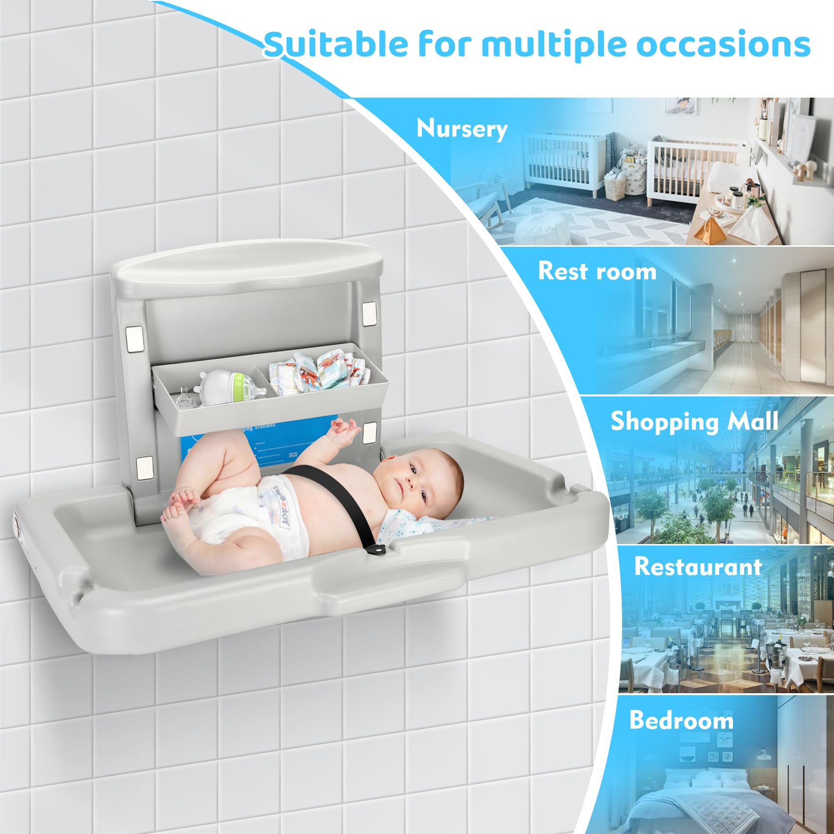 Widely used: The baby changing station is very suitable for commercial and family places, with easy installation and space saving. It is widely used in public places, baby rooms, shopping malls, airports, etc
