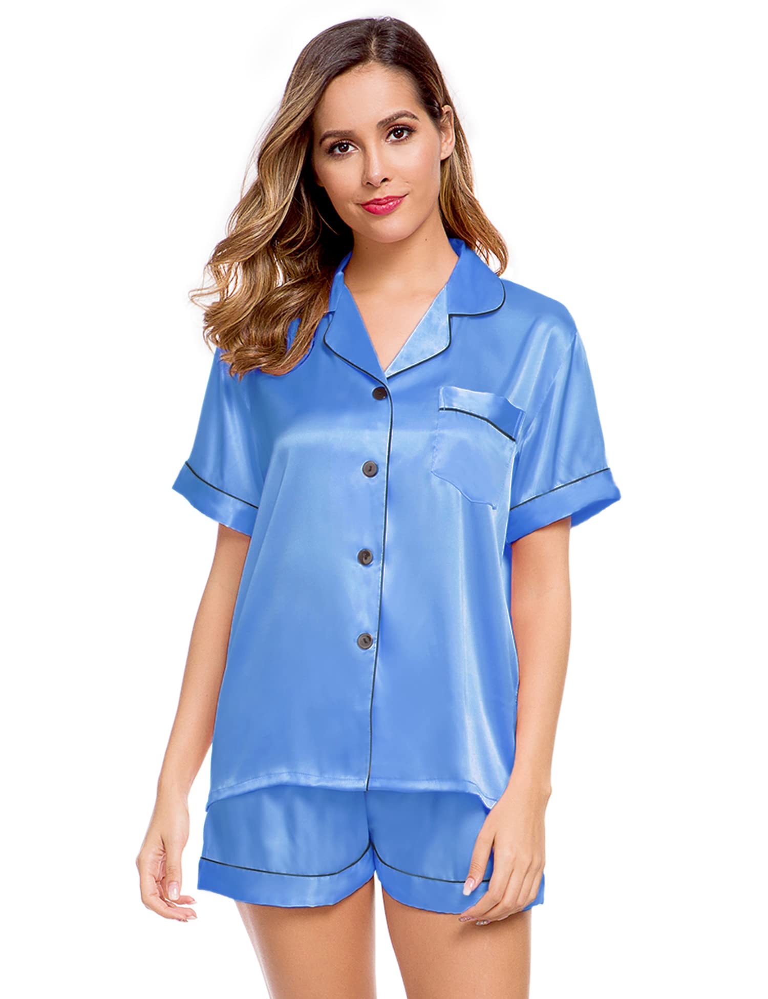 Features: The relaxed fit two-piece comfortable sleepwear pajama set features silky shorts with elastic waistband and matches a silky-smooth short-sleeve V-neck top with a chest pocket, notch collar and the button-front top hits at hips. The sleepwear set are soft and elegant, to giving you a lazy sleep.
