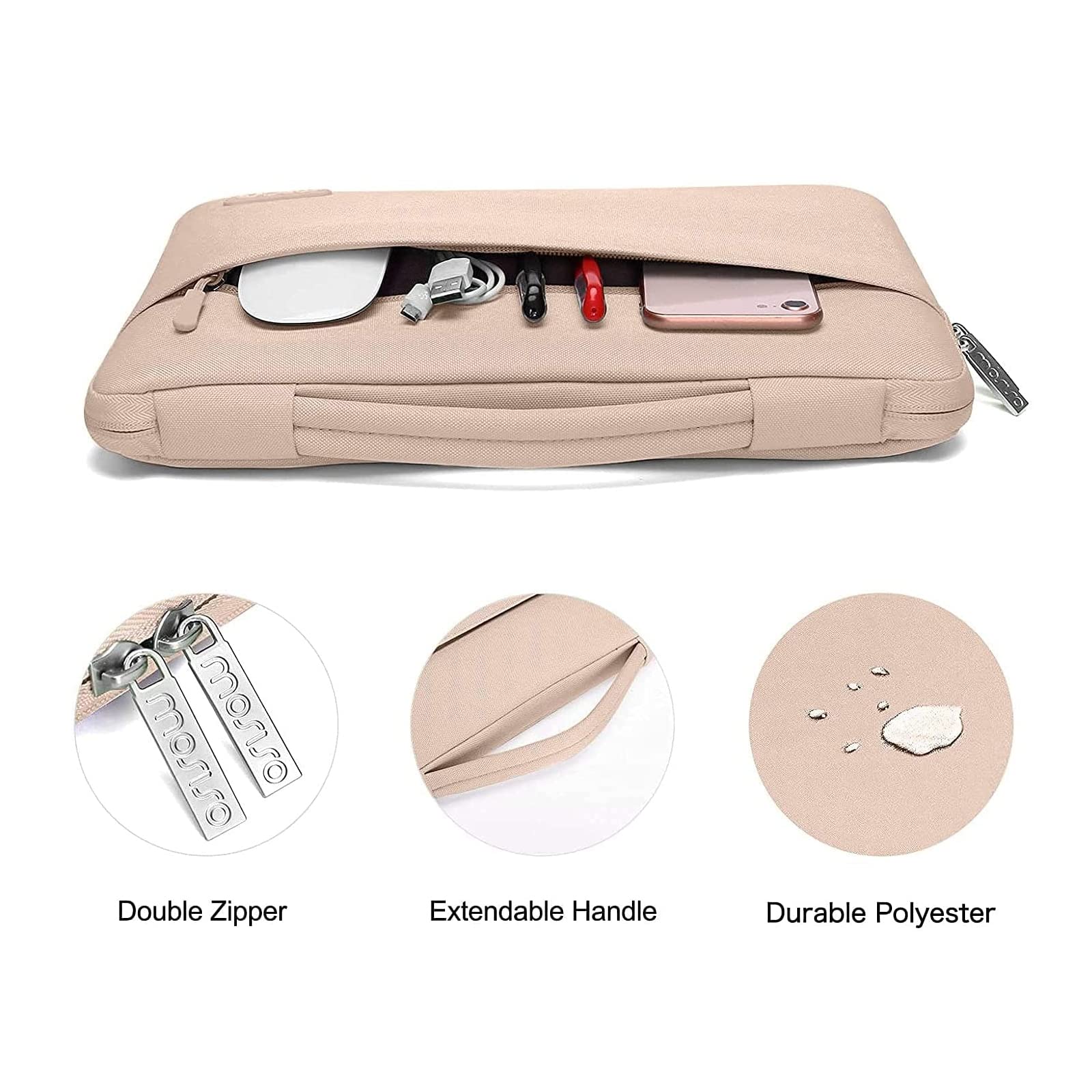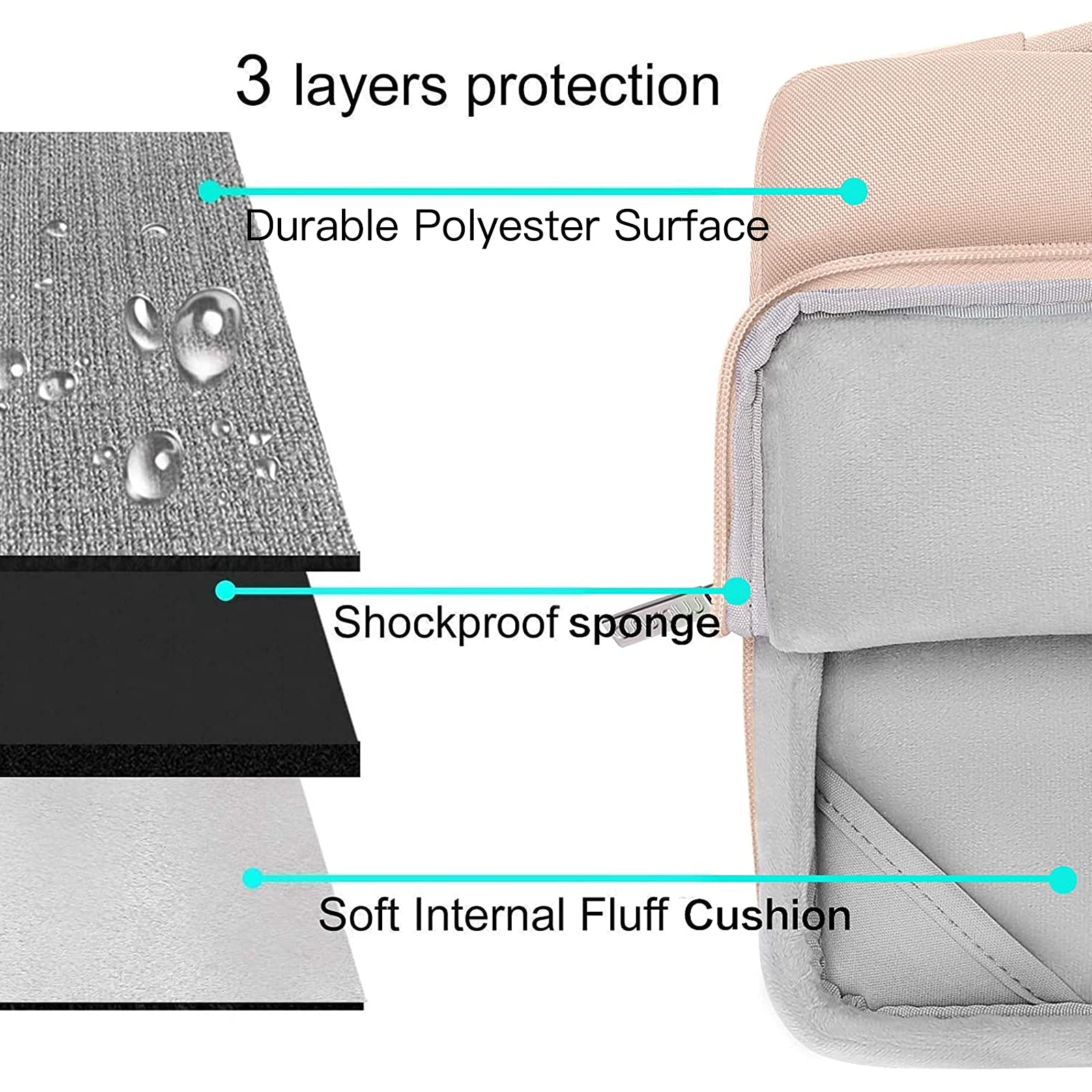 The 360 degree protective shockproof laptop sleeve with handle carrying bag internal dimension: 13.39 x 9.25 x 0.79 inches (L x W x H); external dimension: 13.98 x 9.84 x 0.79 inches (L x W x H). The front side pocket dimension: 11.61 x 9.25 inches (L x W). Made of polyester material, protect your laptop against accidental spills. Slim and lightweight, does not bulk your device up and can easily slide into your briefcase, backpack or other bag. Ideal for business, daily and travel.