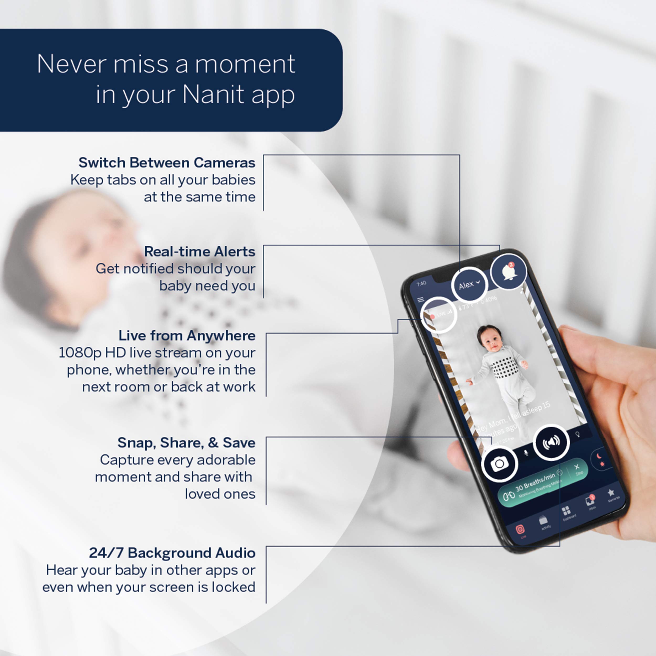 Real-time alerts sent to the Nanit Pro Camera and the app