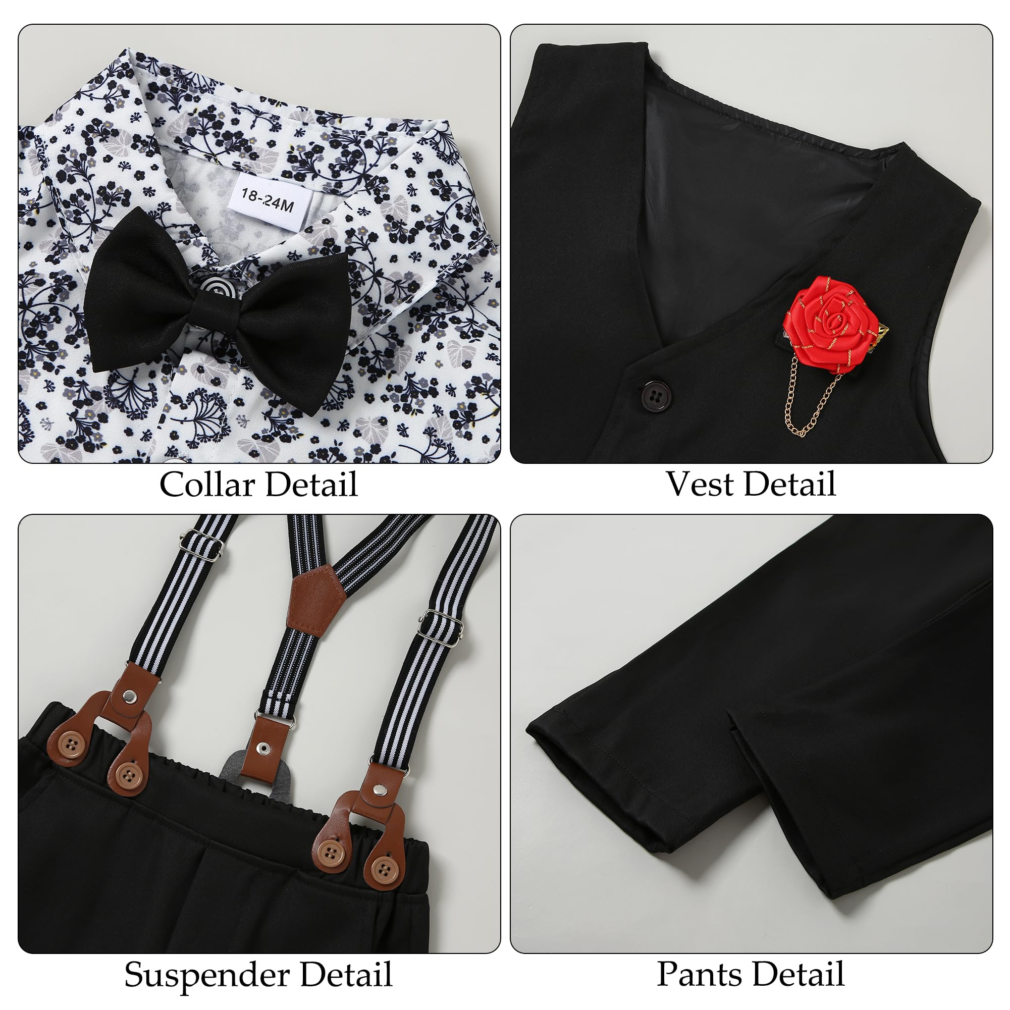 Design: Toddler boy dress clothes, classic color matching detachable bowtie and suspender pants. You'll never worry about how to match your cute boy!