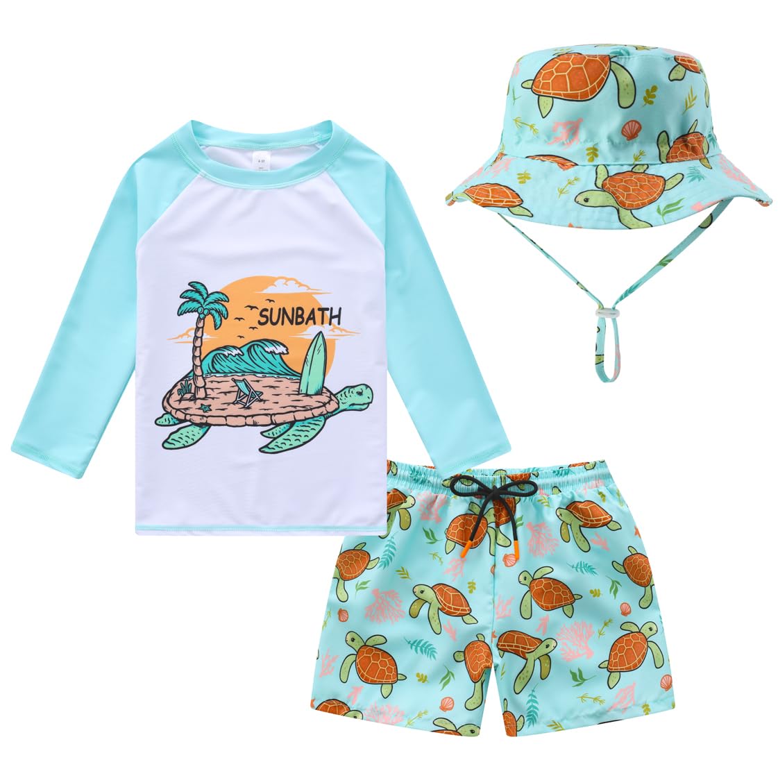 Includes one rashguard & one pair of swim trunks & sun hat