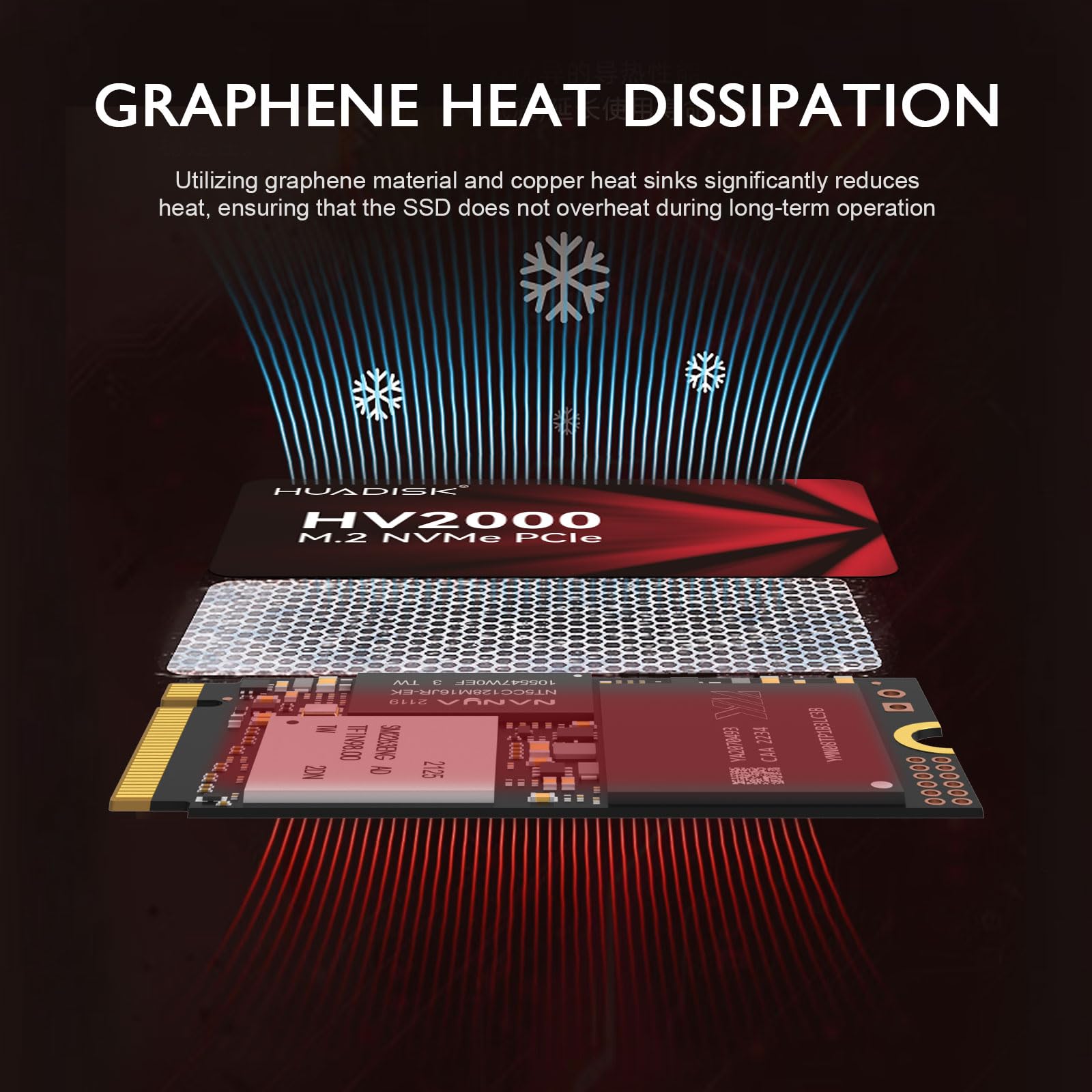 SSD Graphene Cool: Huadisk NVMe M.2 2242, can be diy as 2280 NVMe SSD, uses graphene cooling to stop overheating during heavy tasks like 4K editing, gaming, and large transfers, keeping performance stable and lasting longer.