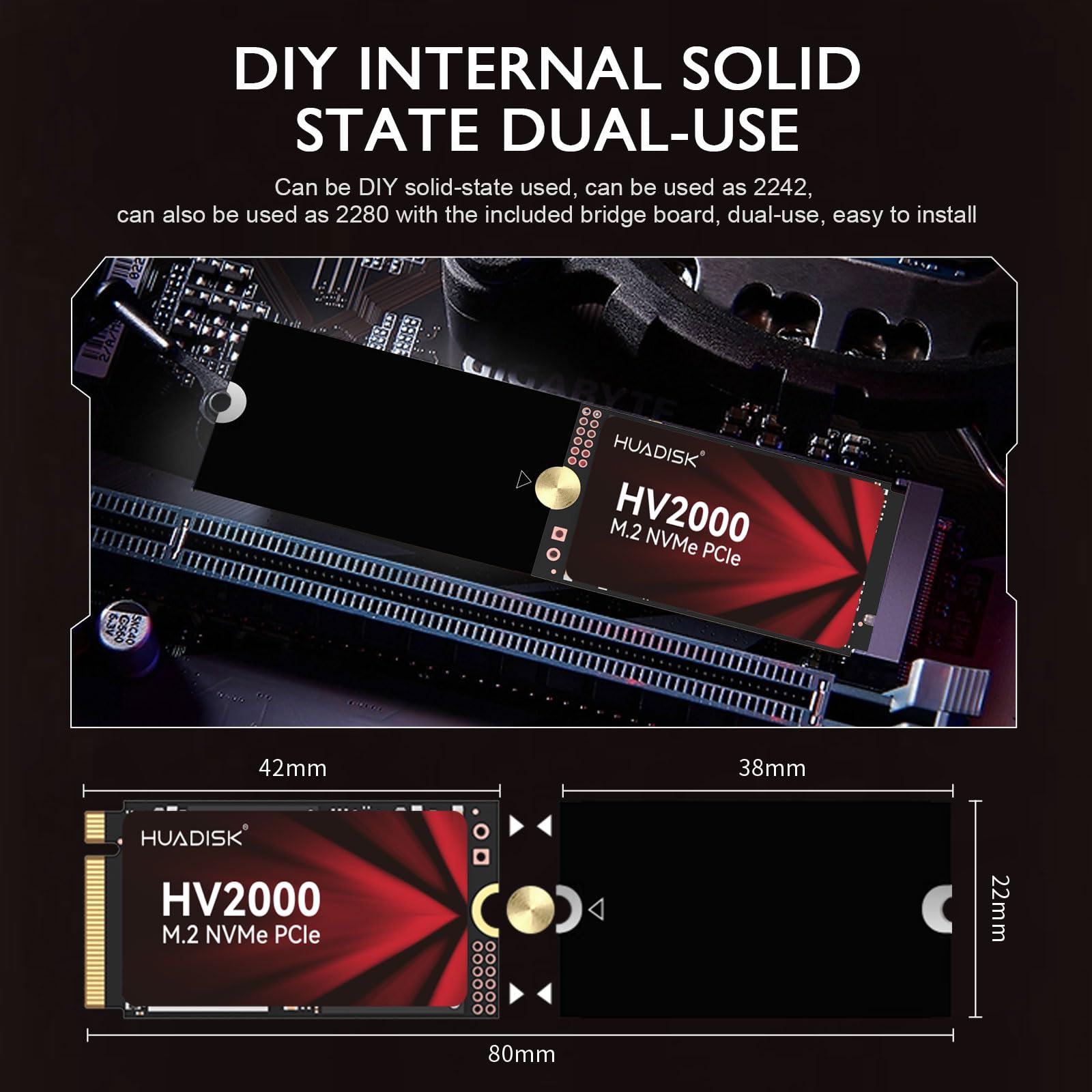 2 in 1 M.2 NVMe SSD : Huadisk 2242 M.2 SSD can be seamlessly upgraded to 2280 form factor using an extension board for effortless dual-slot compatibility. Seamlessly compatible with M.2 slots in single-board computers and laptops, including Raspberry Pi models. Without tools installation and uncompromised NVMe speeds