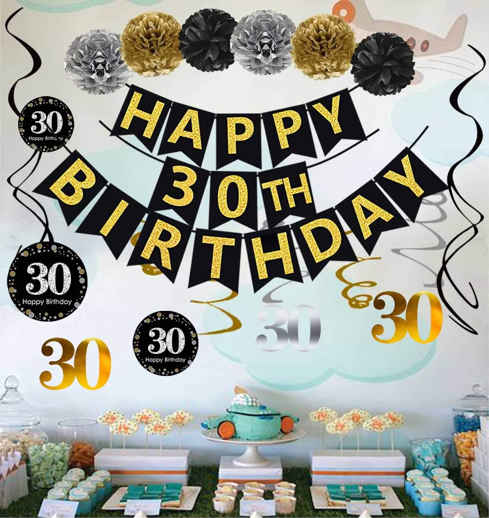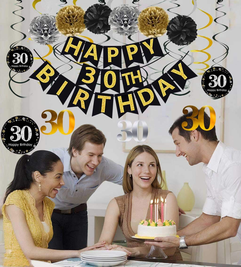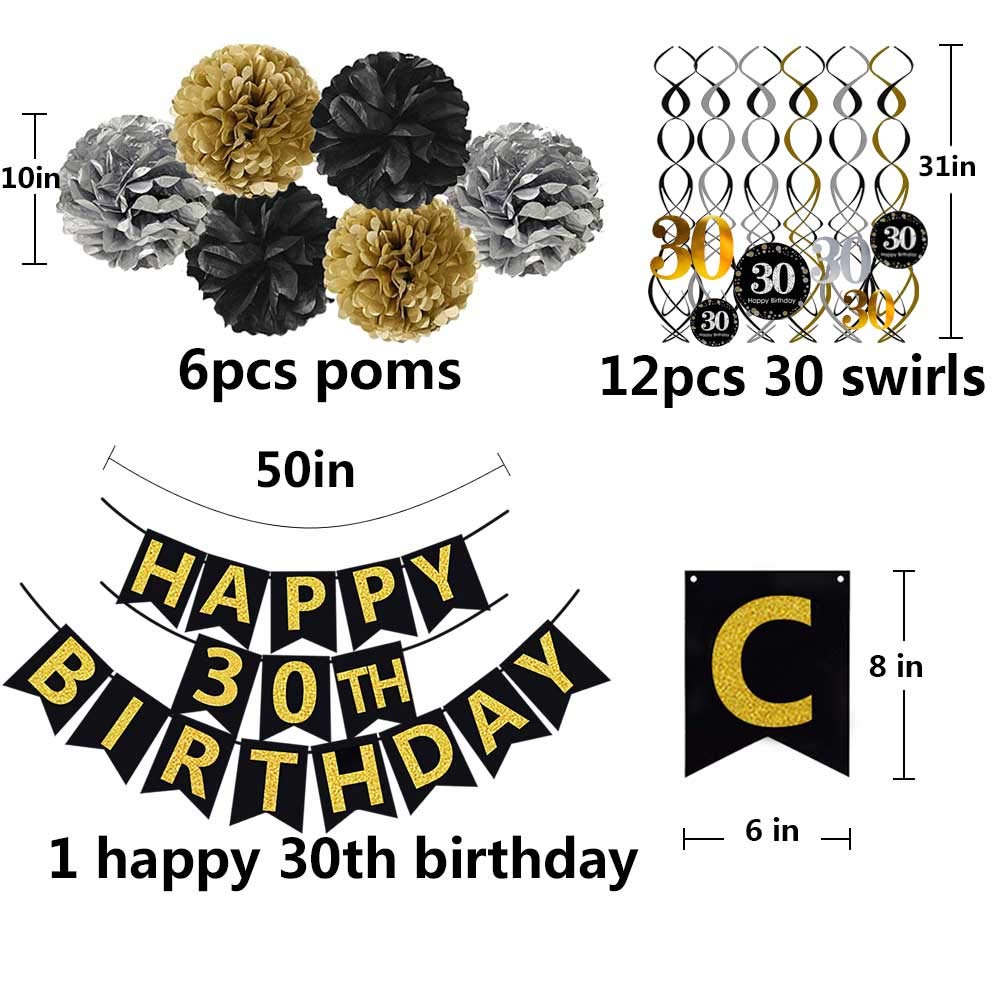 Package include: 1 x "HAPPY 30th BIRTHDAY" banner(NO DIY REQUIRE);12pcs Sparkling Celebration 30th Hanging Swirls;6 x paper cute pom poms per in 2 gold 2 black 2 silver