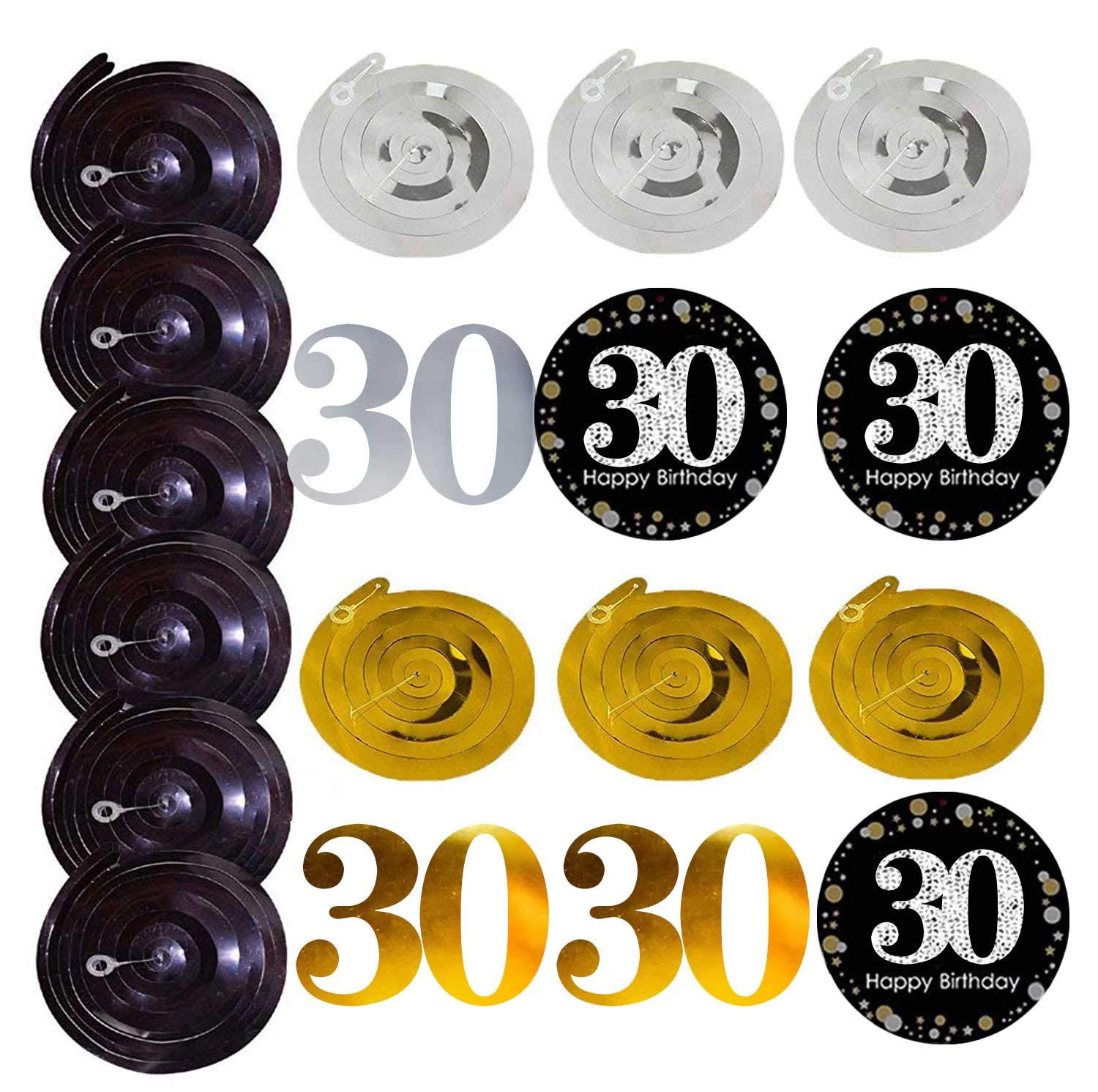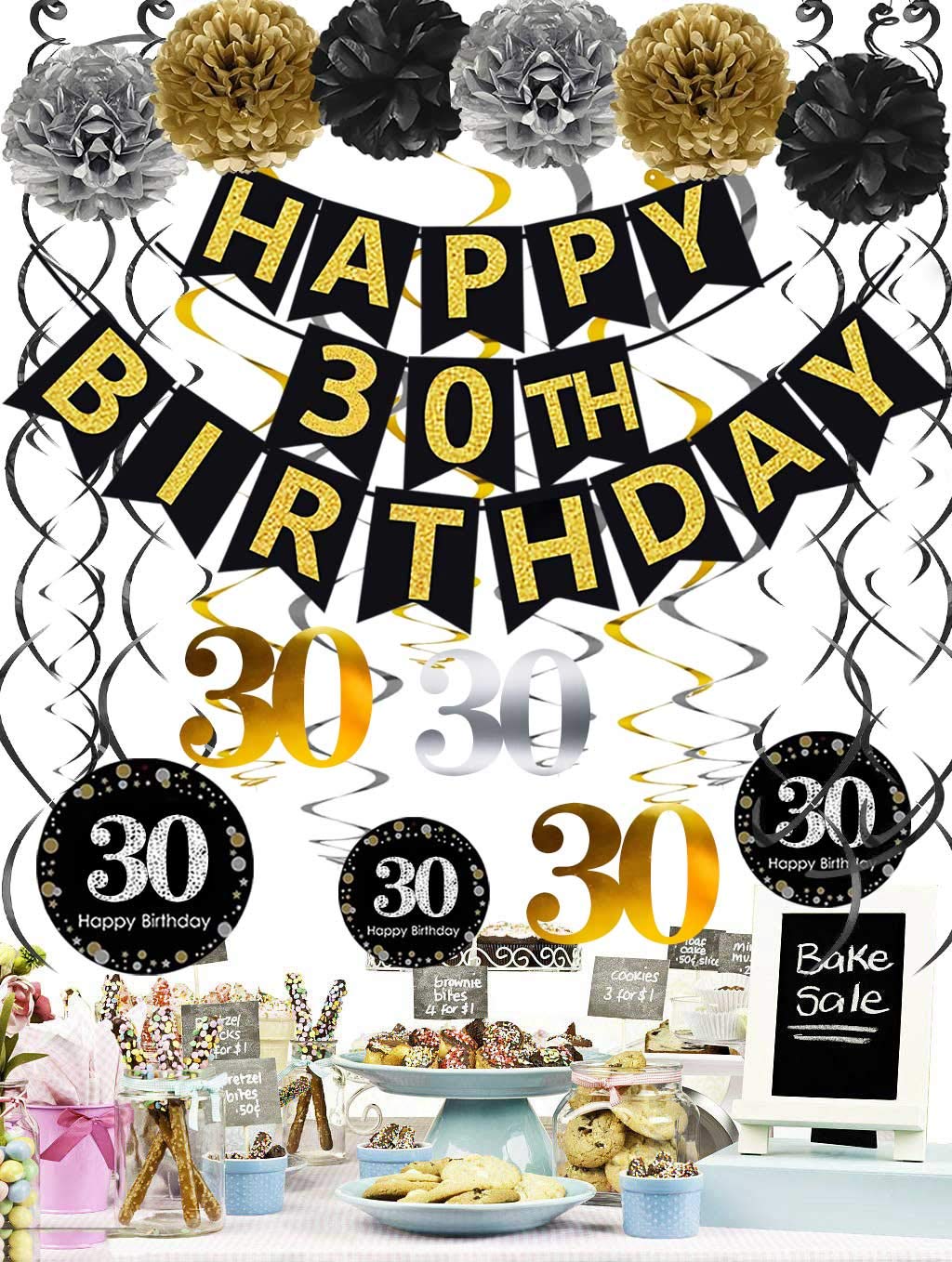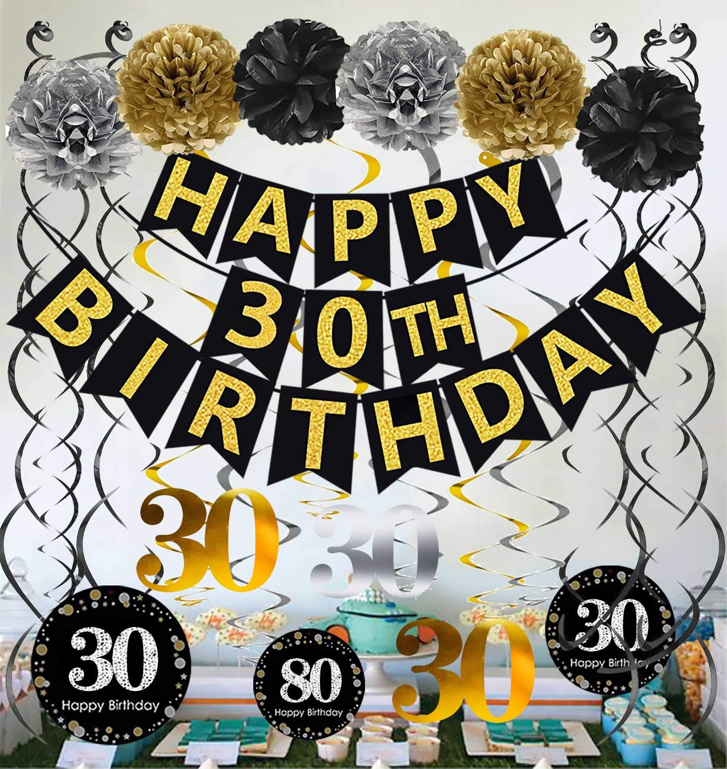 Package include: 1 x "HAPPY 30th BIRTHDAY" banner(NO DIY REQUIRE);12pcs Sparkling Celebration 30th Hanging Swirls;6 x paper cute pom poms per in 2 gold 2 black 2 silver