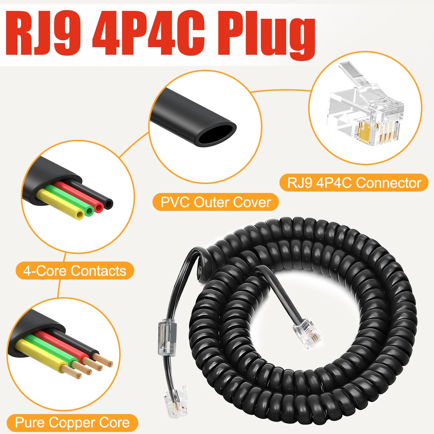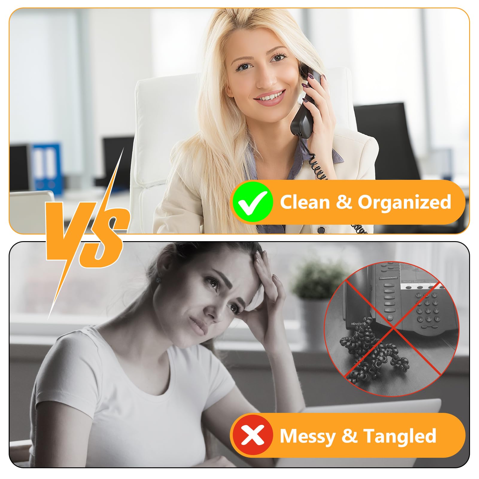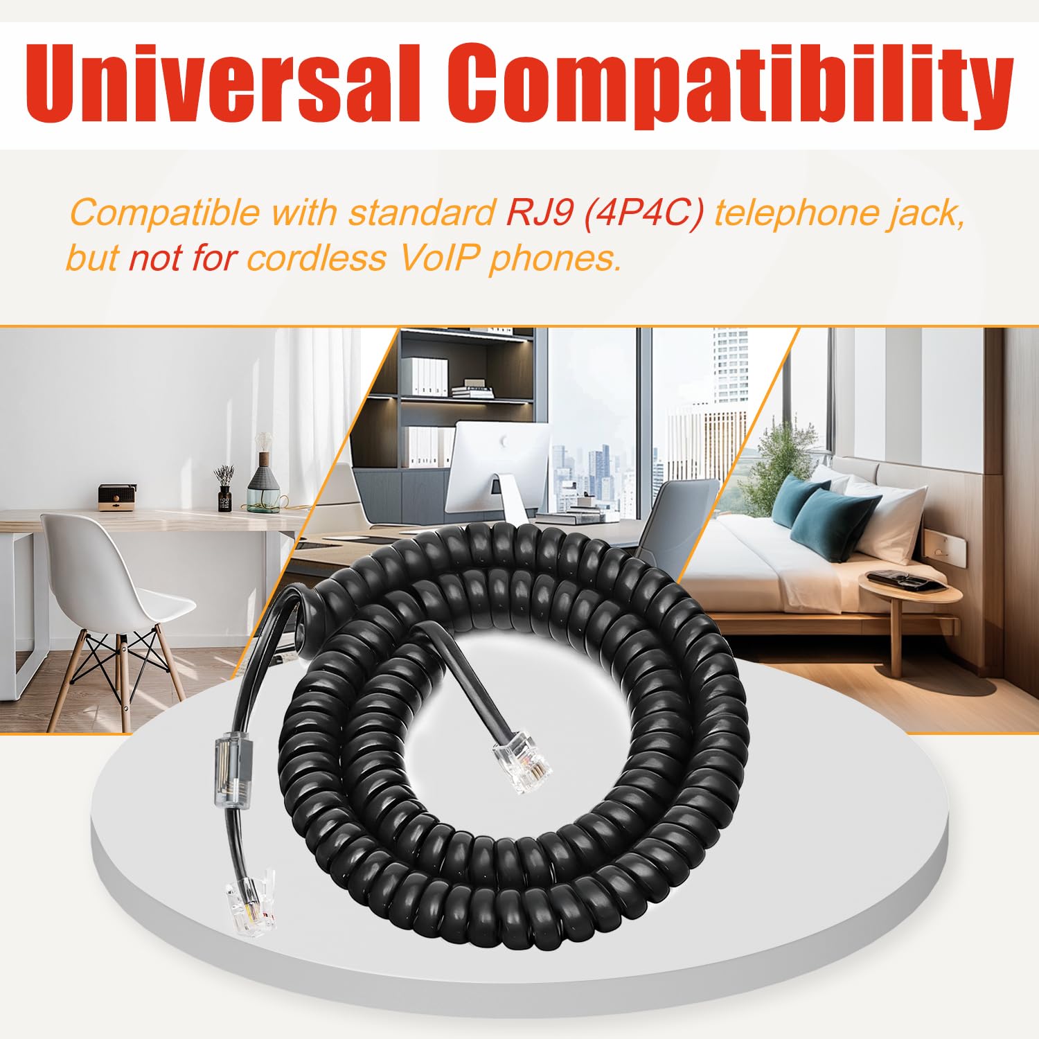 Handset Cords&Cord Detanglers: Uvital telephone cord detanglers applies to family or office fixed-line telephones which work with standard RJ9 (4P4C) coiled handset cord. But NOT suitable for CORDLESS VOIP phone and RJ45 modular plug