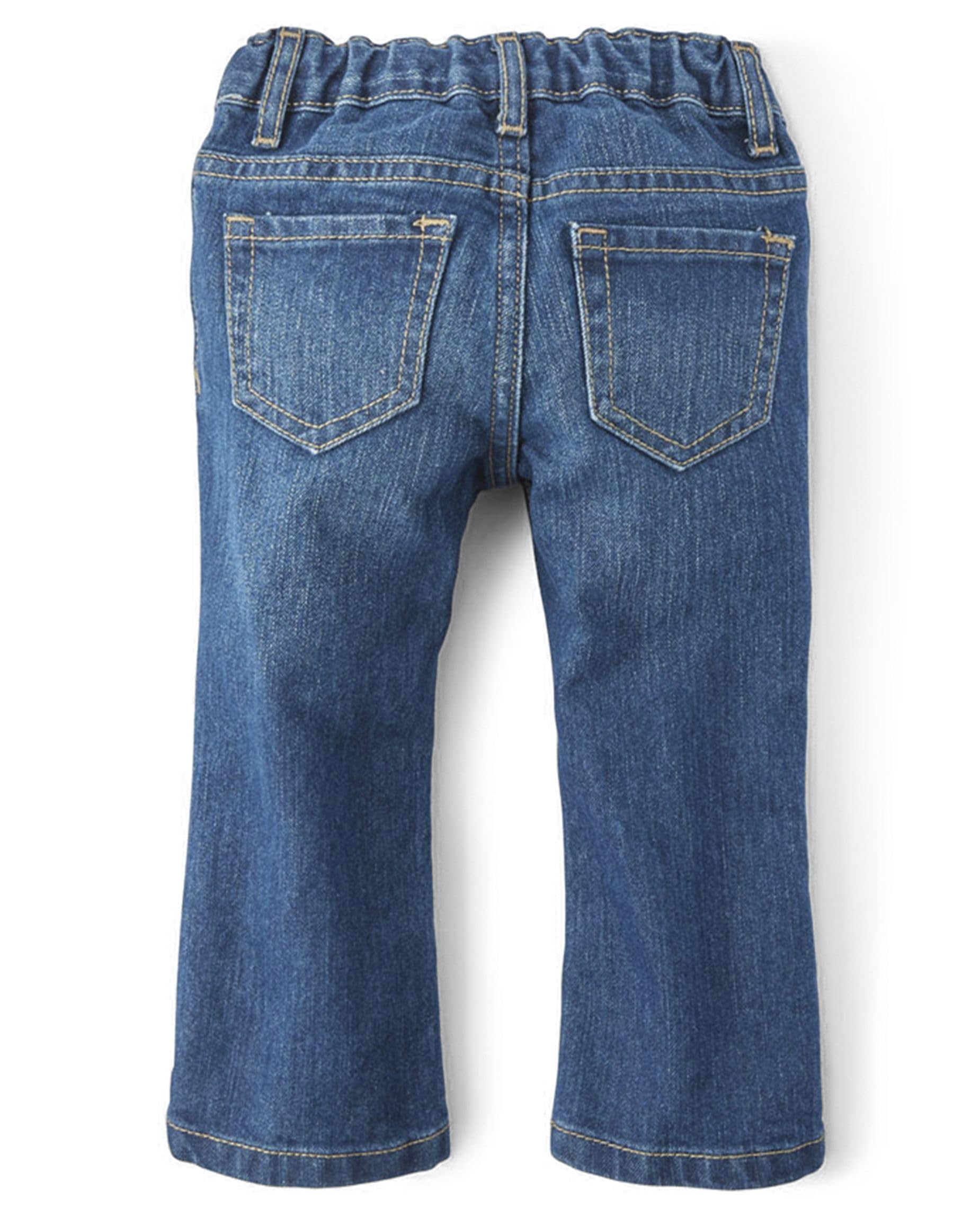 Classic bootcut design: Features a classic bootcut silhouette with a flare leg opening, 5-pocket styling, elasticized waist, inner adjustable tabs and snap closure with no-zip fly